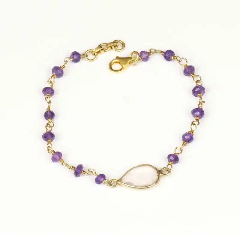 Ce bracelet en Argent 925 plaqué Or 18 carats se veut d’une finesse délicate avec ses Améthystes qui mettent en lumière le Quartz Rose en goutte.