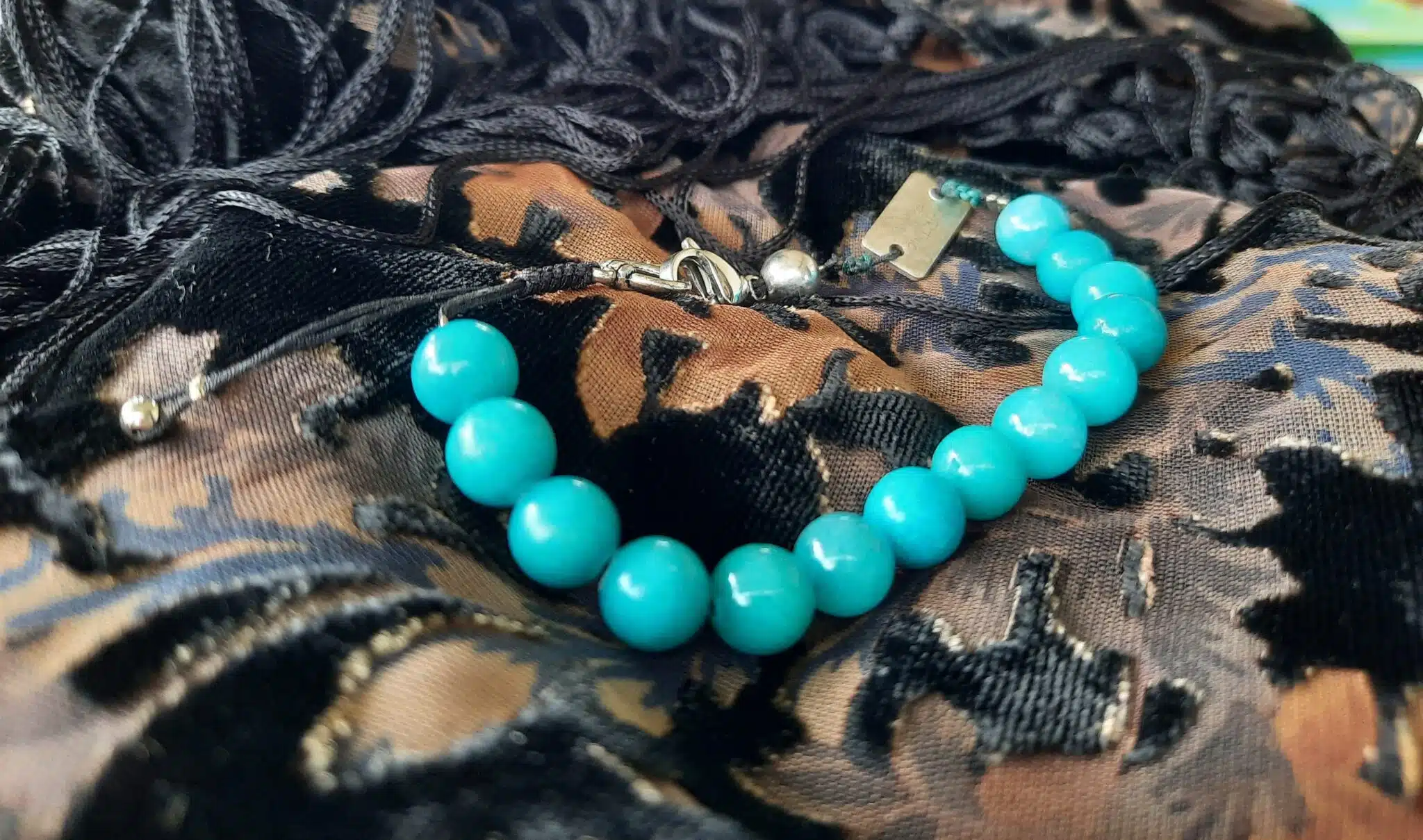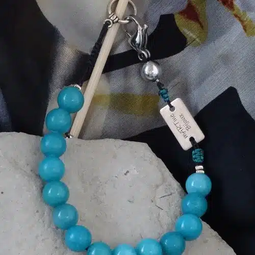 Bracelet homme, ajustable par lien coulissant, composé de 14 perles naturelles Agate bleue (8 mm), d’une perle en acier inoxydable et de la plaque “mARTine Bijoux”, monté sur double fil de soie très solide et fermeture par mousqueton.
