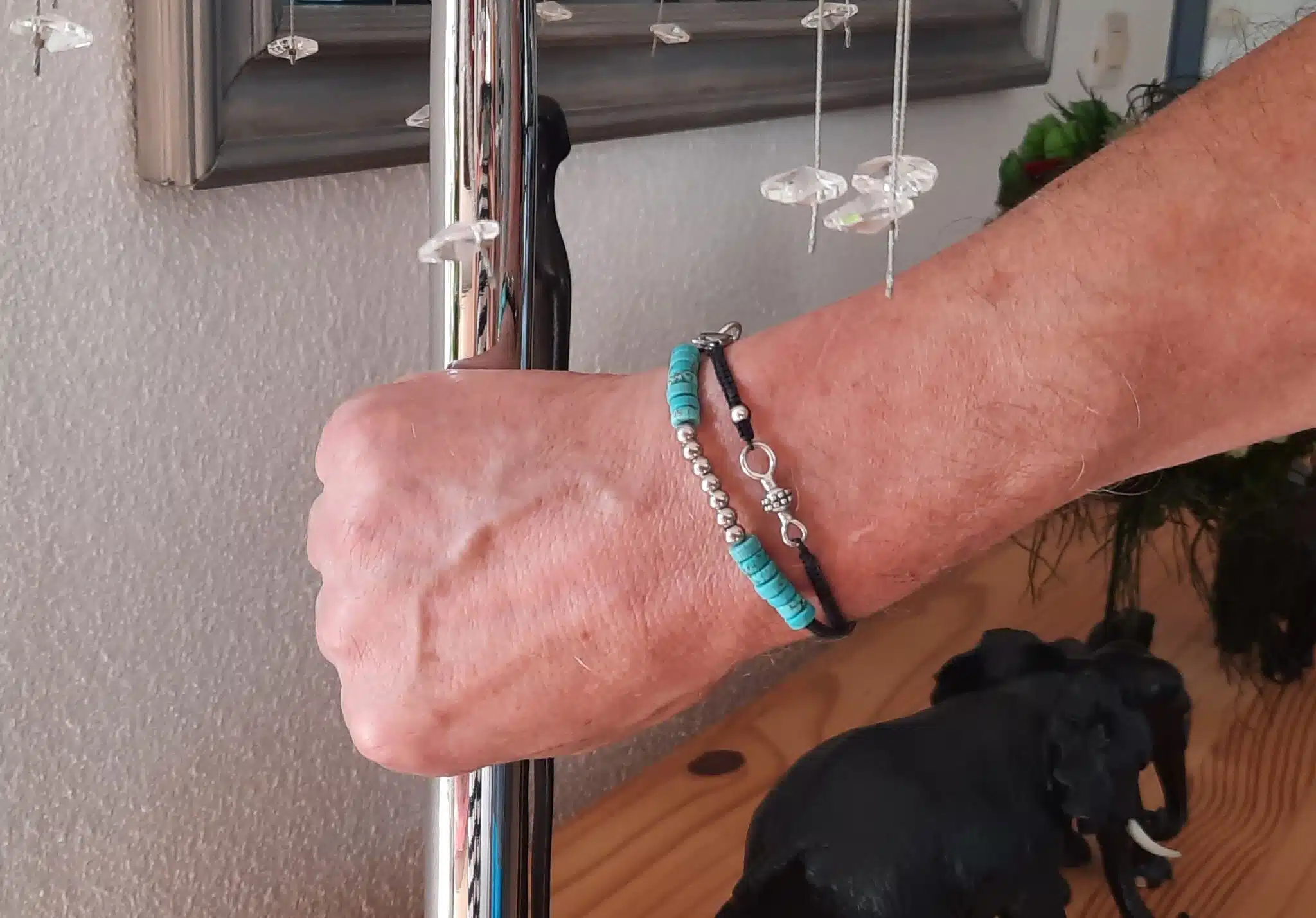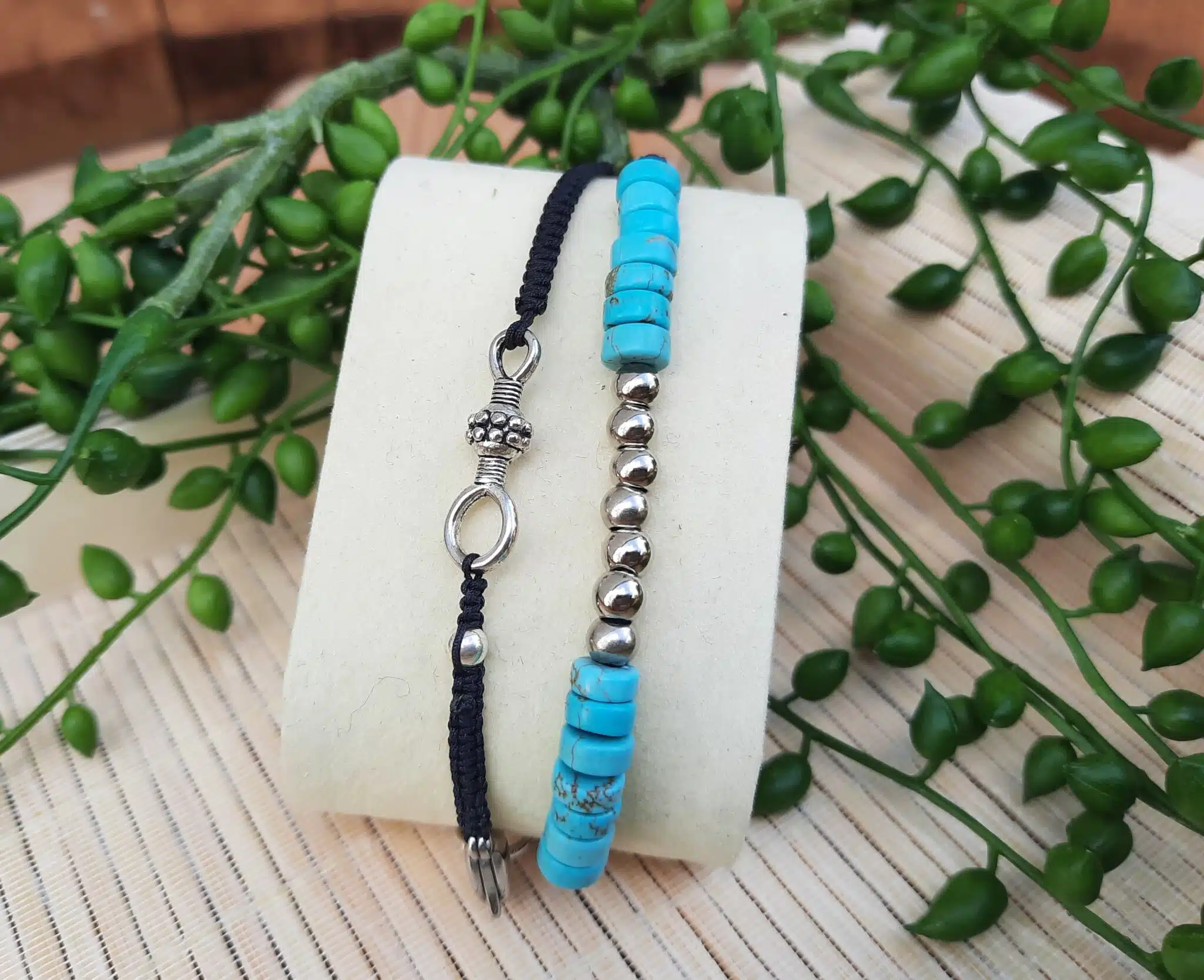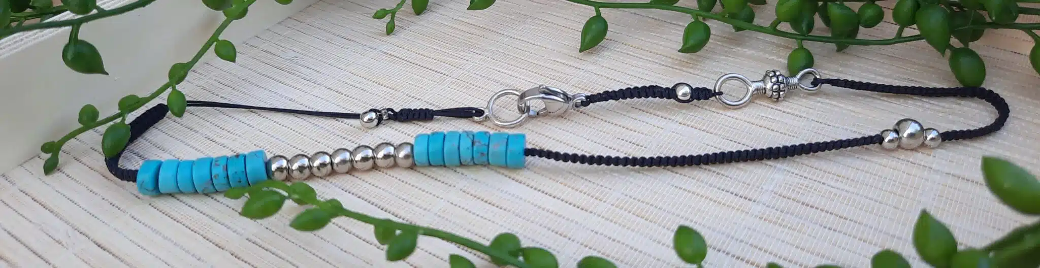 Sur deux cordons noirs tressés finement de mes mains, j’ai enfilé 14 perles rondelles de pierres naturelles Turquoise, accompagnées de perles rondes en acier. J’y ai ajouté quelques apprêts en métal, pour harmoniser l’ensemble.