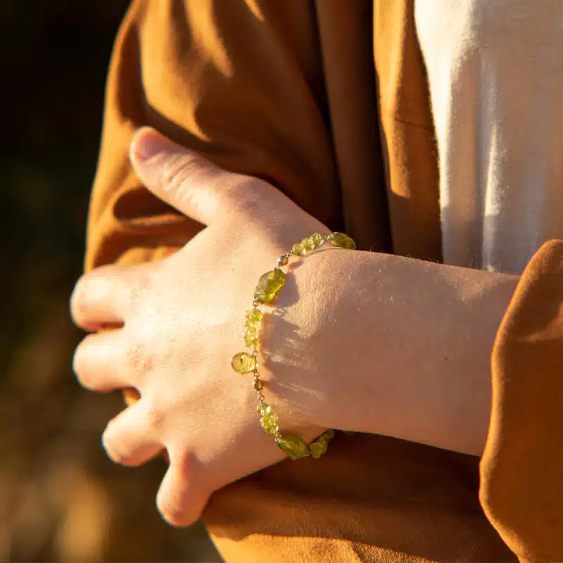 Comme son nom l’indique, le Péridot est la pierre maîtresse qui inspire pour le créateur de bijoux le Printemps. Déclinés sous différentes formes et tailles, servant à ponctuer le rythme du printemps et de l’apparition des bourgeons, le bracelet est ponctué de 4 imposants Péridots, de 3 en goutte qui sont mis en avant par 3 séries de 3 Péridots fins et 2 séries de 5.