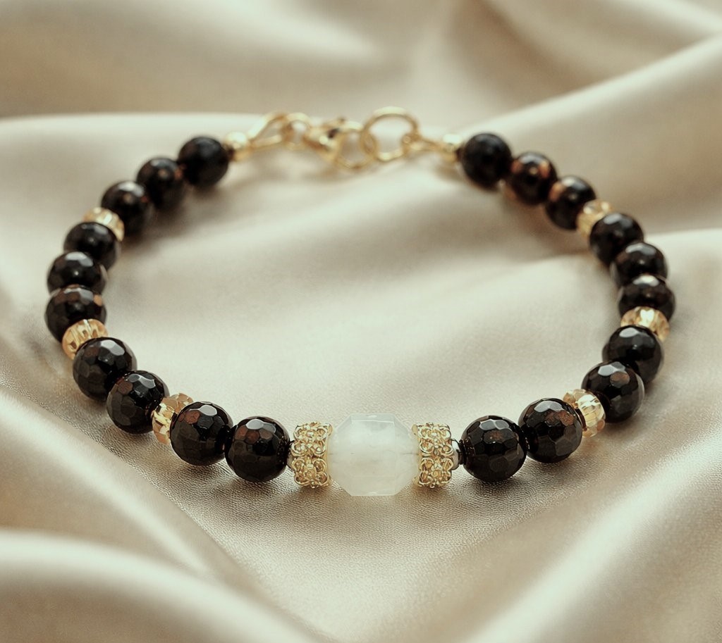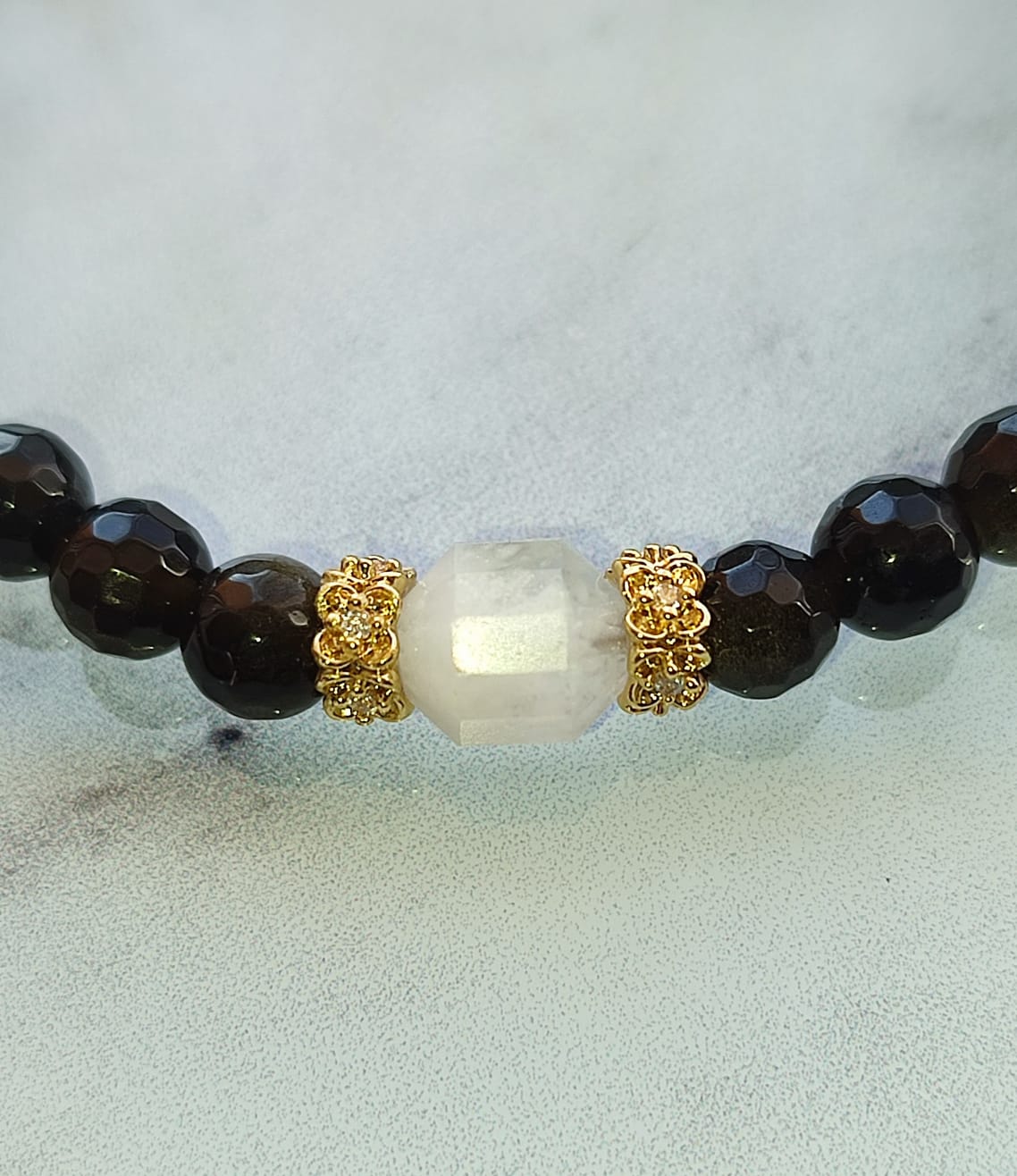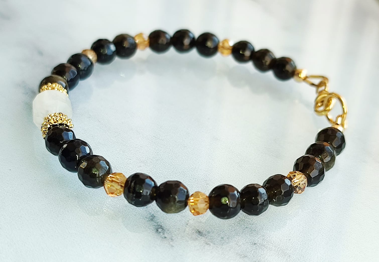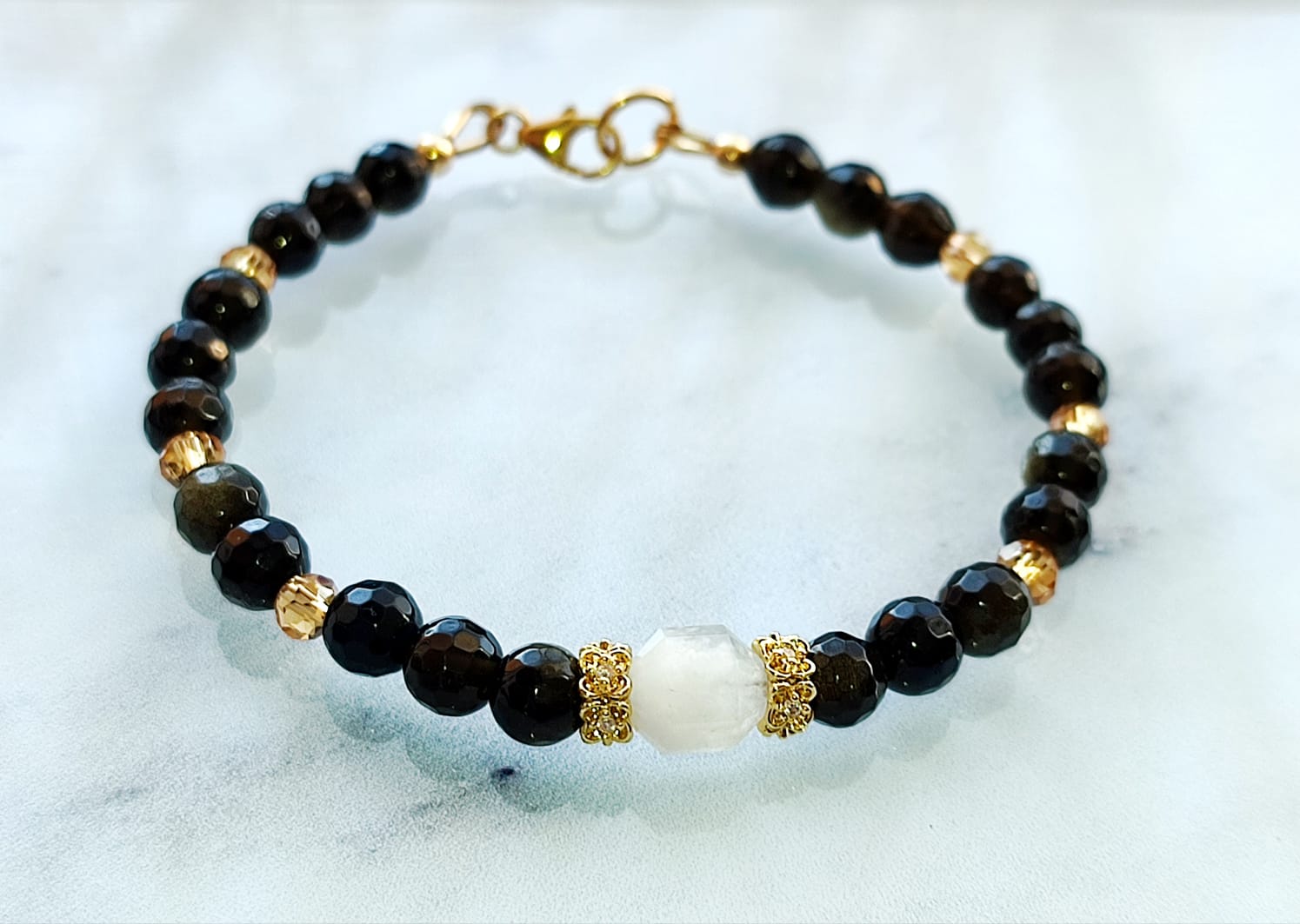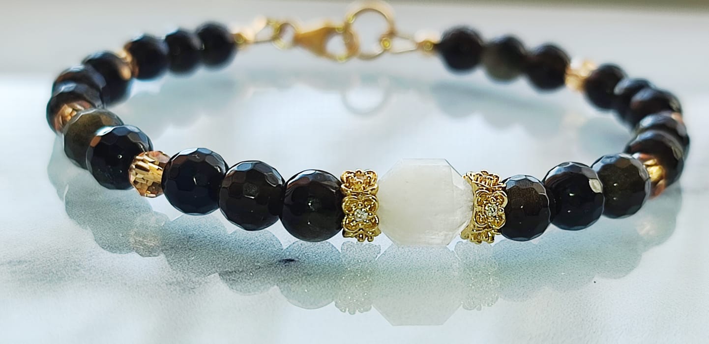 Ce bracelet raffiné associe la profondeur de l’obsidienne dorée facettée à la douceur lumineuse d’une pierre de lune centrale. Sublimé par des intercalaires dorés et des perles en cristal, ce bijou allie élégance, féminité et puissance énergétique.