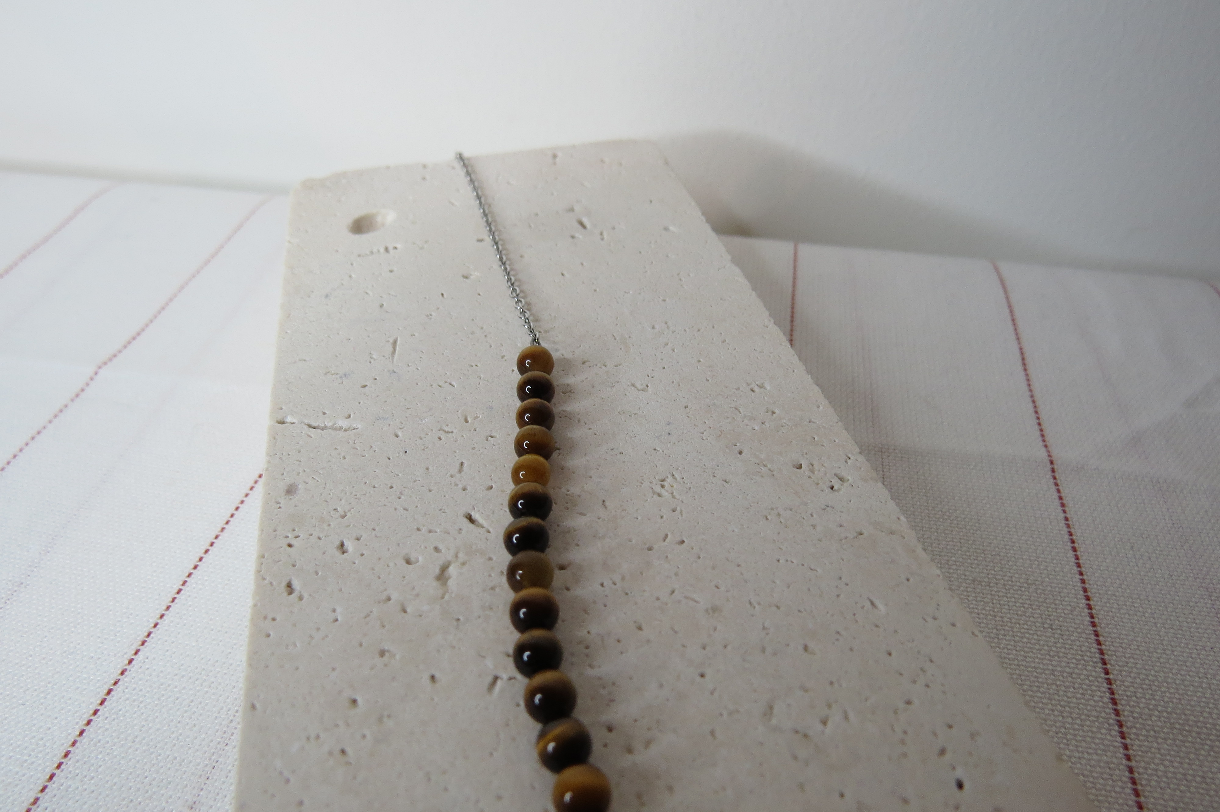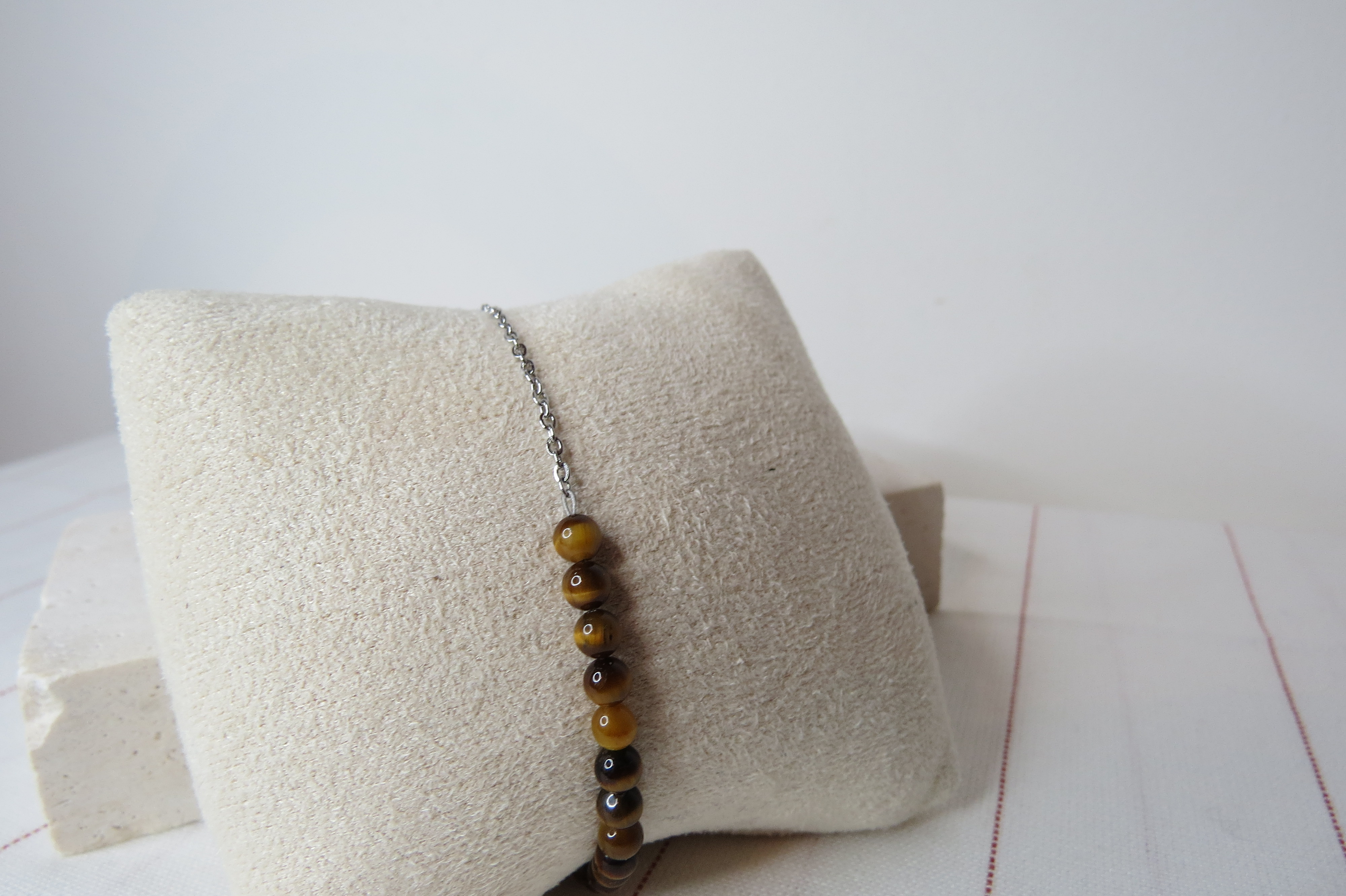 Découvrez ce bracelet composé de pierres d’œil de tigre, et de sa chaîne en acier inoxydable.