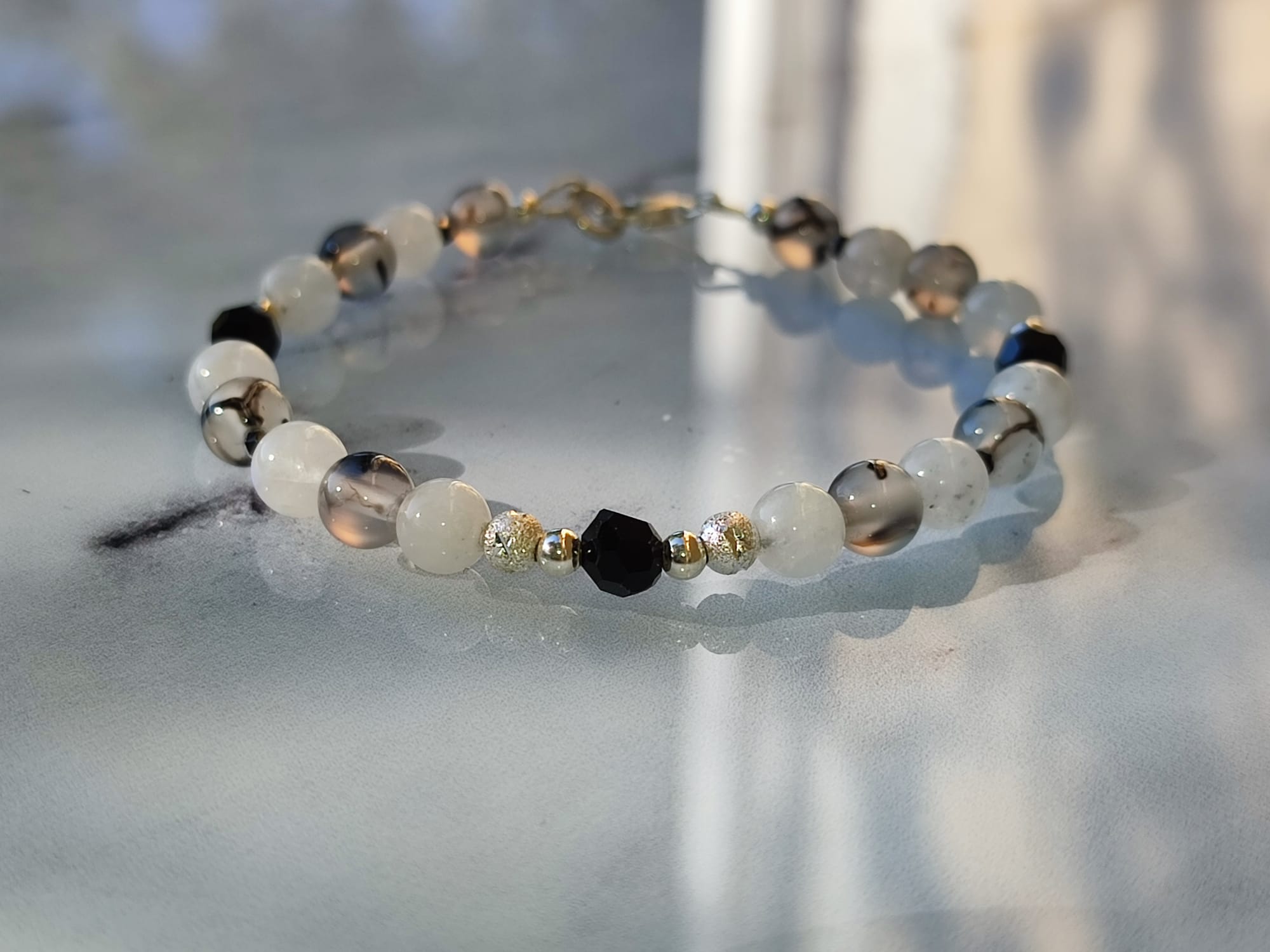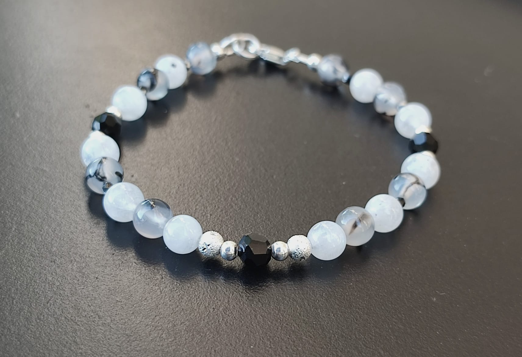Ce bracelet raffiné associe des pierres naturelles de qualité AA : Pierre de Lune aux reflets nacrés et doux, Agate Veine de Dragon aux nuances marbrées fascinantes, Perles de cristal noir pour une touche d’élégance et de Perles ciselées et apprêts en Argent 925 véritable.