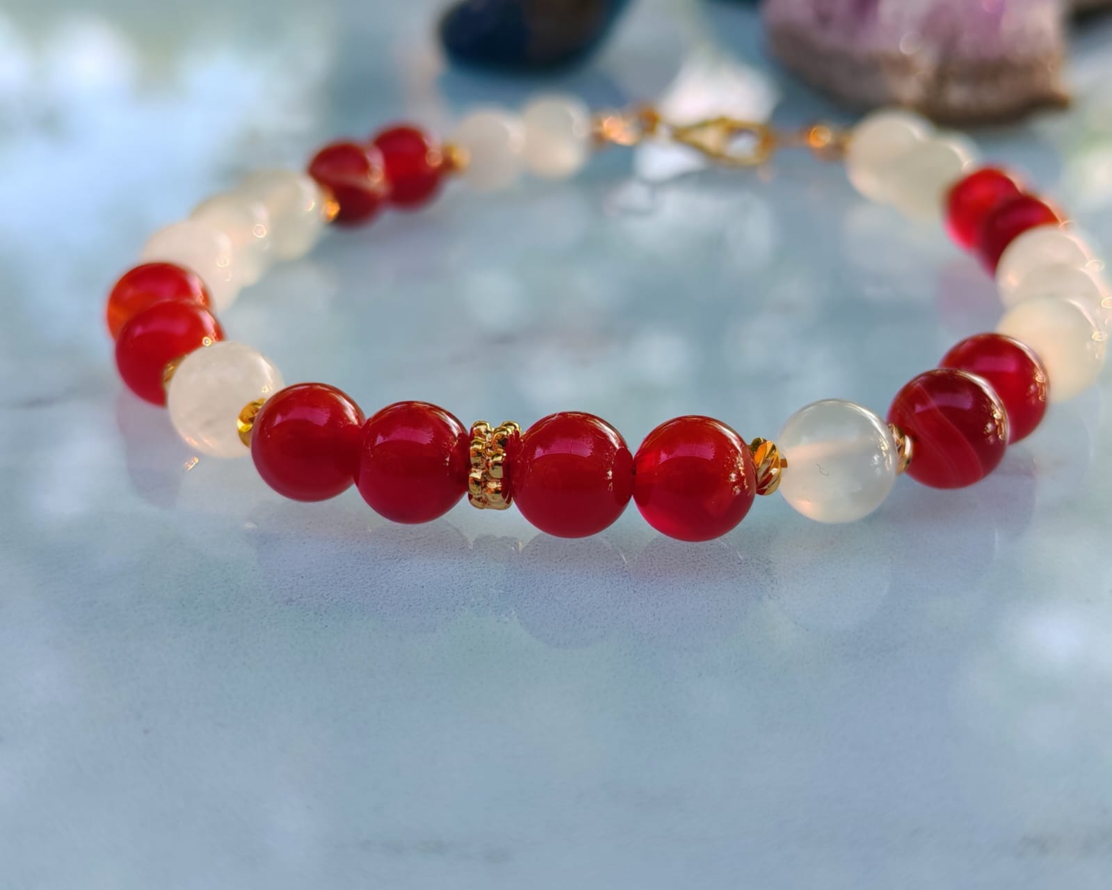 Offrez-vous ou à un proche ce bracelet fait main en pierres naturelles, alliant la douceur intuitive de la Pierre de Lune à l’énergie rayonnante de la Cornaline. Un bijou élégant et symbolique, parfait pour un cadeau ou pour soi.