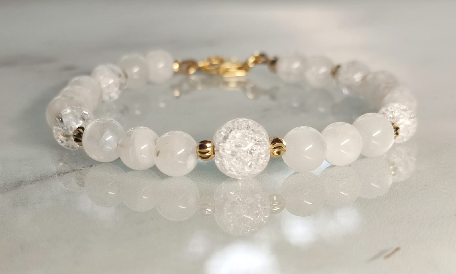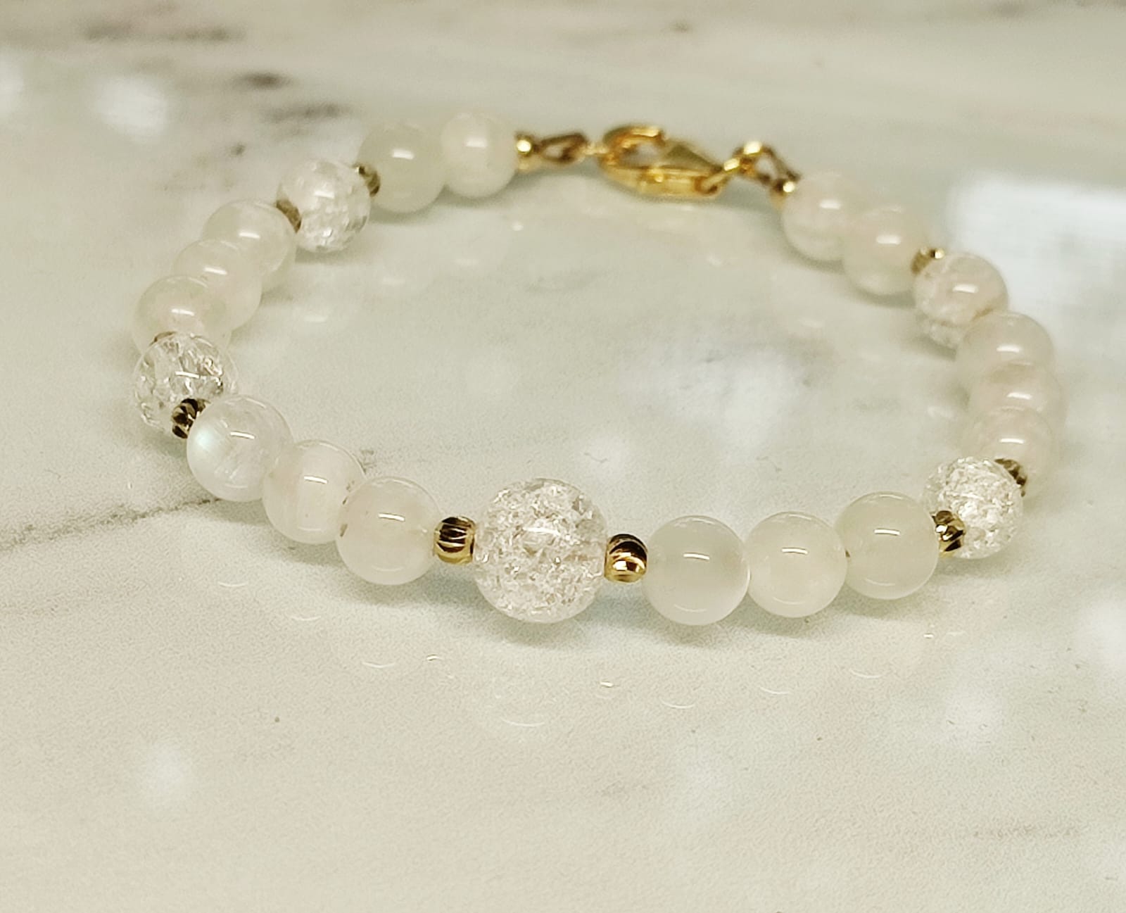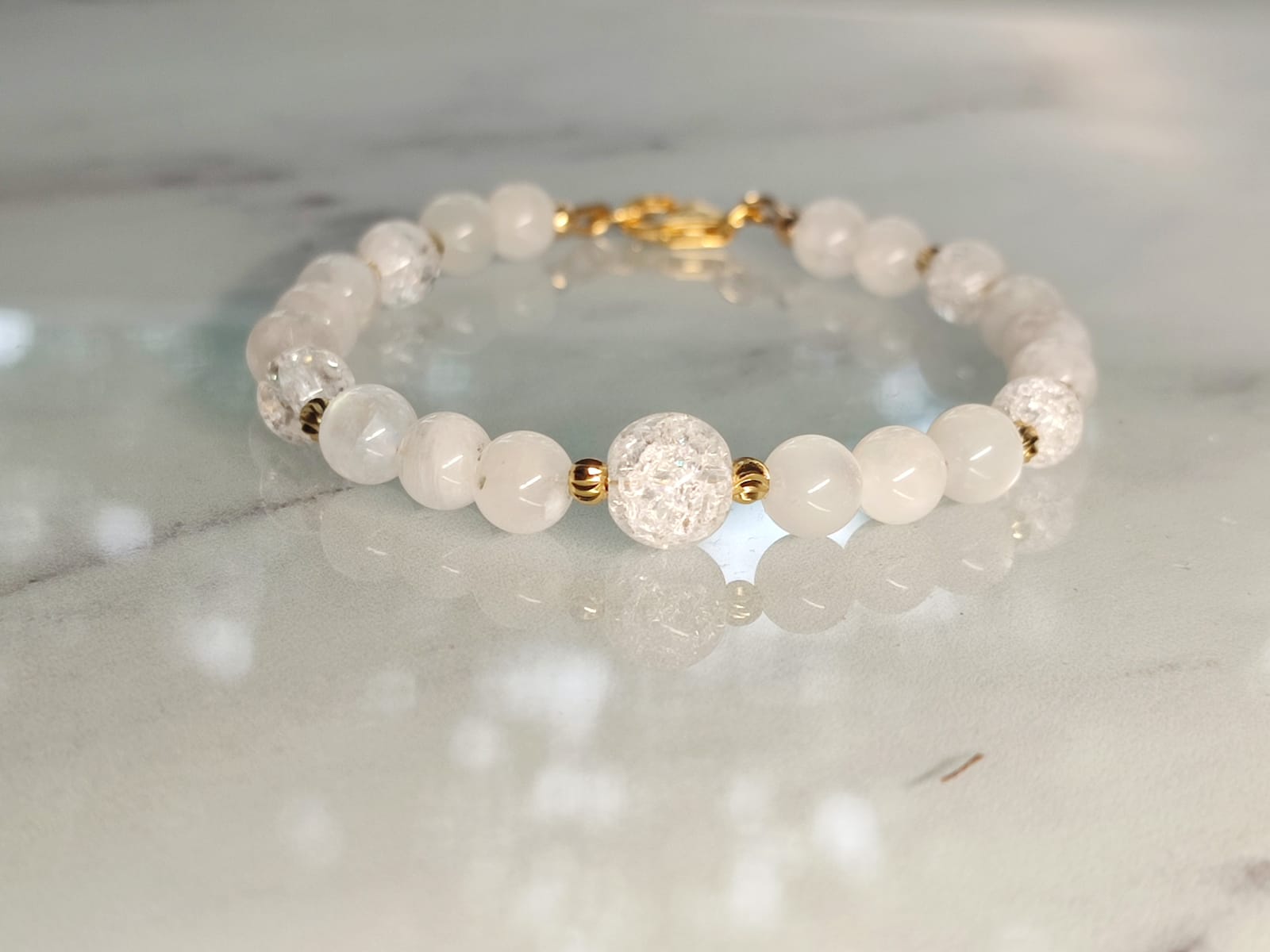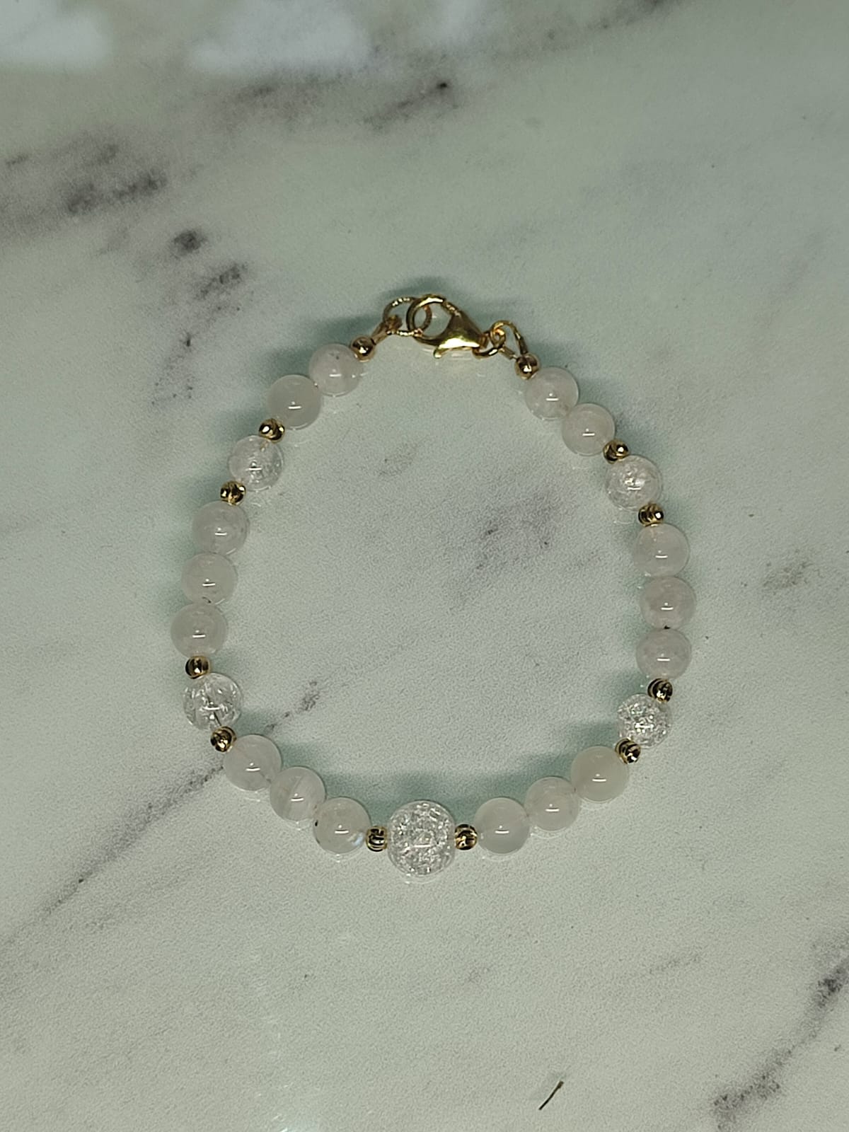 Bracelet délicat en pierre de lune et cristal de roche craquelé, rehausse de finitions en or gold filled 14k pour une élégance moderne et lumineuse. Parfait en idée cadeau ou pour se faire plaisir.