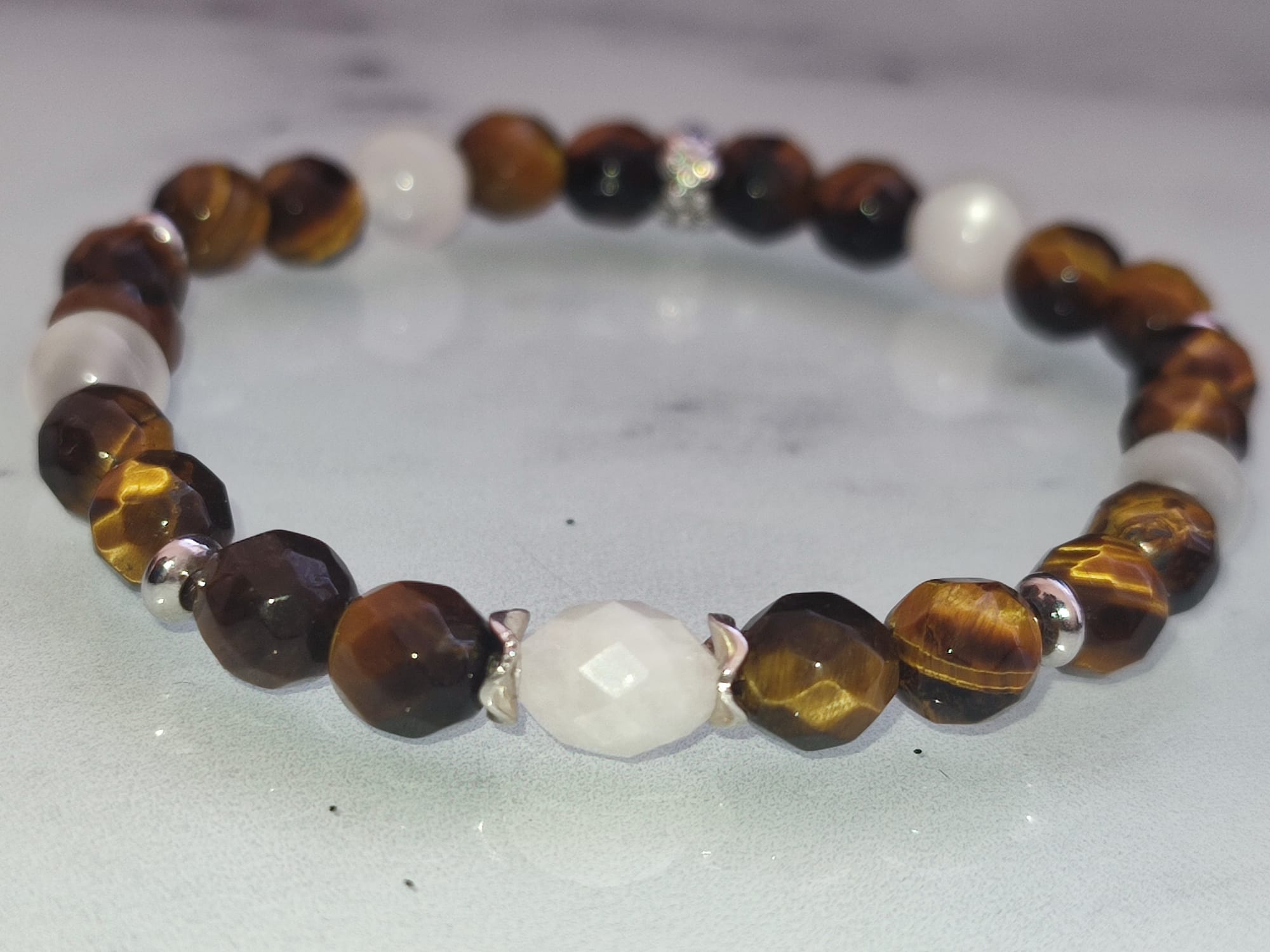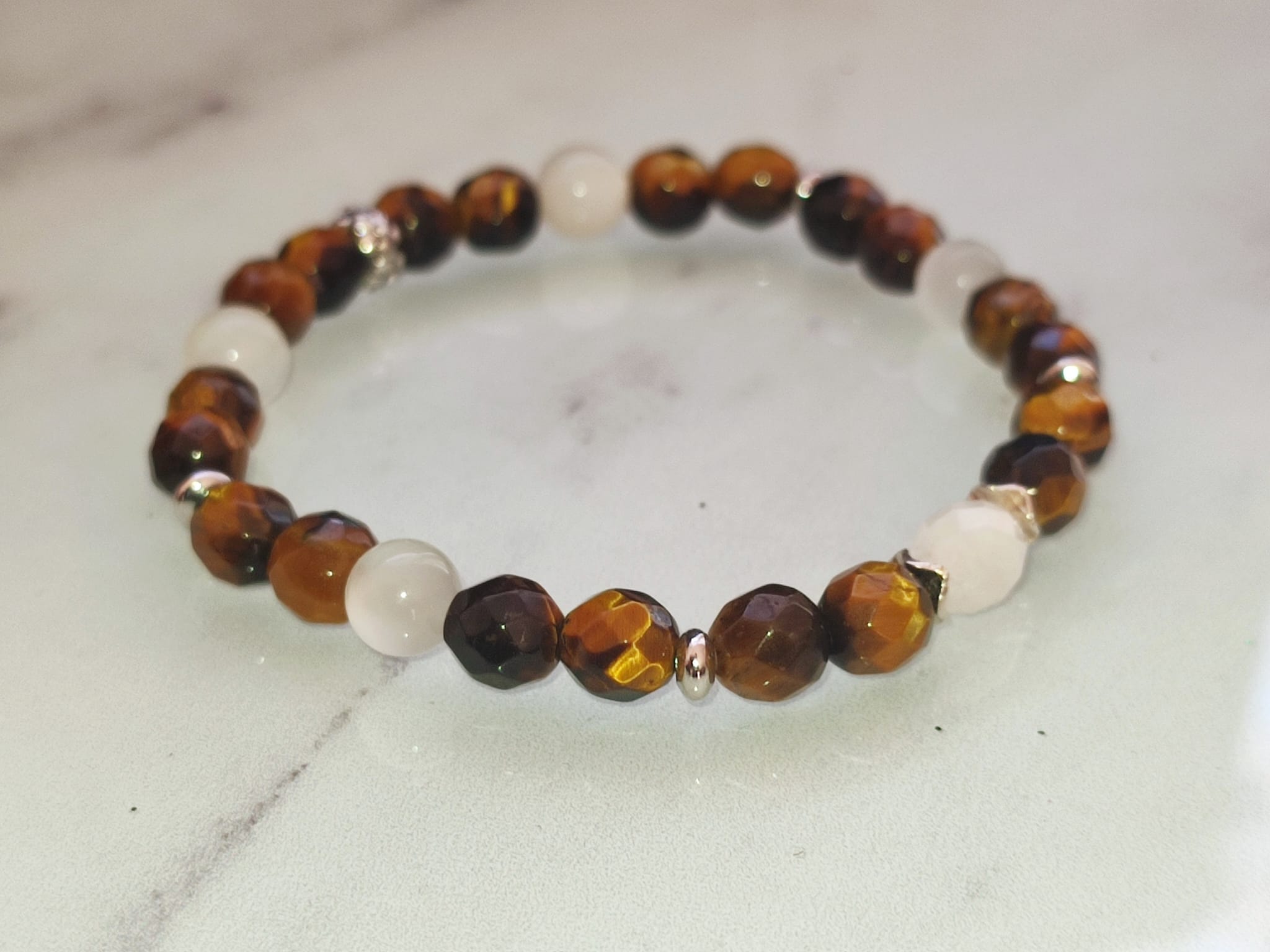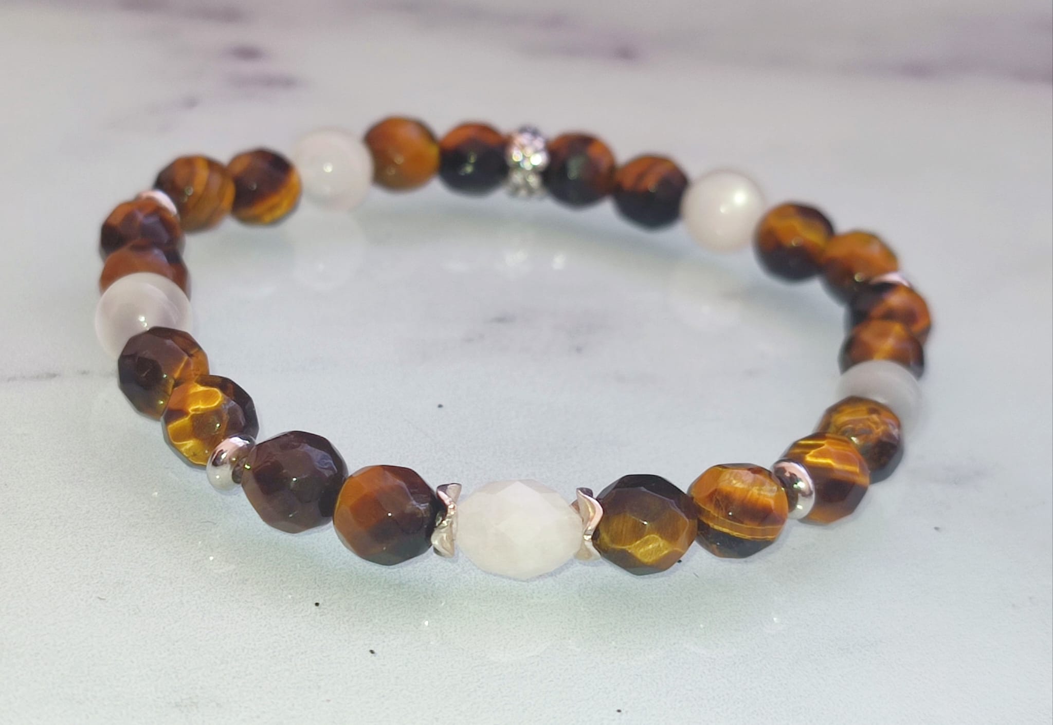 Bracelet Pierre de lune Œil de tigre argent élastique, Un bracelet élégant et symbolique alliant la douceur intuitive de la pierre de lune à la force protectrice de l’œil de tigre facetté. Un bijou lumineux, équilibré et raffiné, idéal pour accompagner le quotidien ou offrir un cadeau plein de sens.