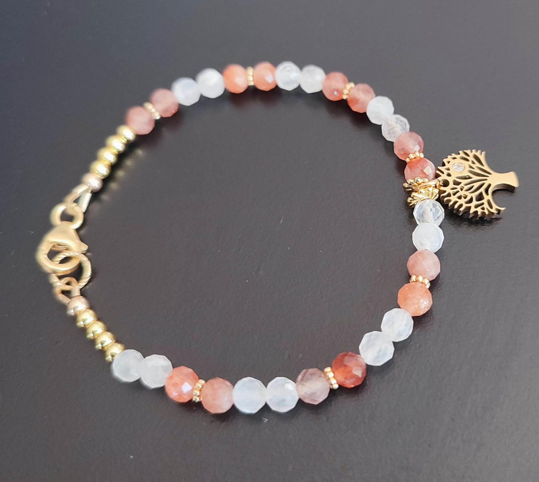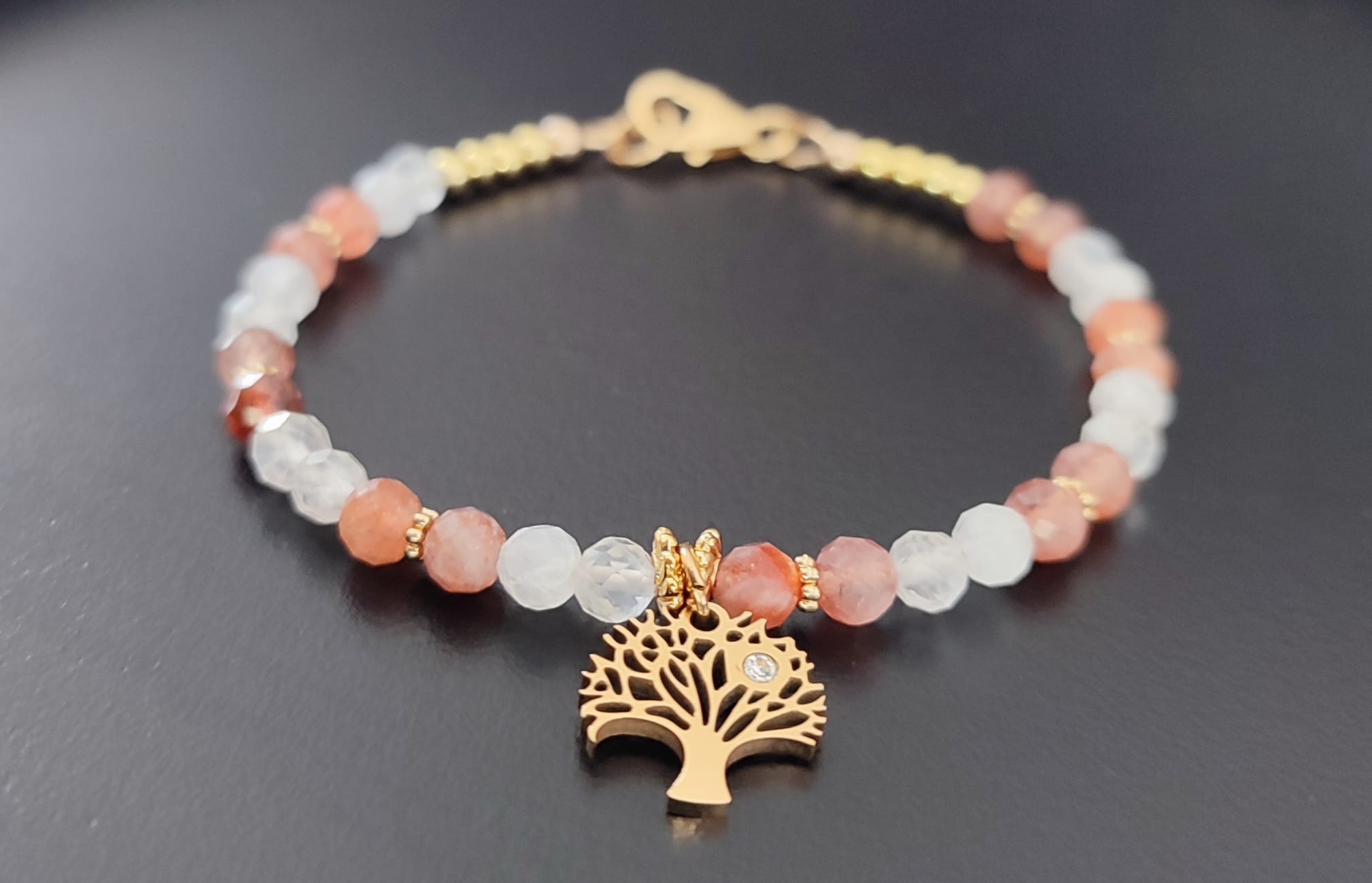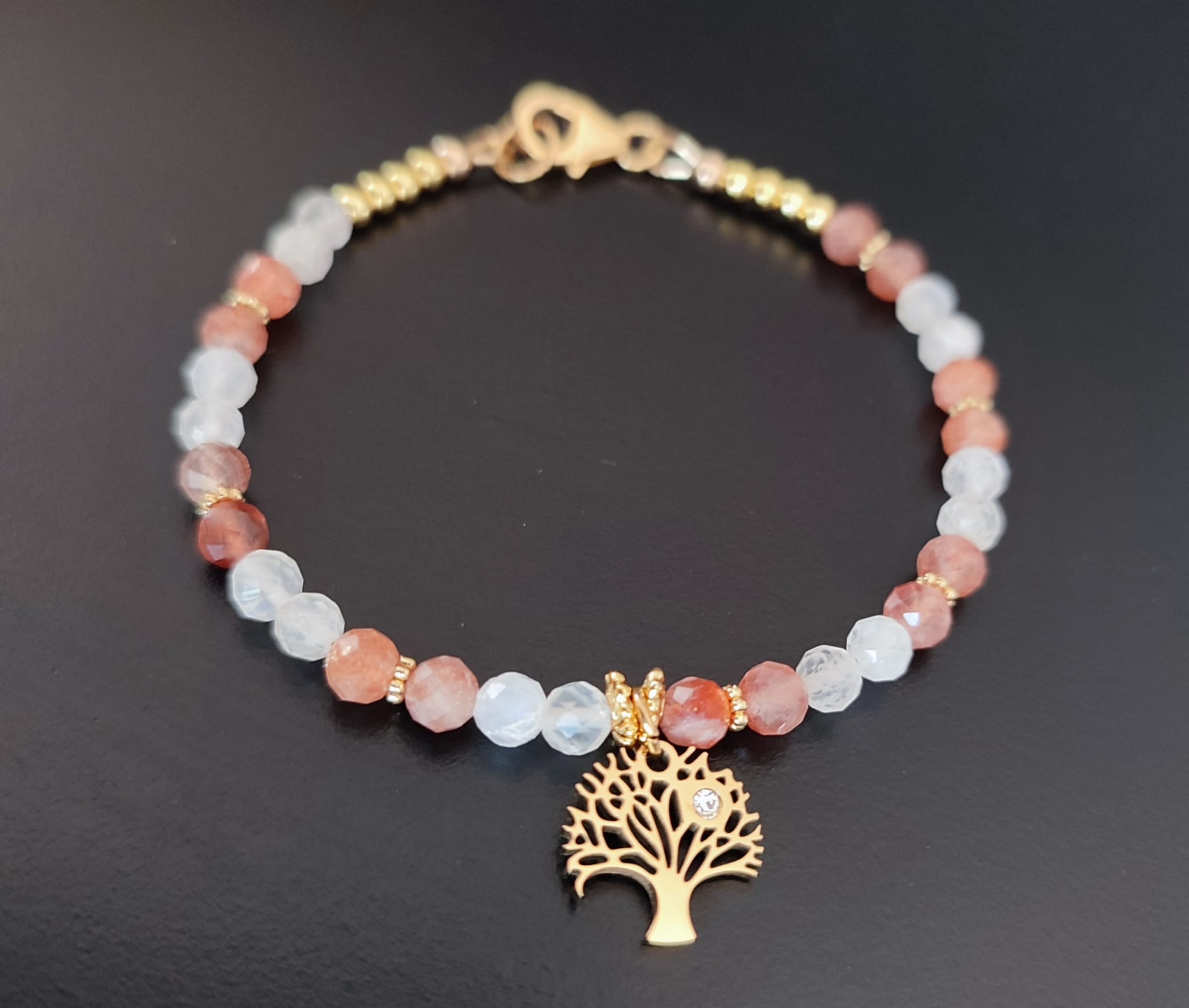 Bracelet Pierre du Soleil et Pierre de Lune – Breloque Arbre de Vie en plaqué or 18 k et montage en Gold Filled 14k