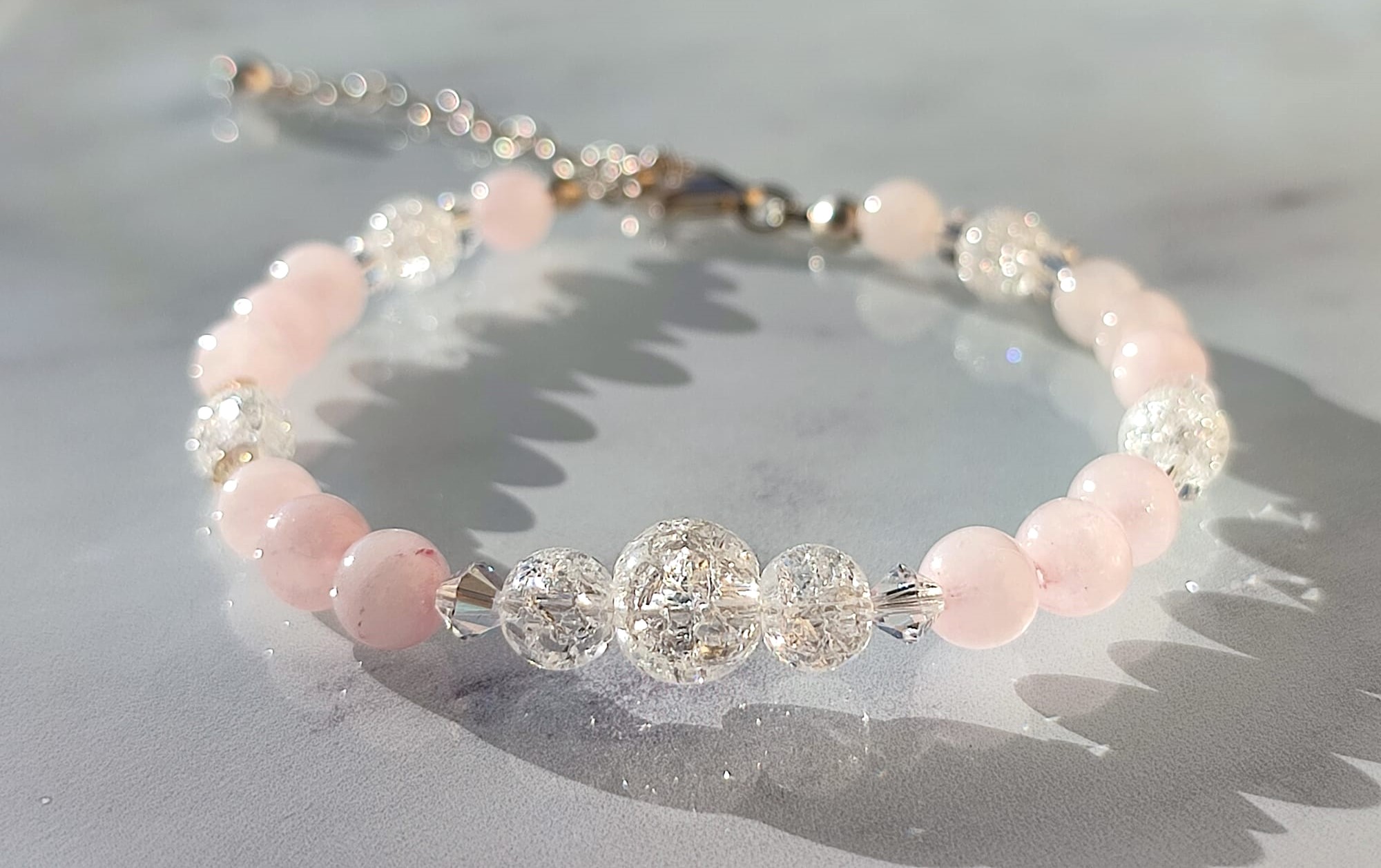 Bracelet composé de Quartz Rose, de cristal de roche craquelé (6 et 8 mm) et de perles en Argent 925.