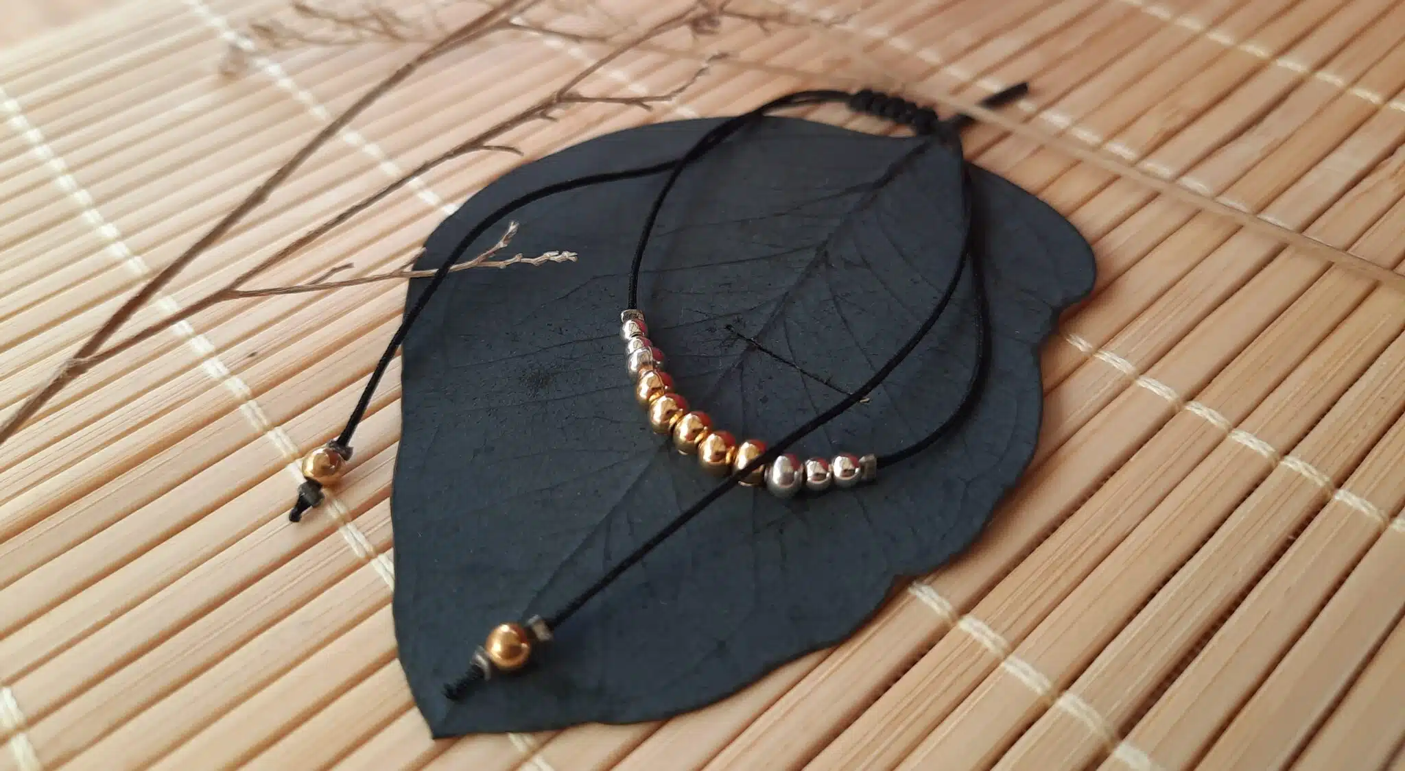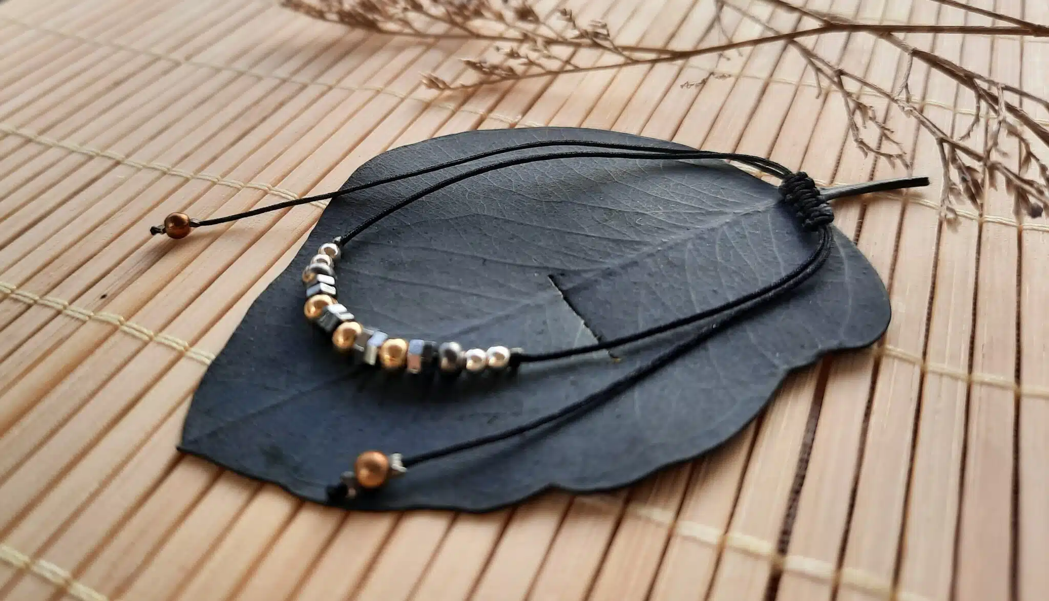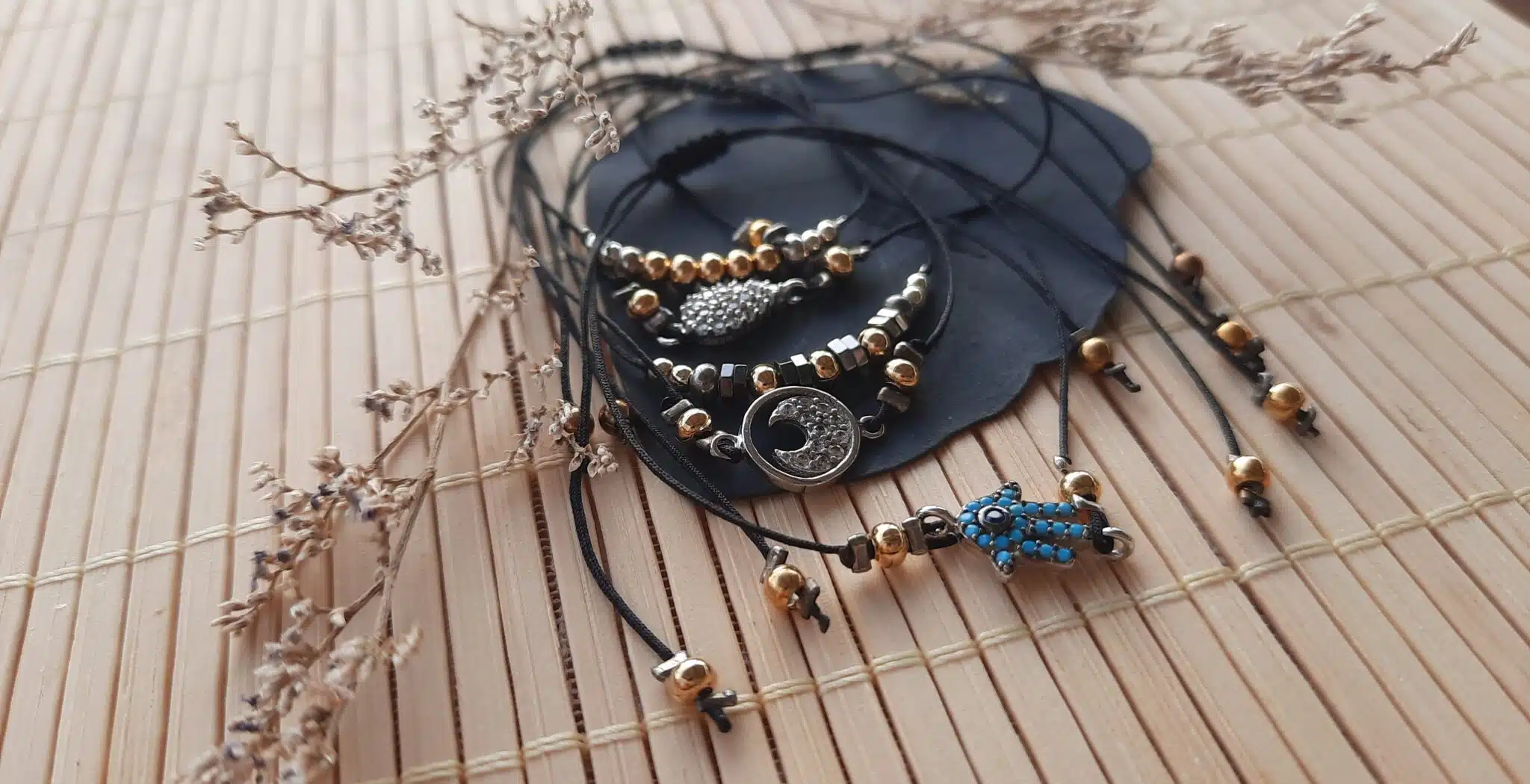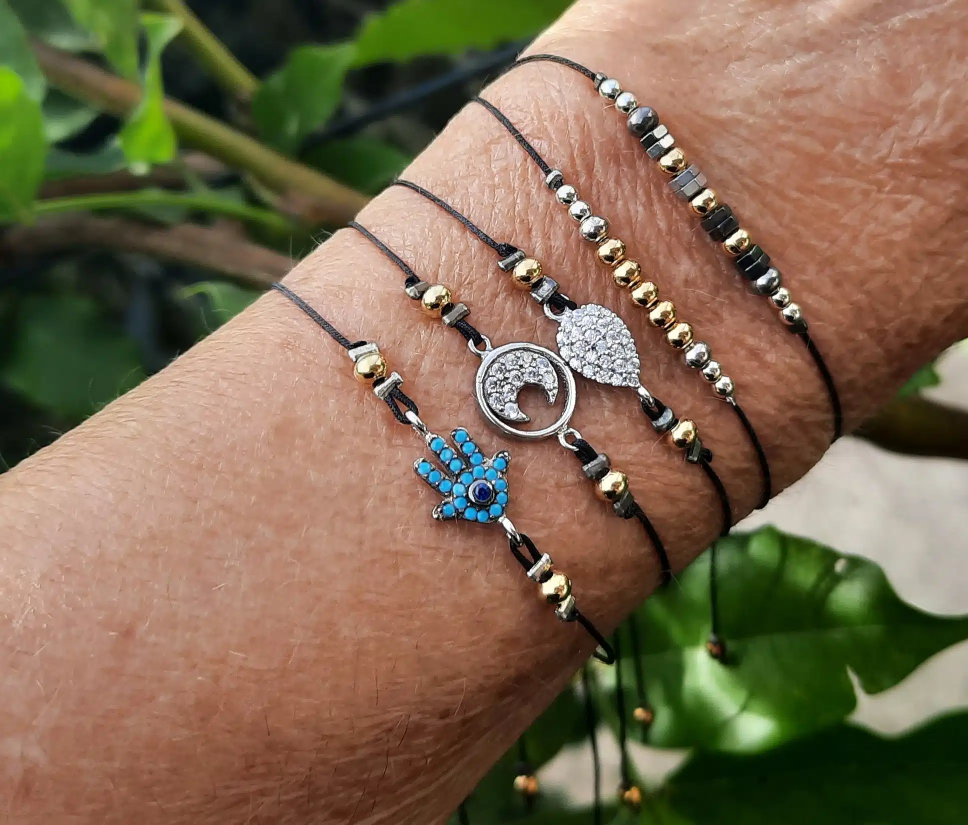 Vous avez le choix entre ces cinq jolis bracelets, montés sur fil de nylon tressé 0,8 mm, ajustables grâce à leur lien coulissant, agrémentés de perles plaqué or, pour une finition soignée.
