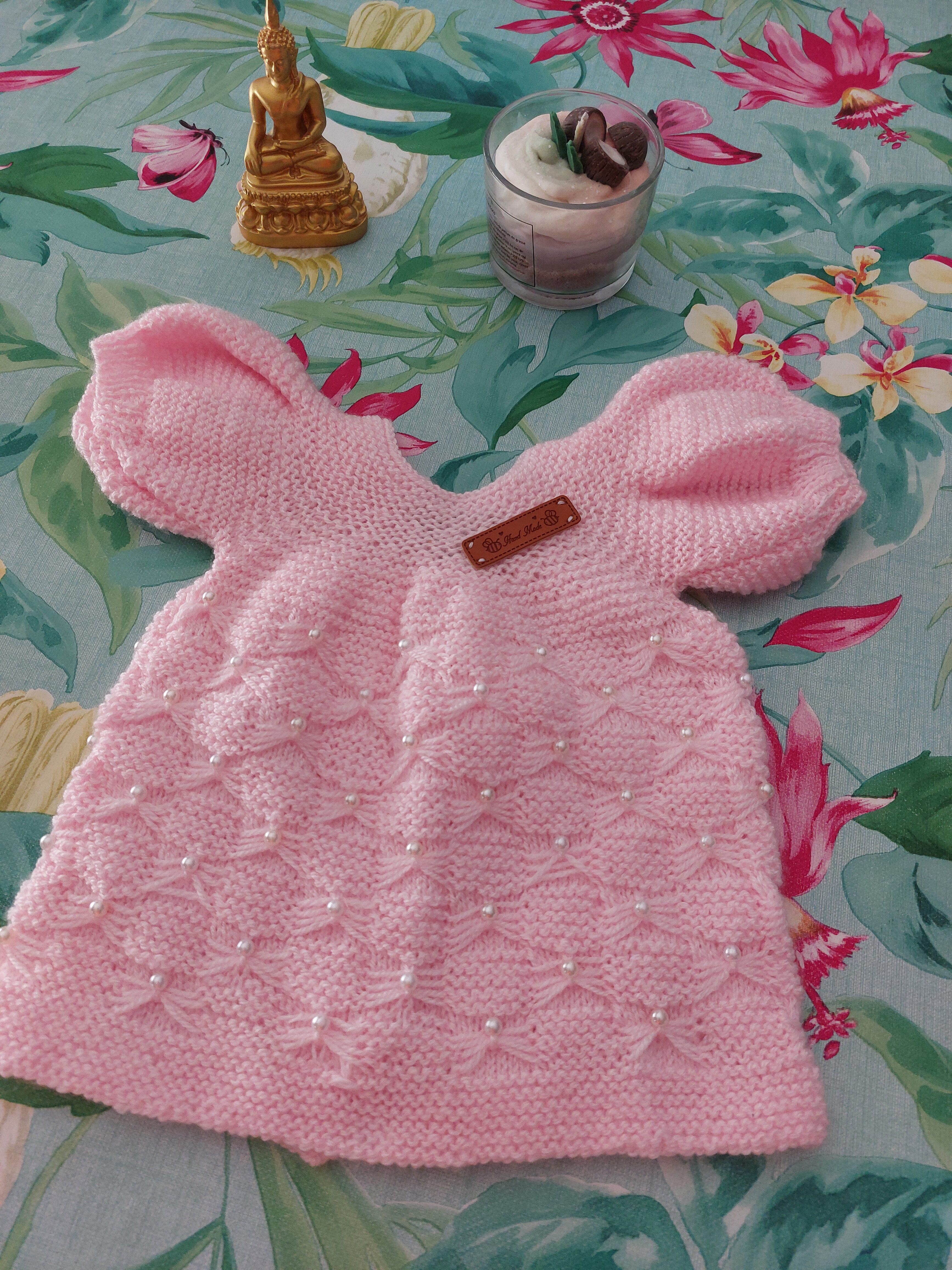 tricotée aux aiguilles dans un joli point fantaisie, laine très douce, avec perles incrustées dans le motif