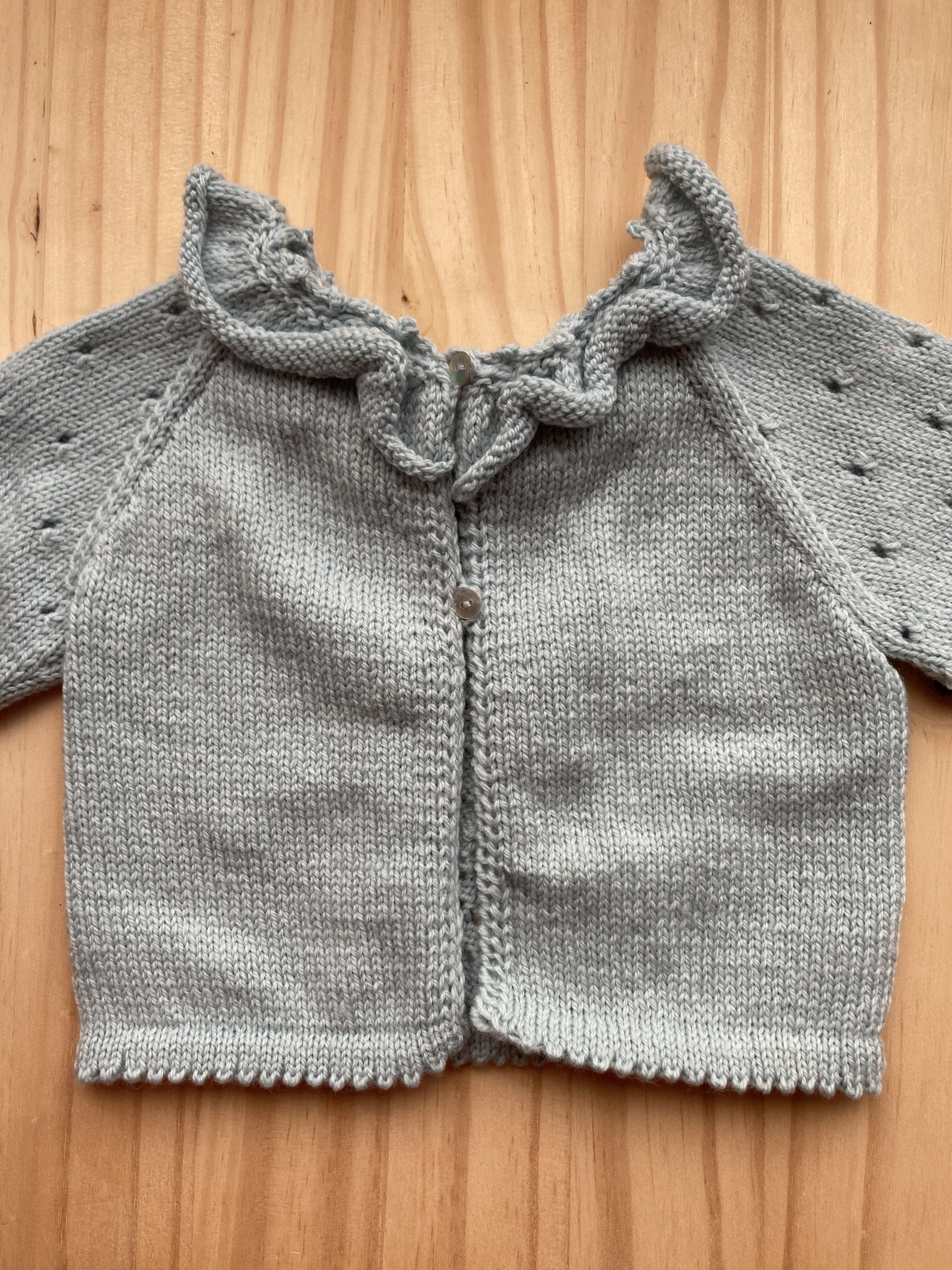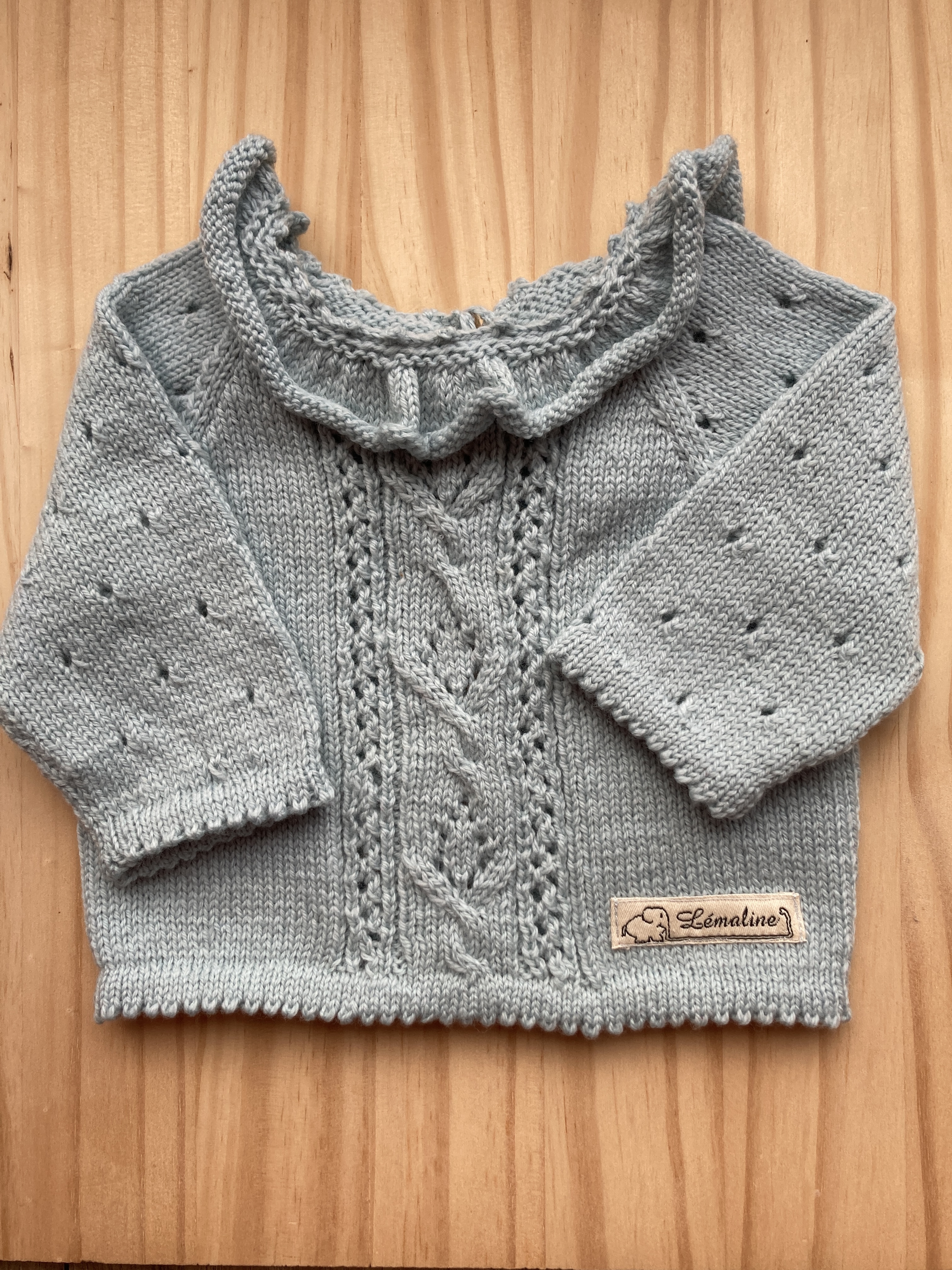 Sa maille ajourée, fine et légère, laisse respirer la peau tout en apportant une touche de poésie. Son col délicatement festonné souligne son charme intemporel et son élégance naturelle.