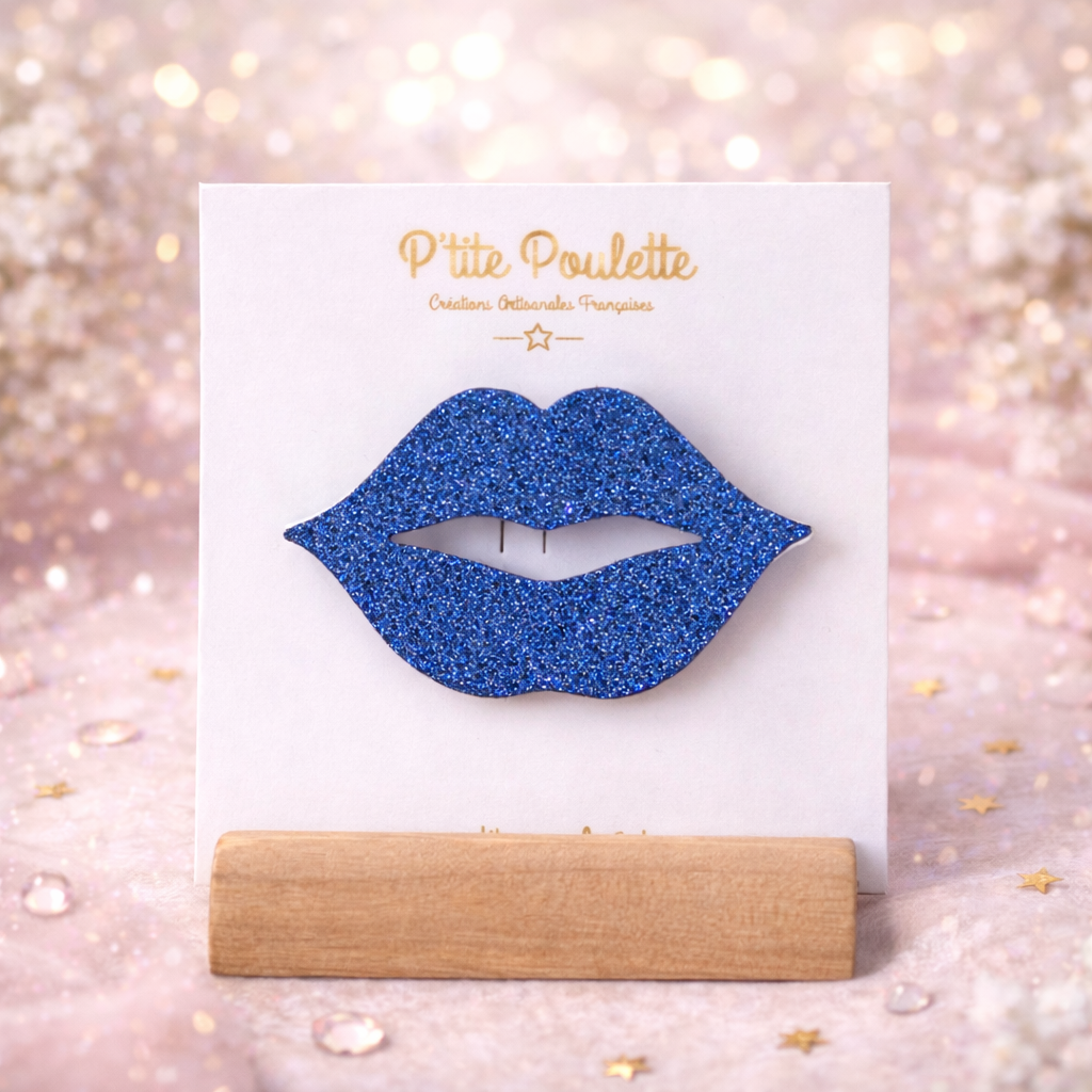 Broche Lèvre Pailletée bleu roi – Bijou fantaisie artisanal – Création française P’tite Poulette
