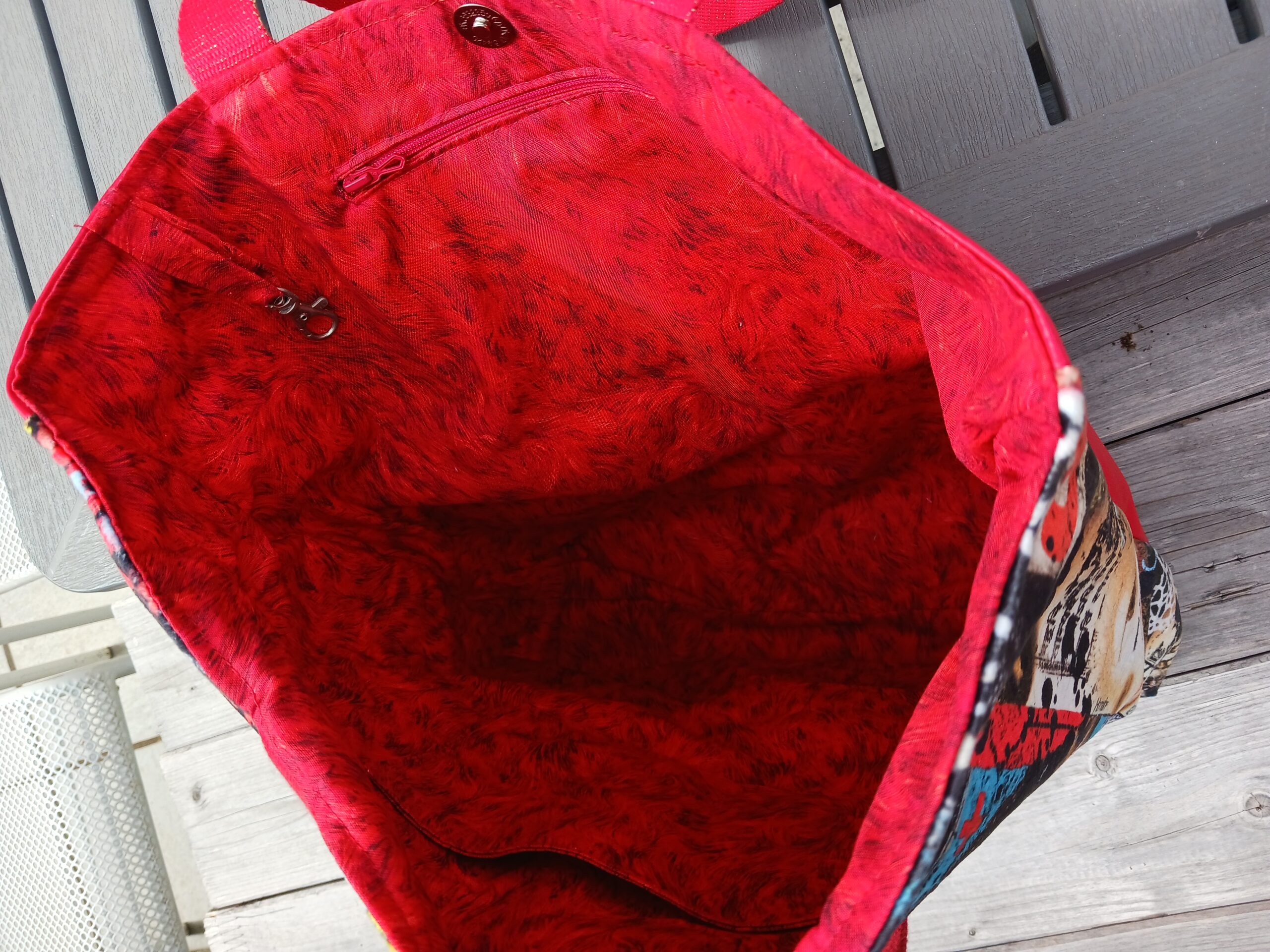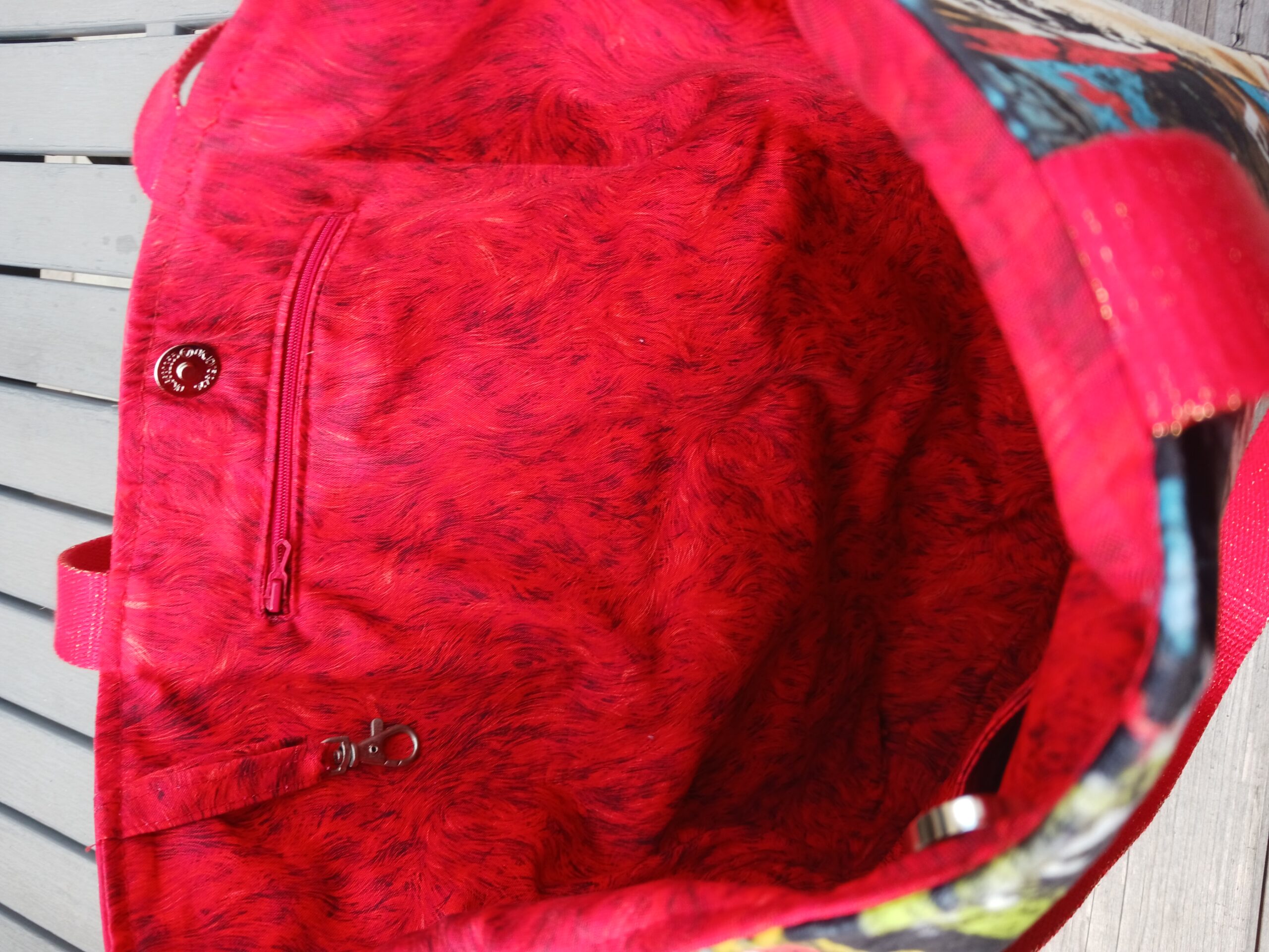 cabas rouge en simili cuir rouge et carré velours imprimé tout doux (femme), intérieur coton, avec poches plaquées, poche zip, et un mousqueton pour accrocher les clefs. Modèle artisanal, fait main, pièce unique