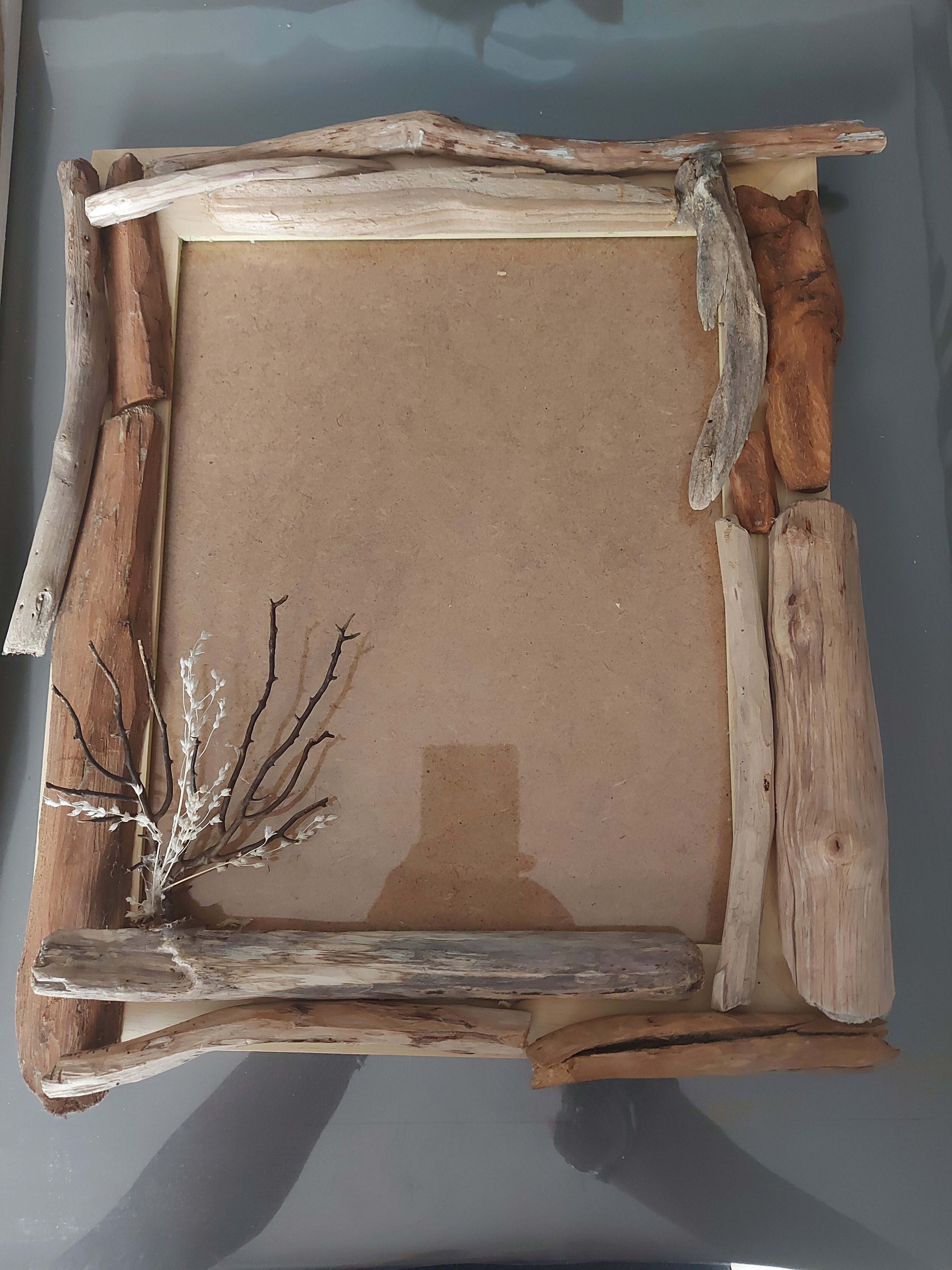 Cadre en bois décoré de bois flotté et agrémenté d’une algue. Pouvant contenir une photo format a4. Fabriqué main.  Un support pour vos photos de vacances.