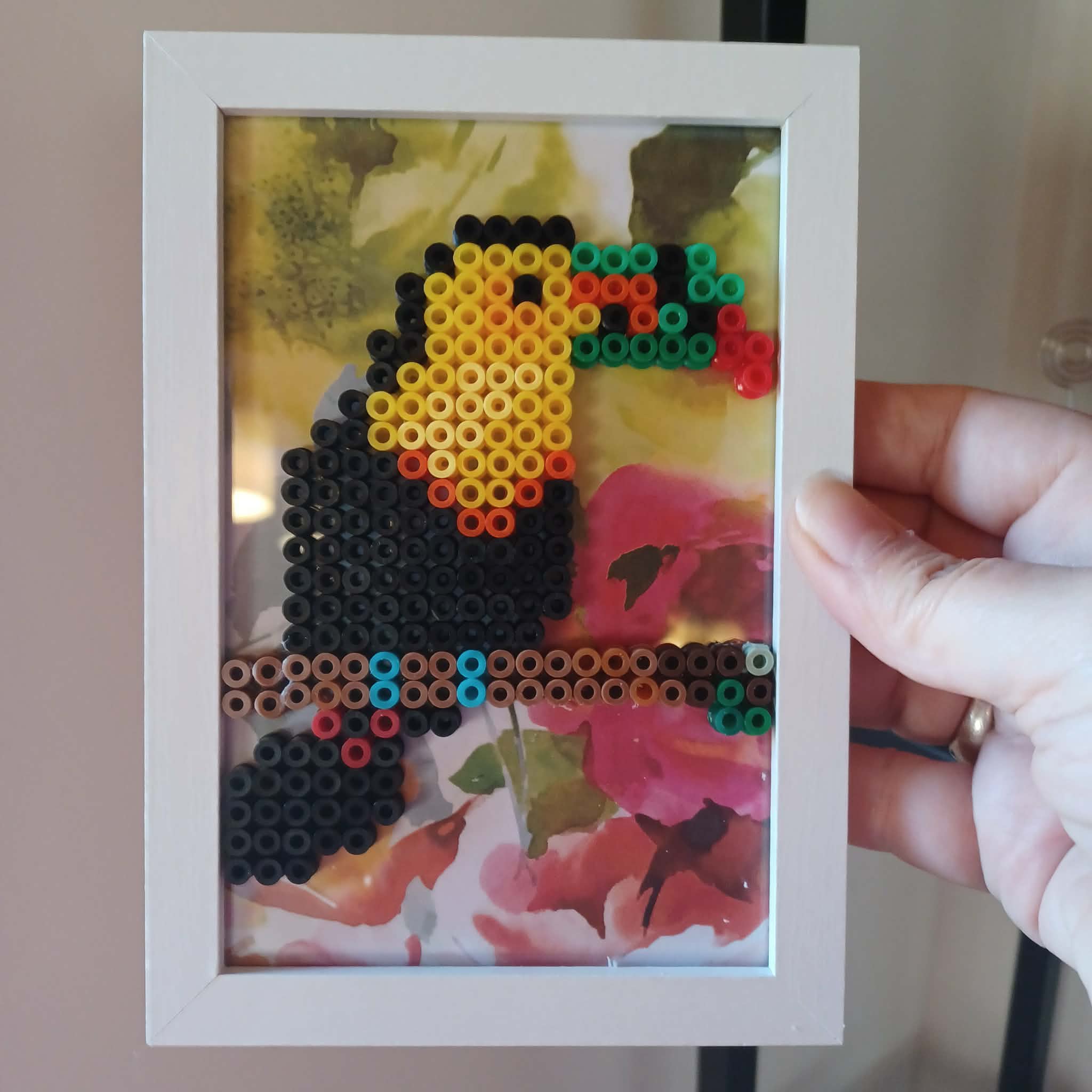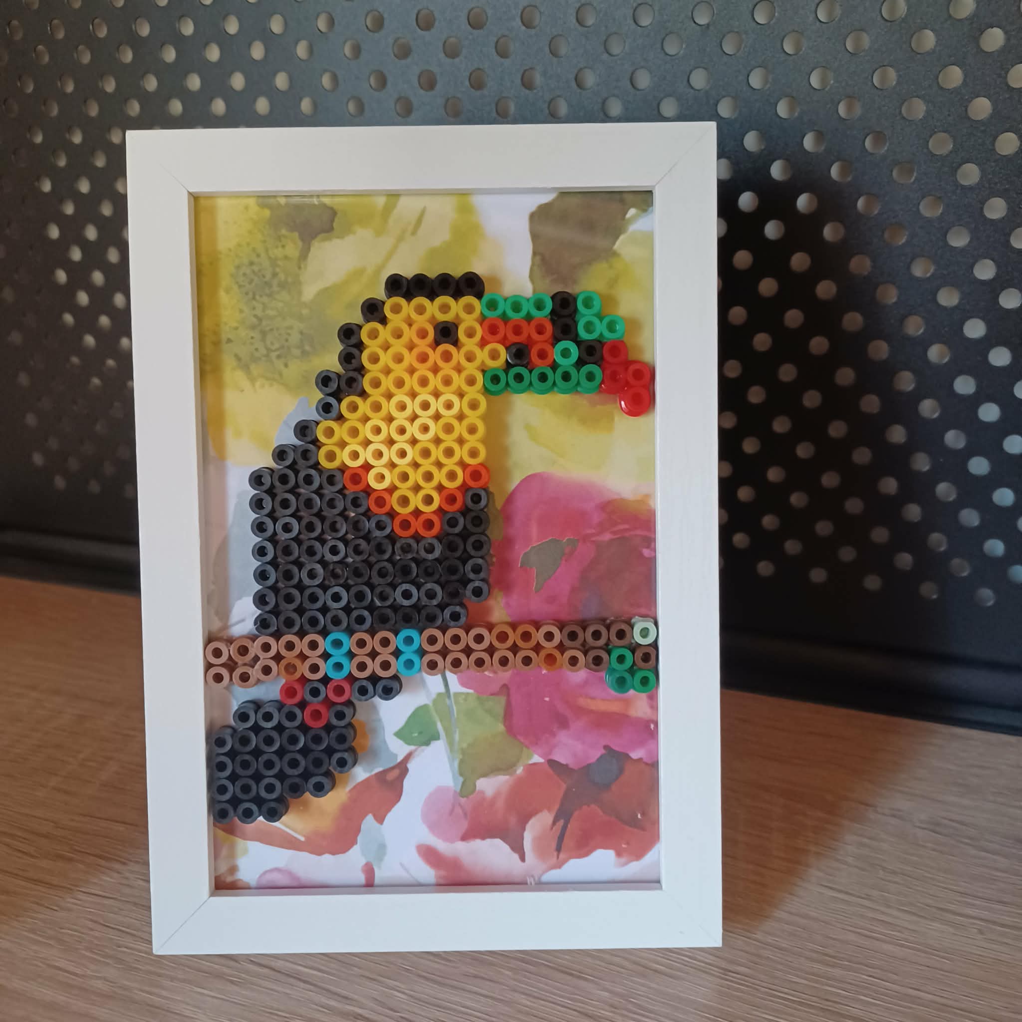 Un cadre sympa plein de pep’s, format photo motif toucan réalisé en perles à repasser.