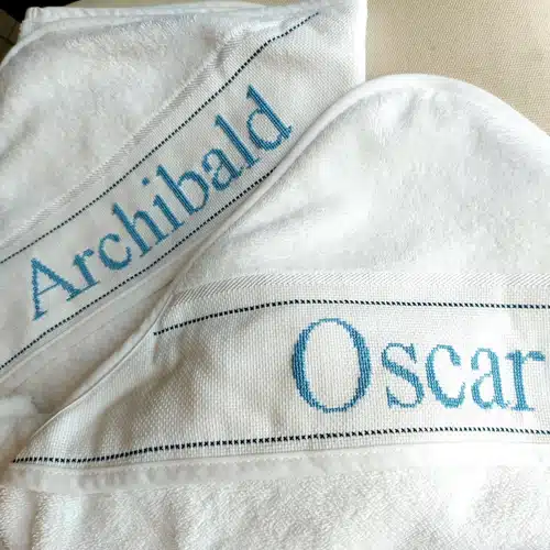 Cape de bain blanche avec prénom brodé main. Idéal pour bien envelopper bébé en sortant de son bain.