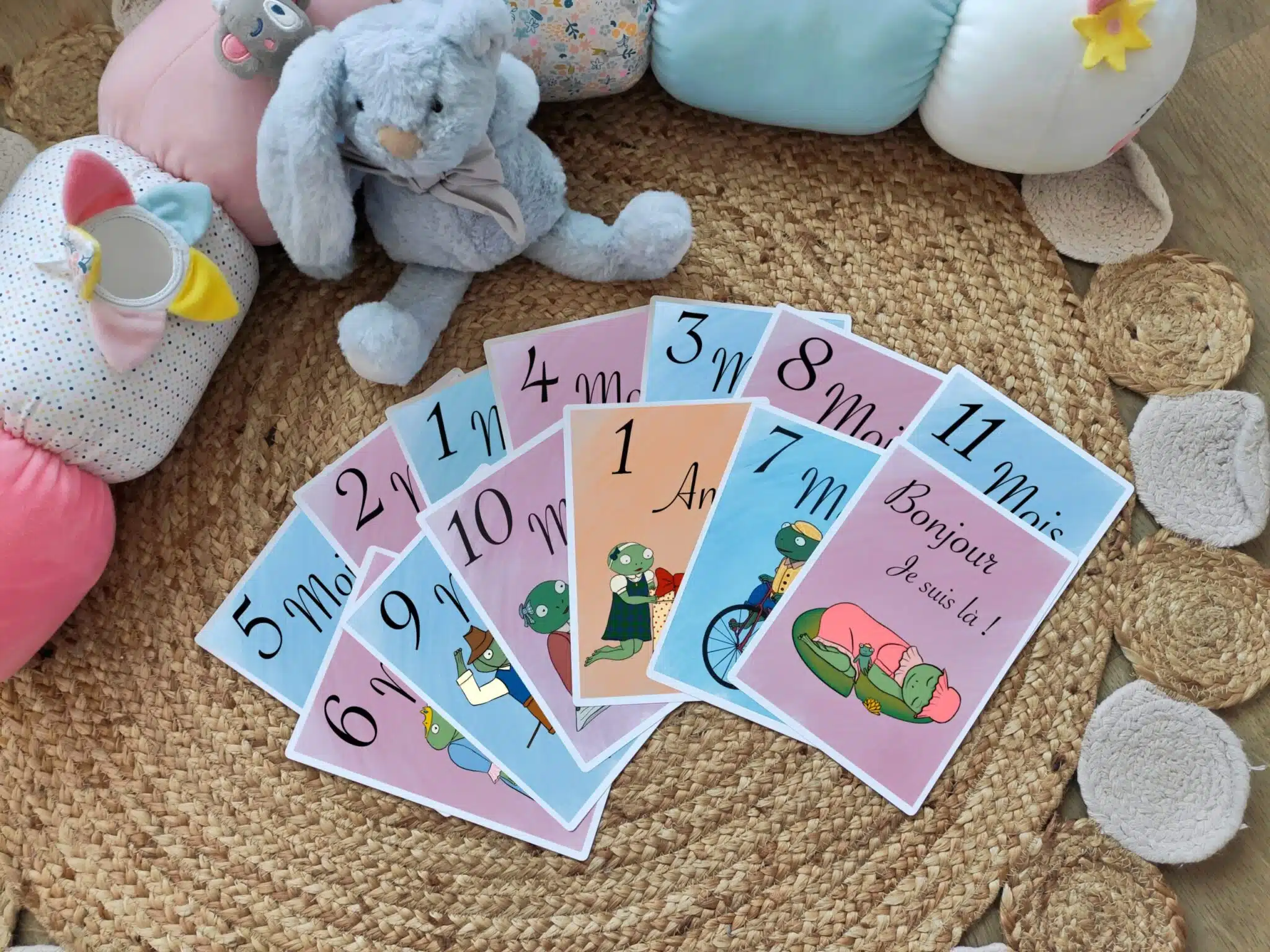 6 cartes de Antoinette, 6 cartes de Célestin et une carte où ils sont à deux pour fêter leur anniversaire et celui de votre enfant.
