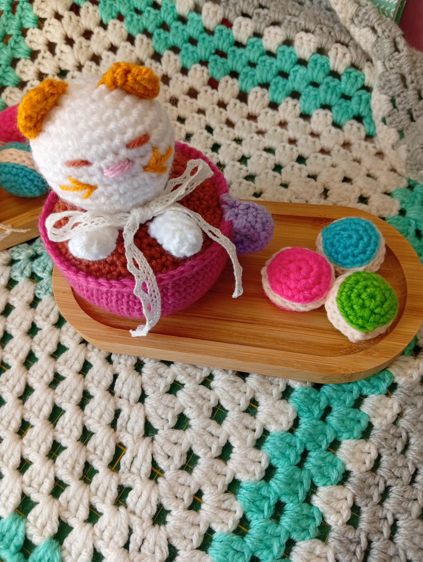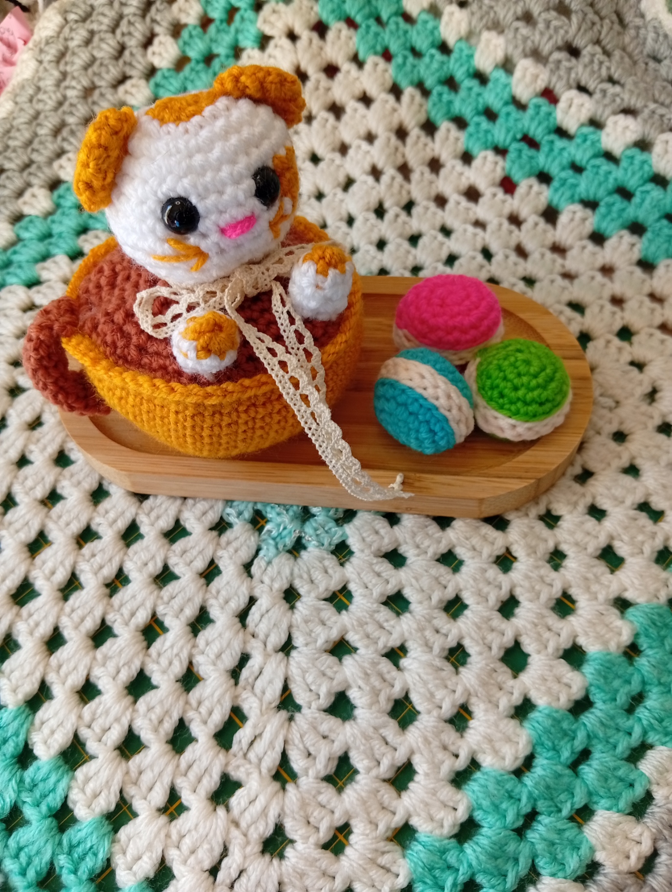 Craquez pour ce set au crochet fait main aussi mignon que gourmand : un chat cappuccino kawaii accompagné de ses petits macarons colorés, joliment présentés sur leur plateau. 🐱☕🍰