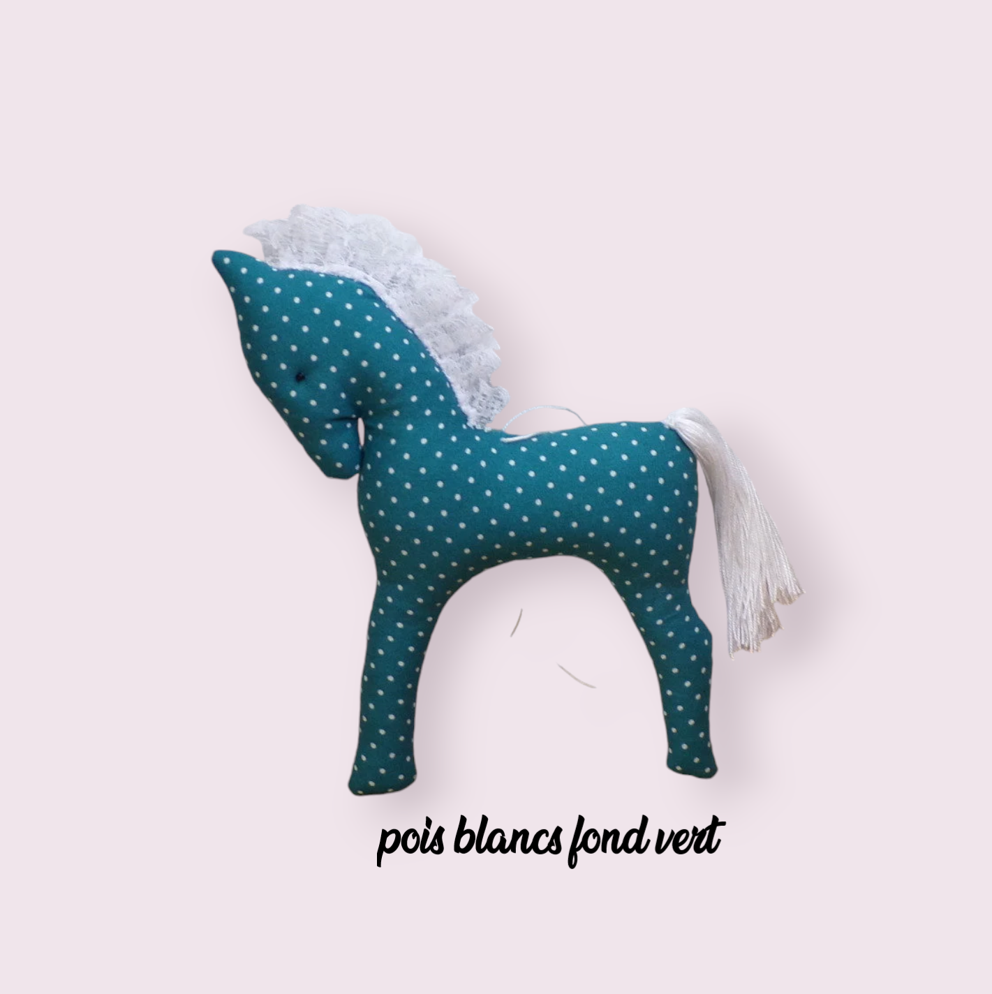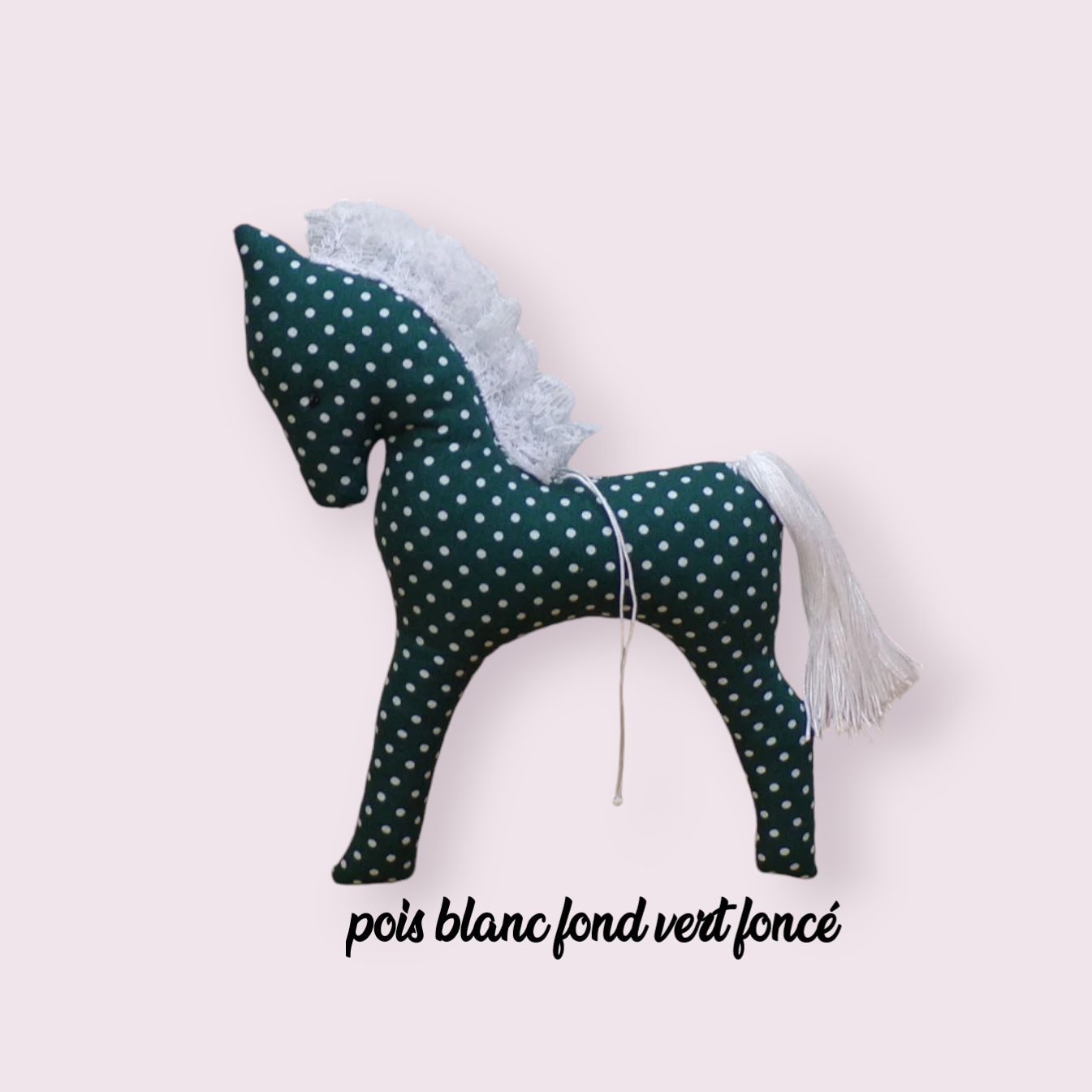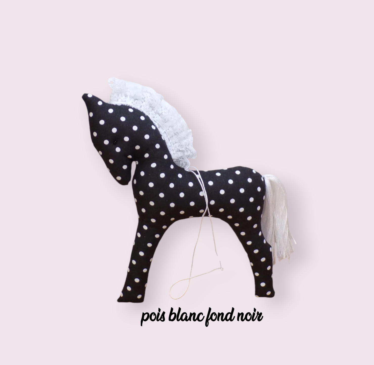 Ces petits chevaux à suspendre sont cousus dans du tissu 100 % coton dont le coloris est au choix.