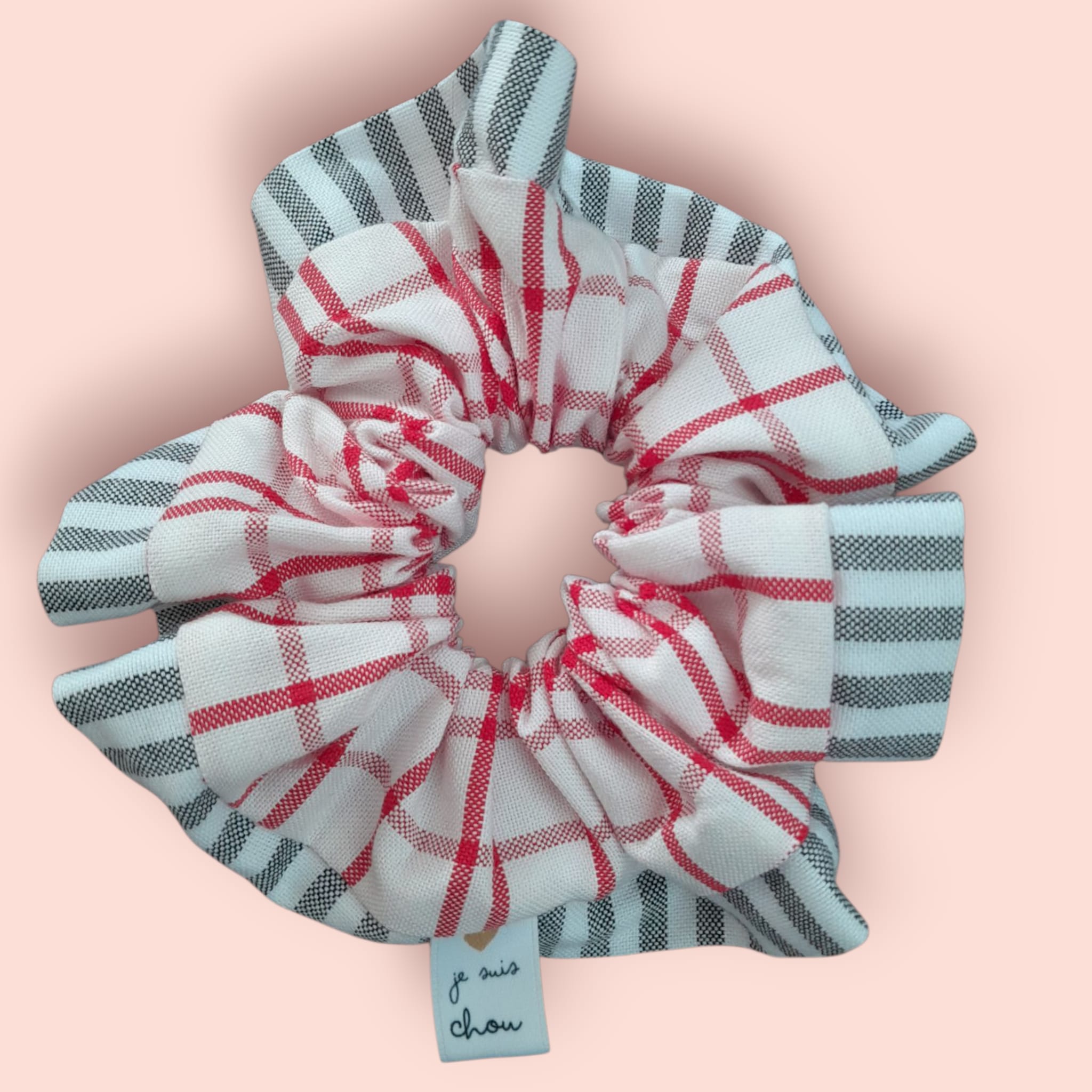 Chouchou adorée bi-matière carreaux rouges et blancs + rayures grises  fait main