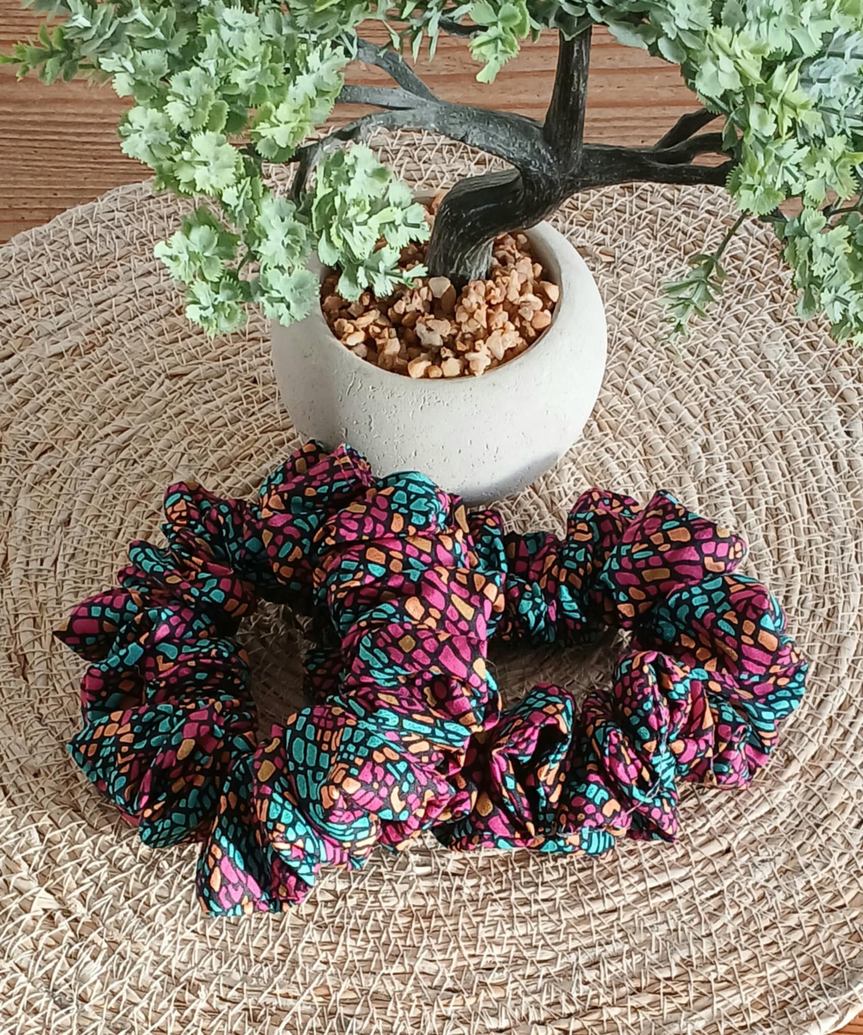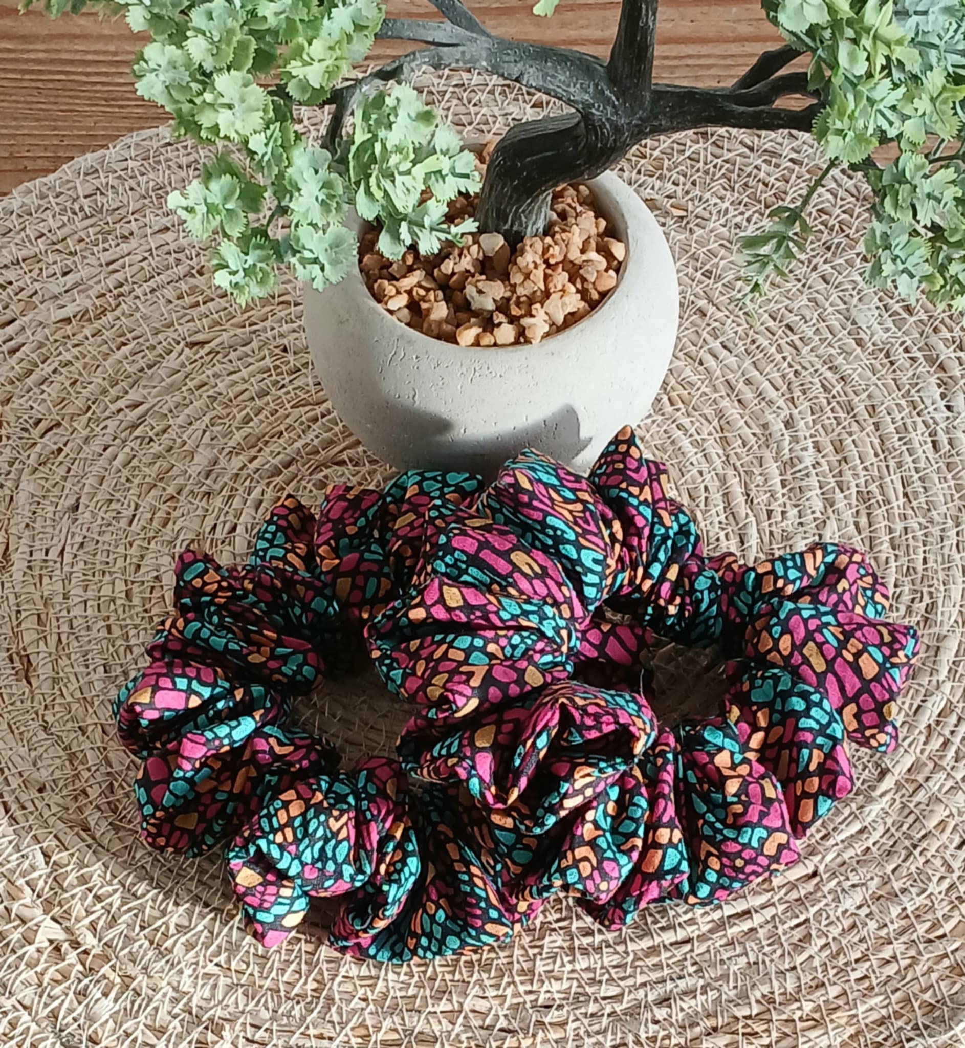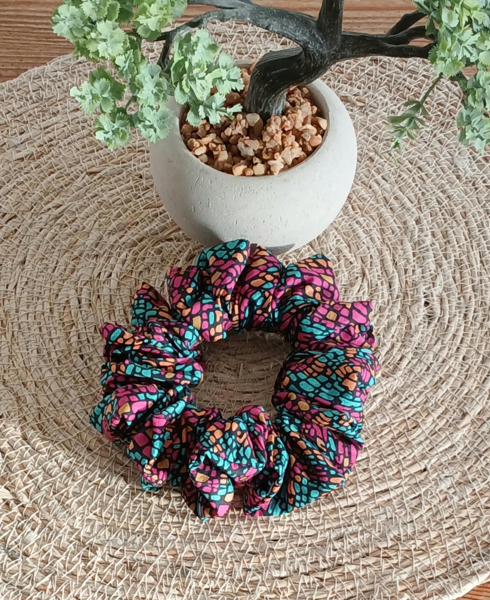 Affirme ton style avec le chouchou Mosaic Bloom, un motif vibrant façon mosaïque qui mêle des touches turquoise, orangées et or sur un fond fuchsia lumineux. Fait main et délicatement cousu, il apporte une note joyeuse, moderne et pleine de caractère à toutes tes coiffures.