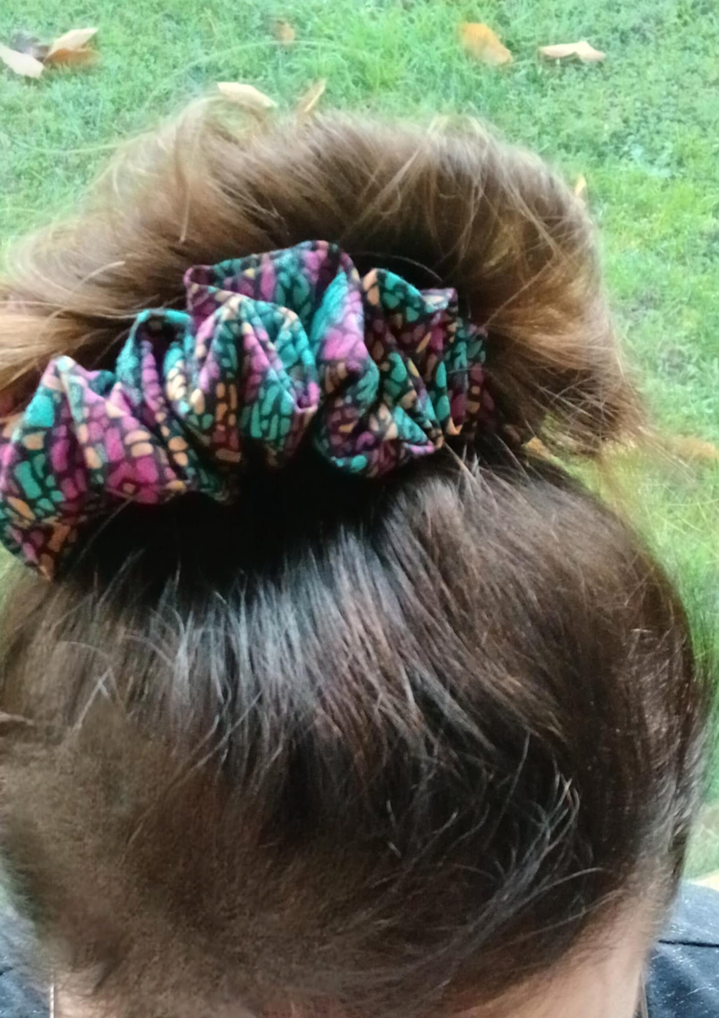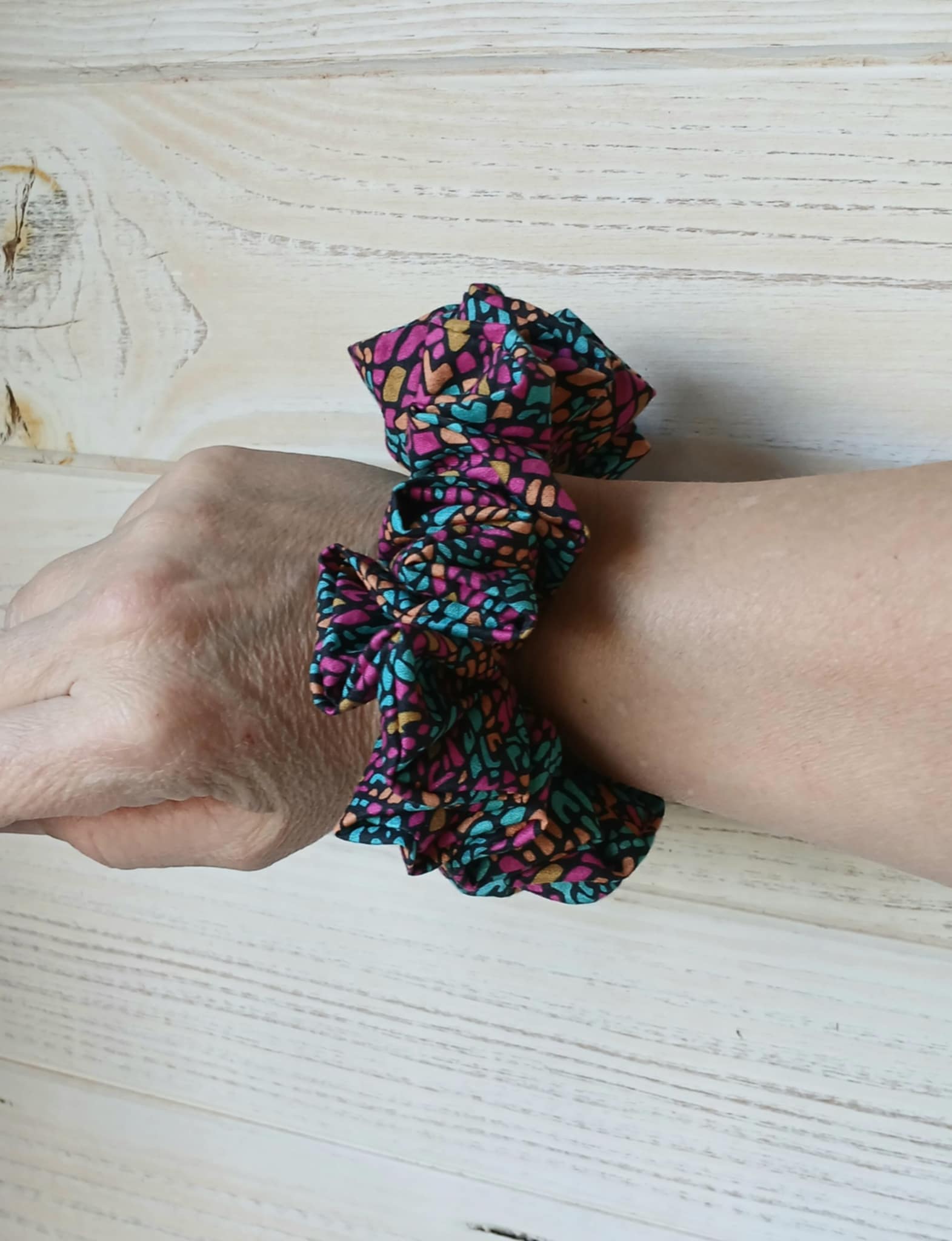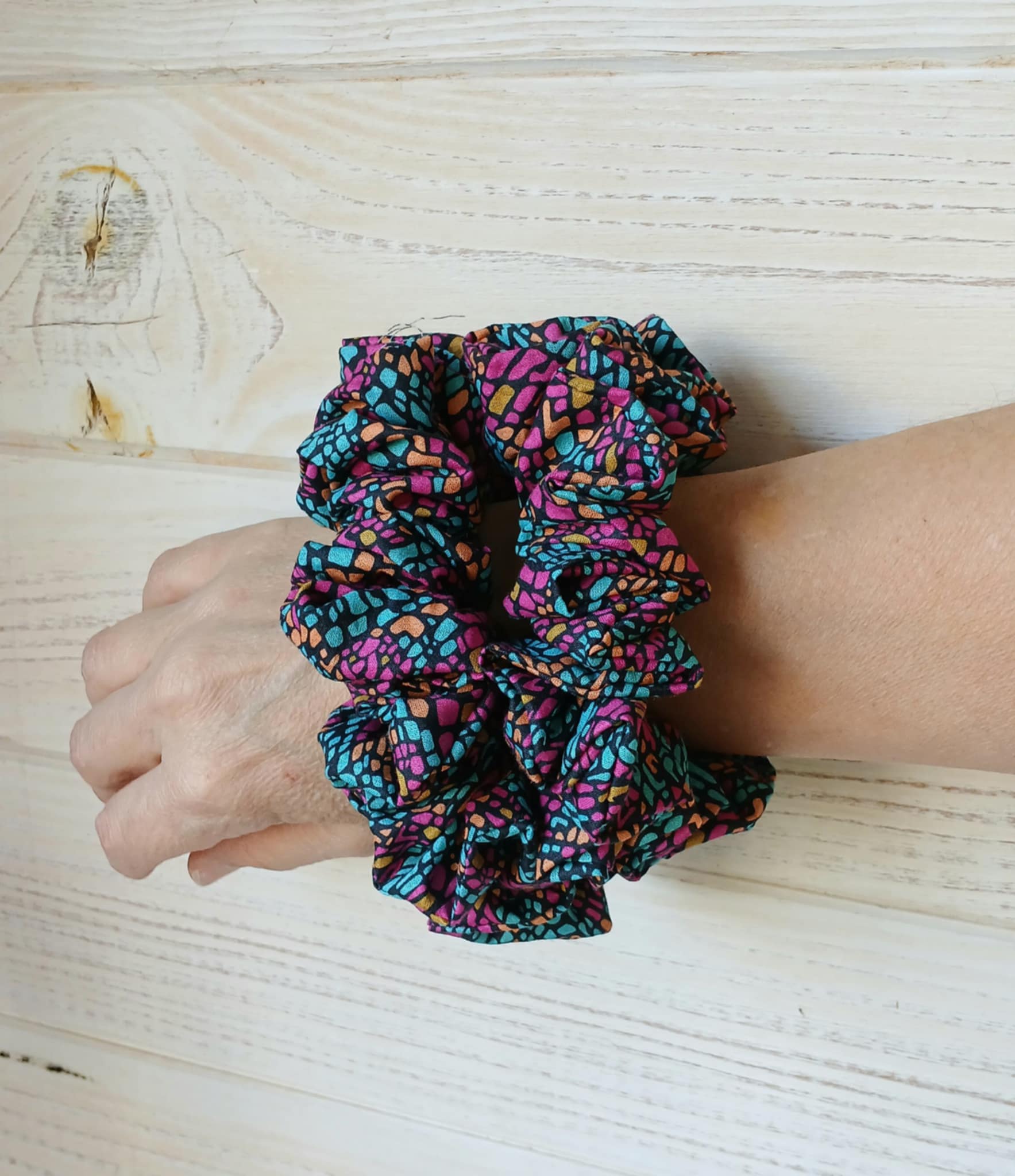 Affirme ton style avec le chouchou Mosaic Bloom, un motif vibrant façon mosaïque qui mêle des touches turquoise, orangées et or sur un fond fuchsia lumineux. Fait main et délicatement cousu, il apporte une note joyeuse, moderne et pleine de caractère à toutes tes coiffures.
