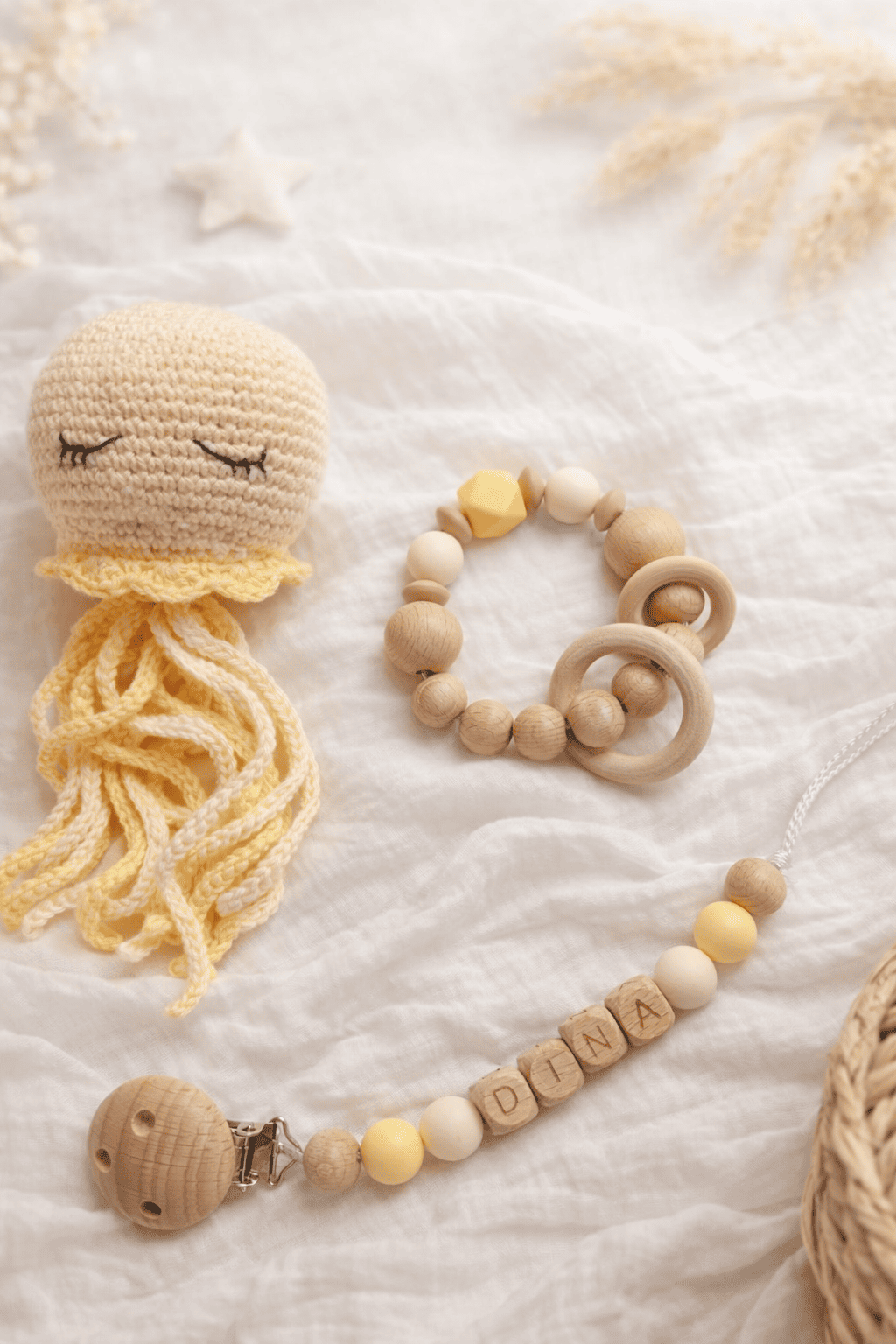 - L’Attache tétine : Pratique et ludique, elle garde la tétine à portée de main et ajoute une touche de charme à la tenue de bébé.