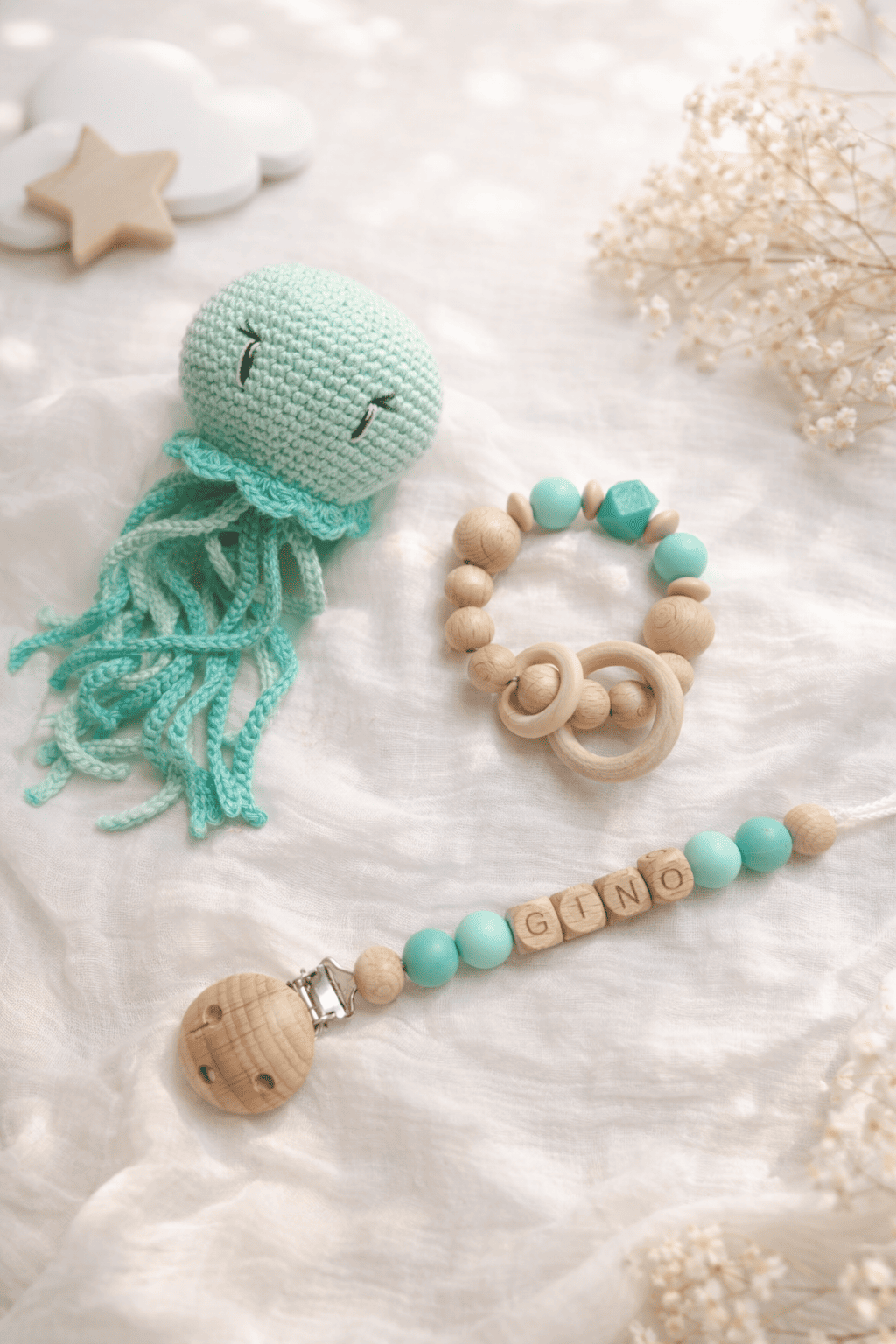 Plongez dans un univers de tendresse et de douceur avec nos coffrets pour bébés uniques, conçus pour choyer et divertir les petits trésors. Chaque coffret comprend une adorable pieuvre en coton, une attache tétine et un anneau de dentition, tous soigneusement confectionnés pour un confort optimal.