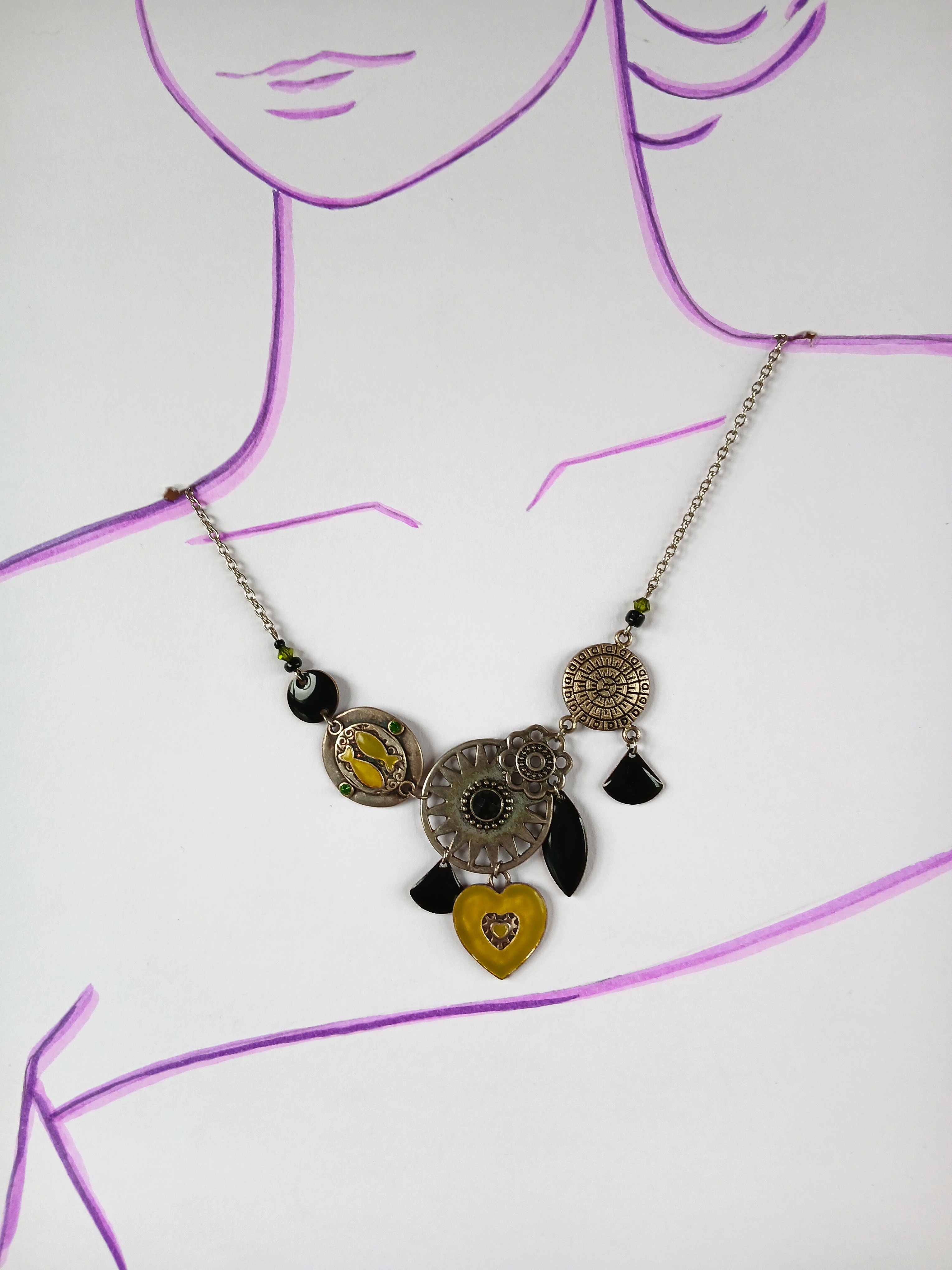 Affirme ton style avec ce collier plastron au design singulier signé CDC-UPCYCLE. Composé d’une chaîne argentée et de breloques ajourées aux motifs délicats, il est sublimé par des perles noires brillantes et un pendentif cœur jaune éclatant qui apporte une touche solaire et audacieuse.