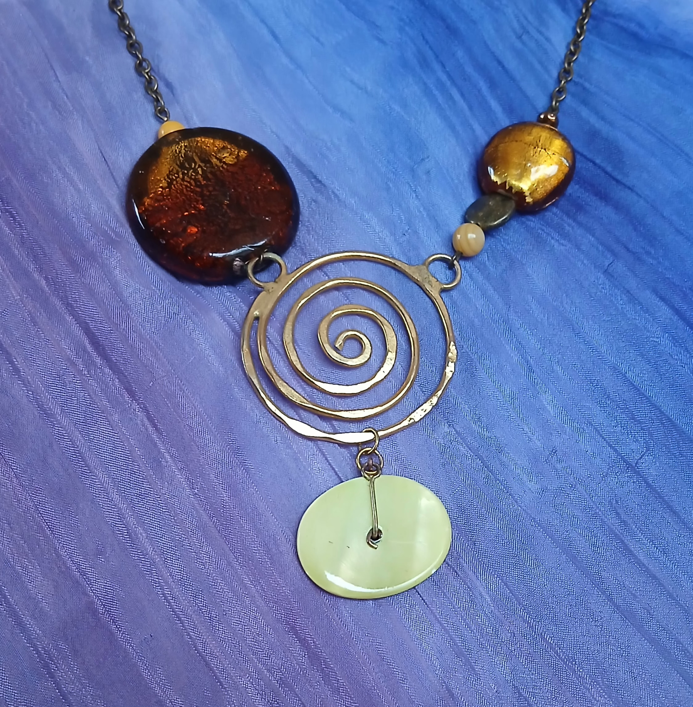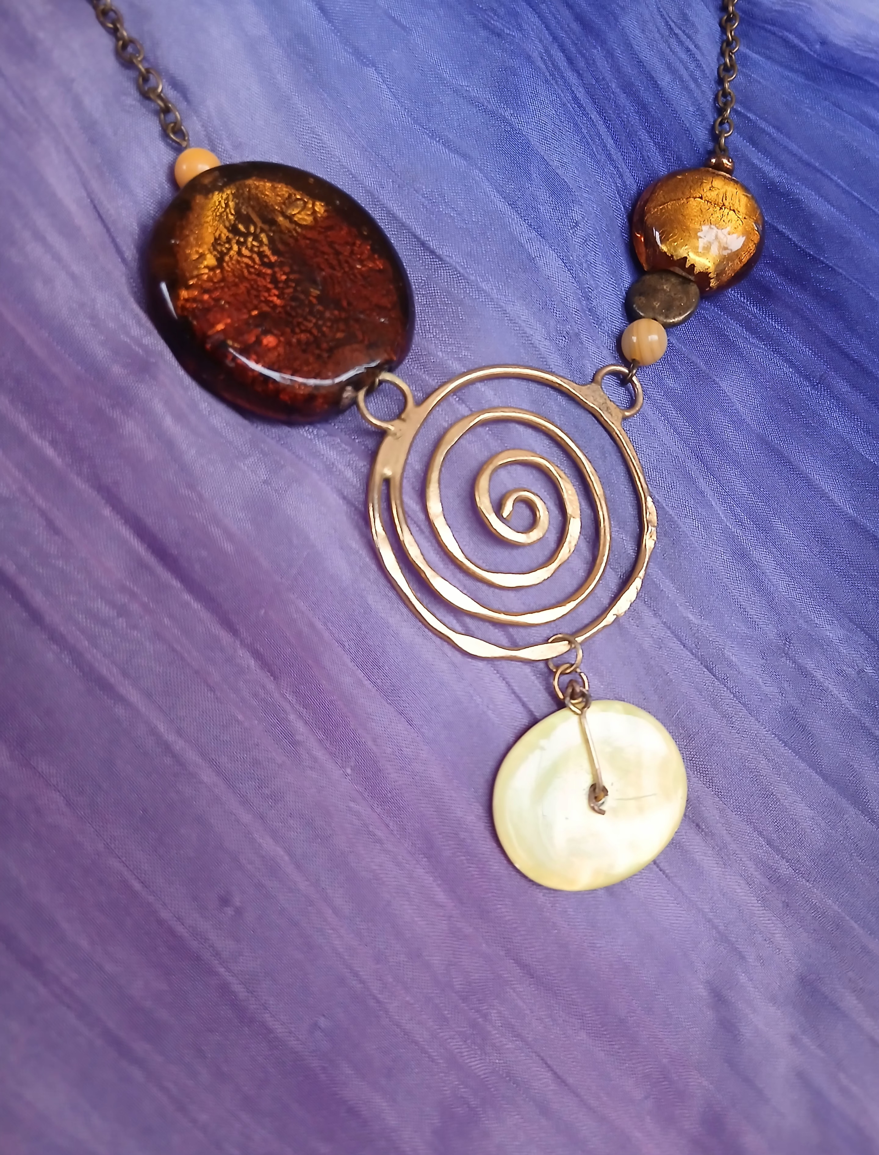 Il associe de grandes perles plates aux teintes ambre et caramel, aux reflets lumineux, à un large pendentif spirale en métal brillant. L’ensemble se termine par un disque de nacre jaune clair, apportant contraste et douceur.