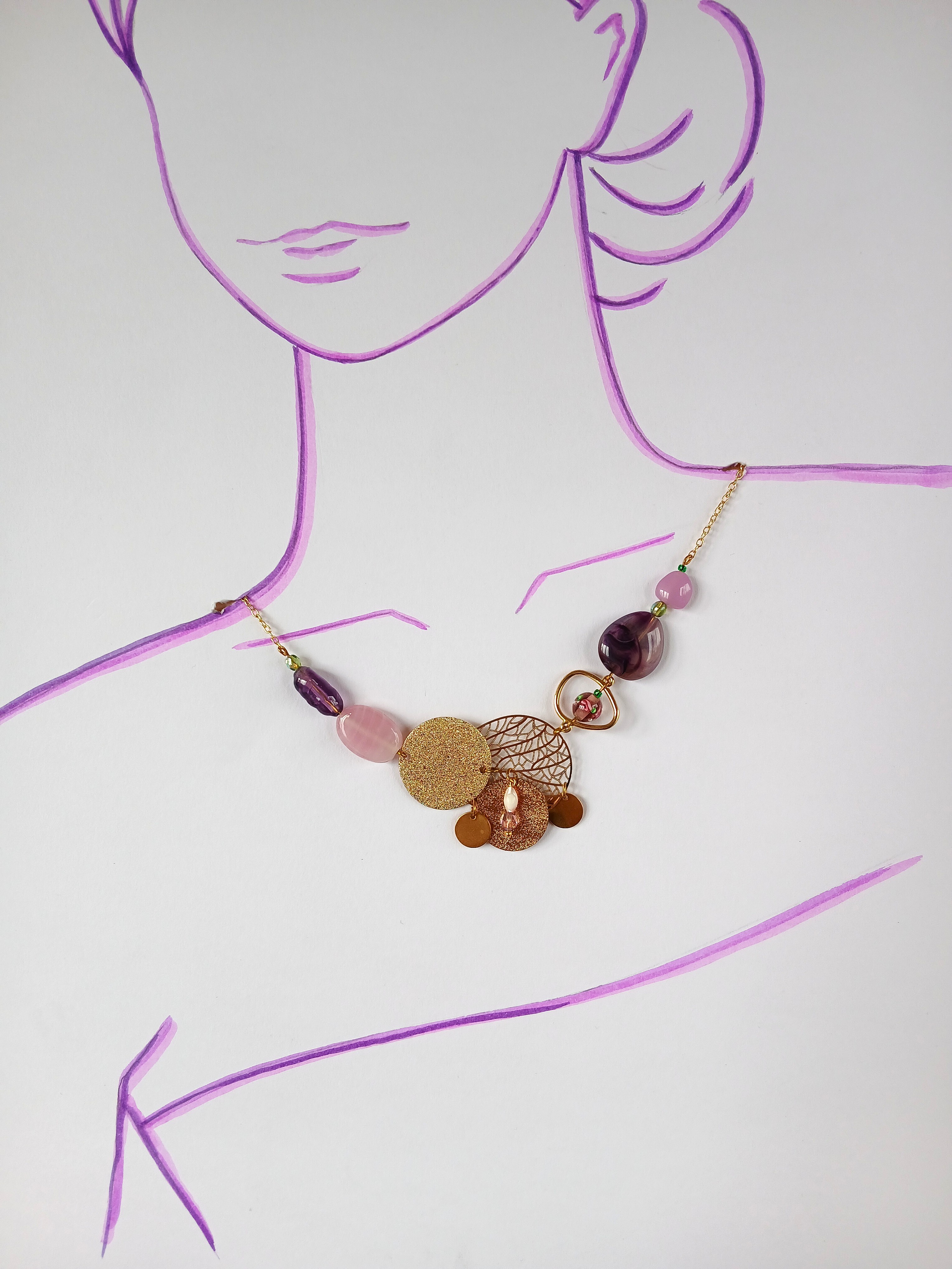 Son pendentif central superpose subtilement disques texturés, ou ajourés et pampilles dorées brillantes, créant un jeu de matières et de lumière. Les perles aux nuances rosées et violines apportent une touche romantique et très féminine à ce collier qui illuminera votre visage.
