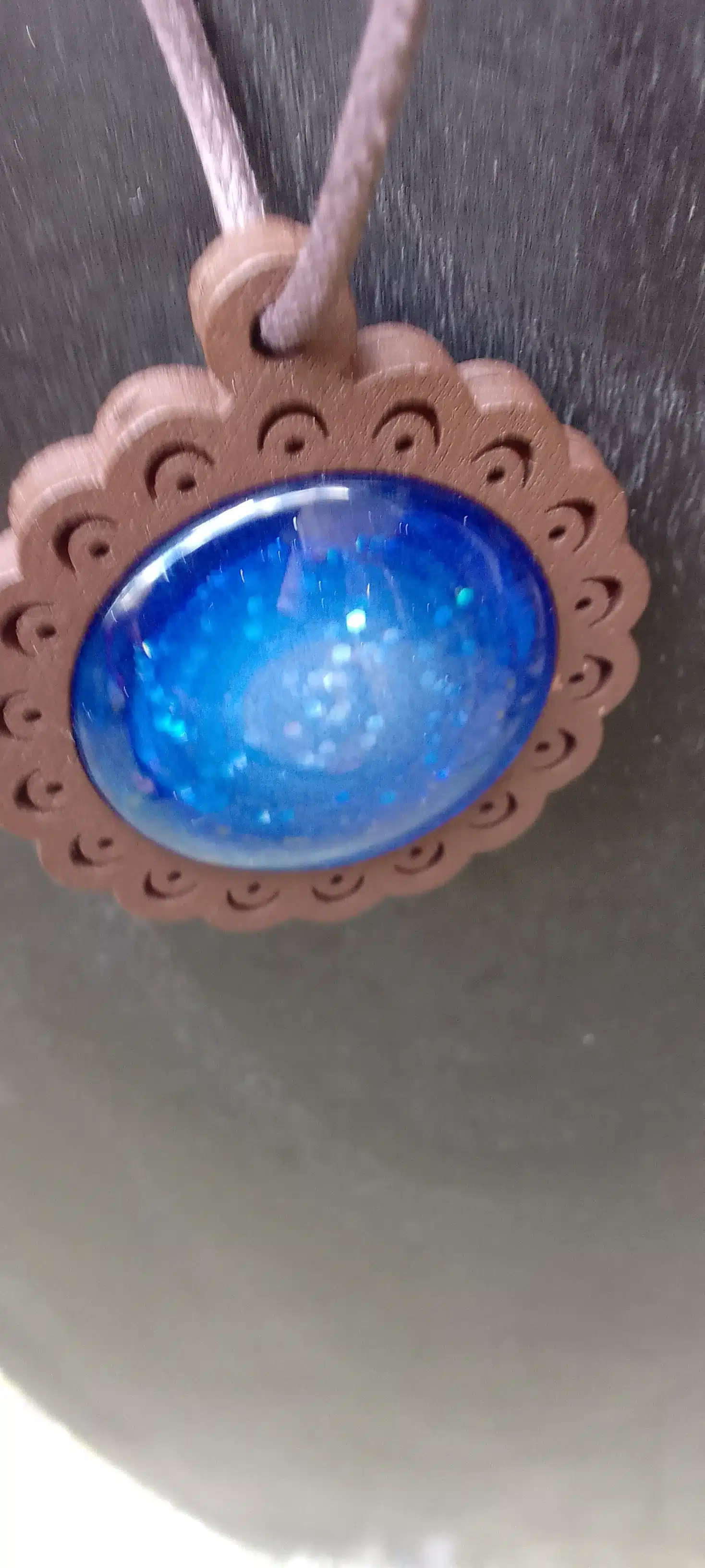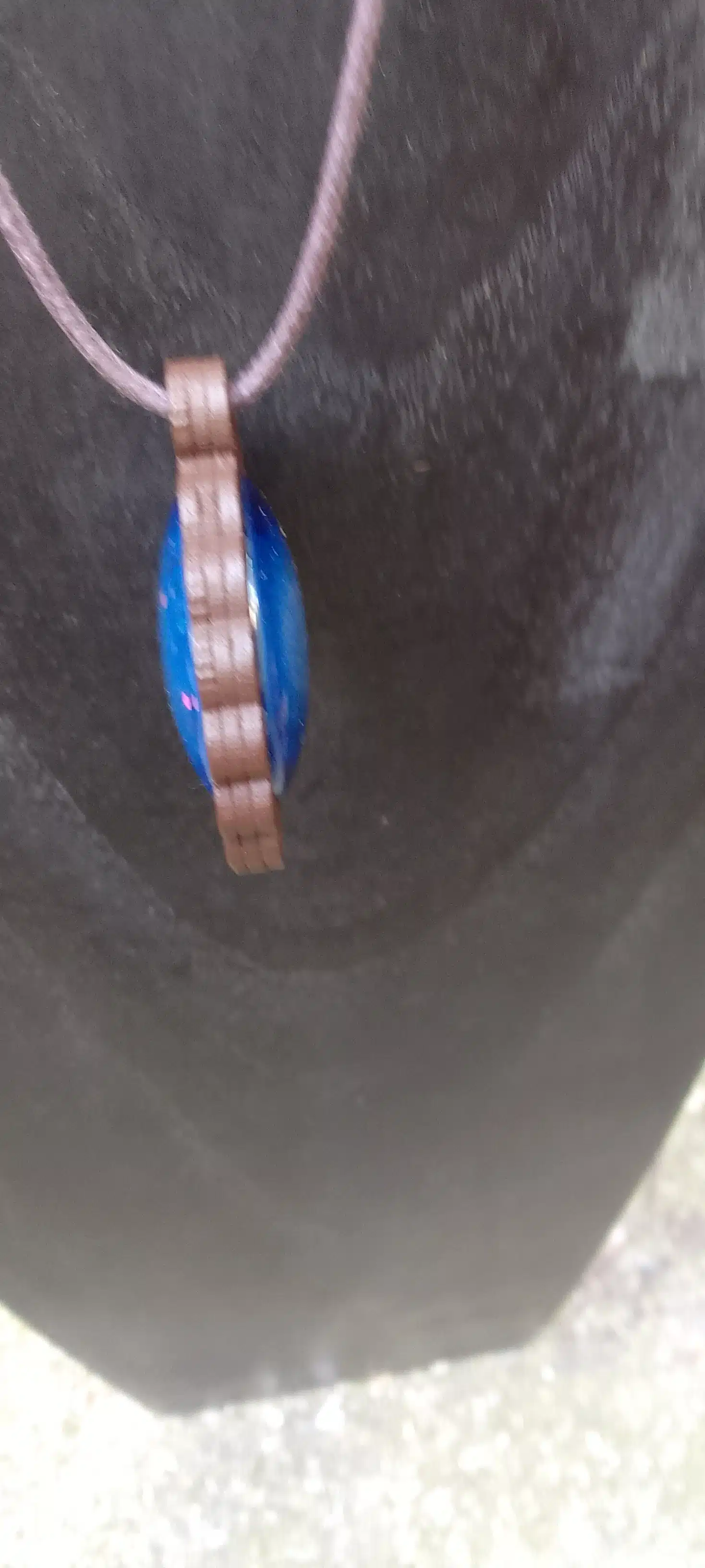 Pendentif en bois avec 2 cabochons en verre peint à la main bleu paillettes style galaxie.