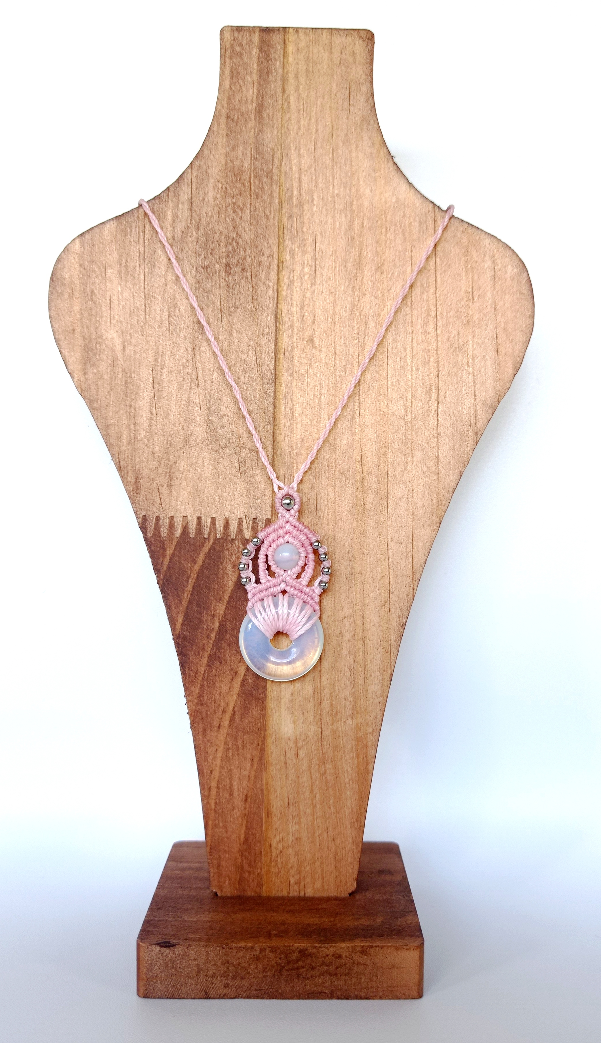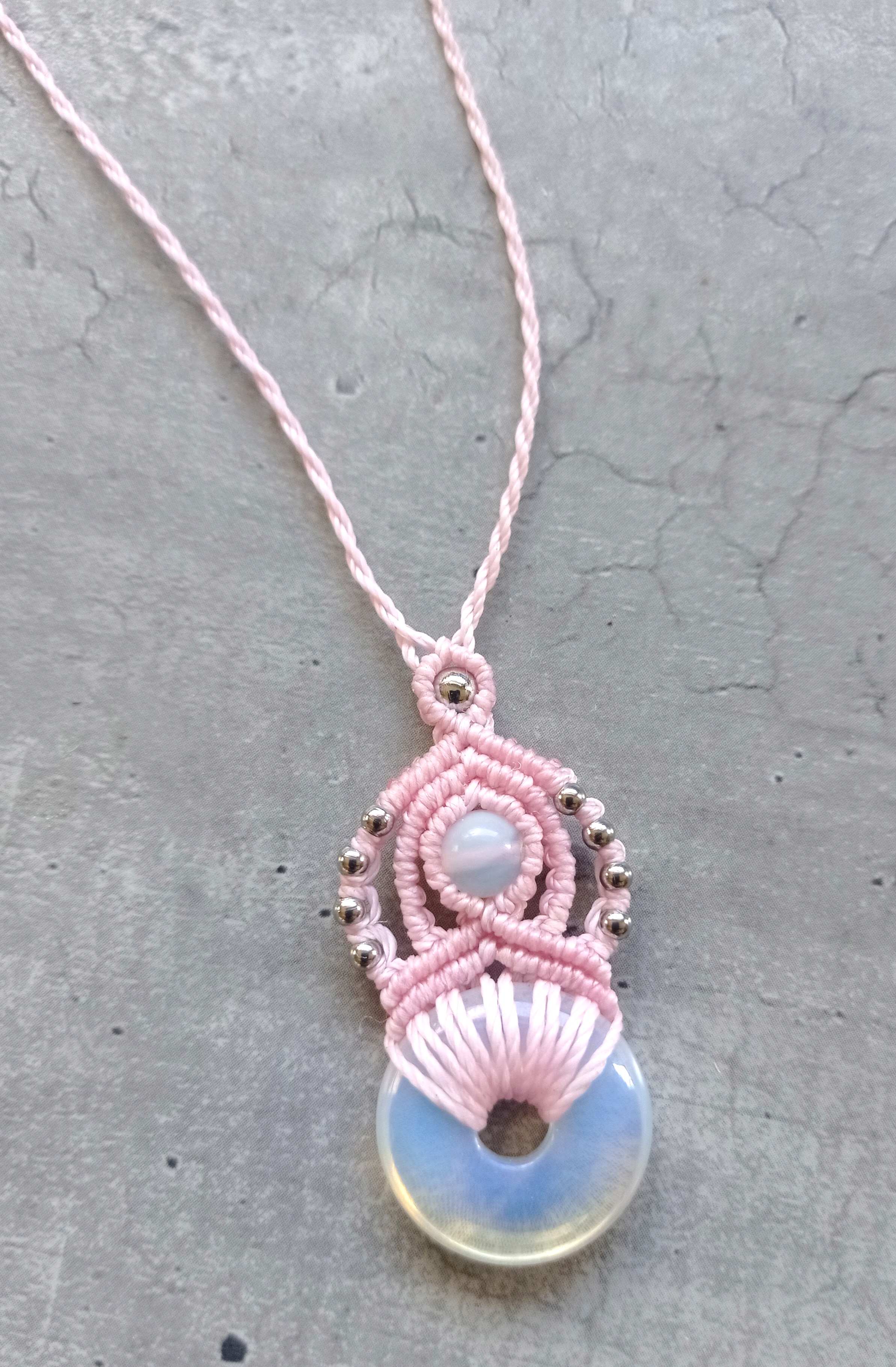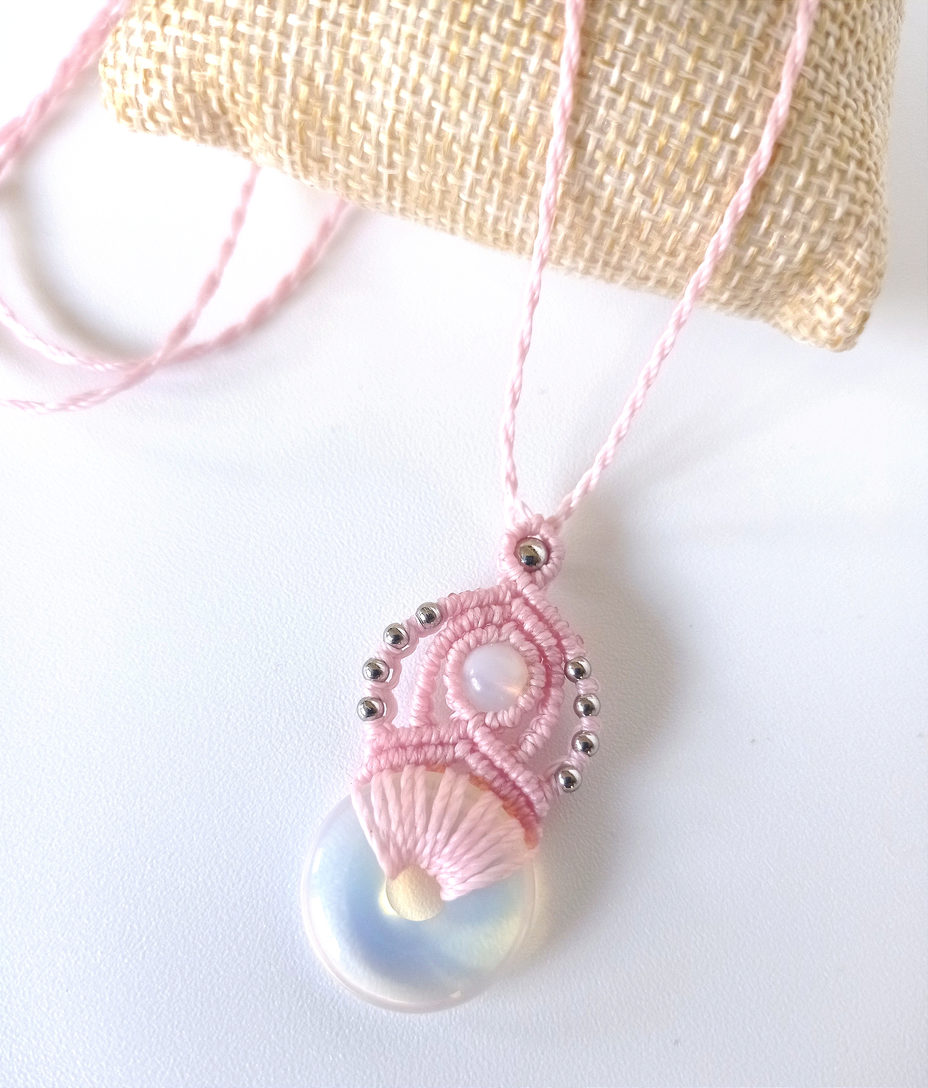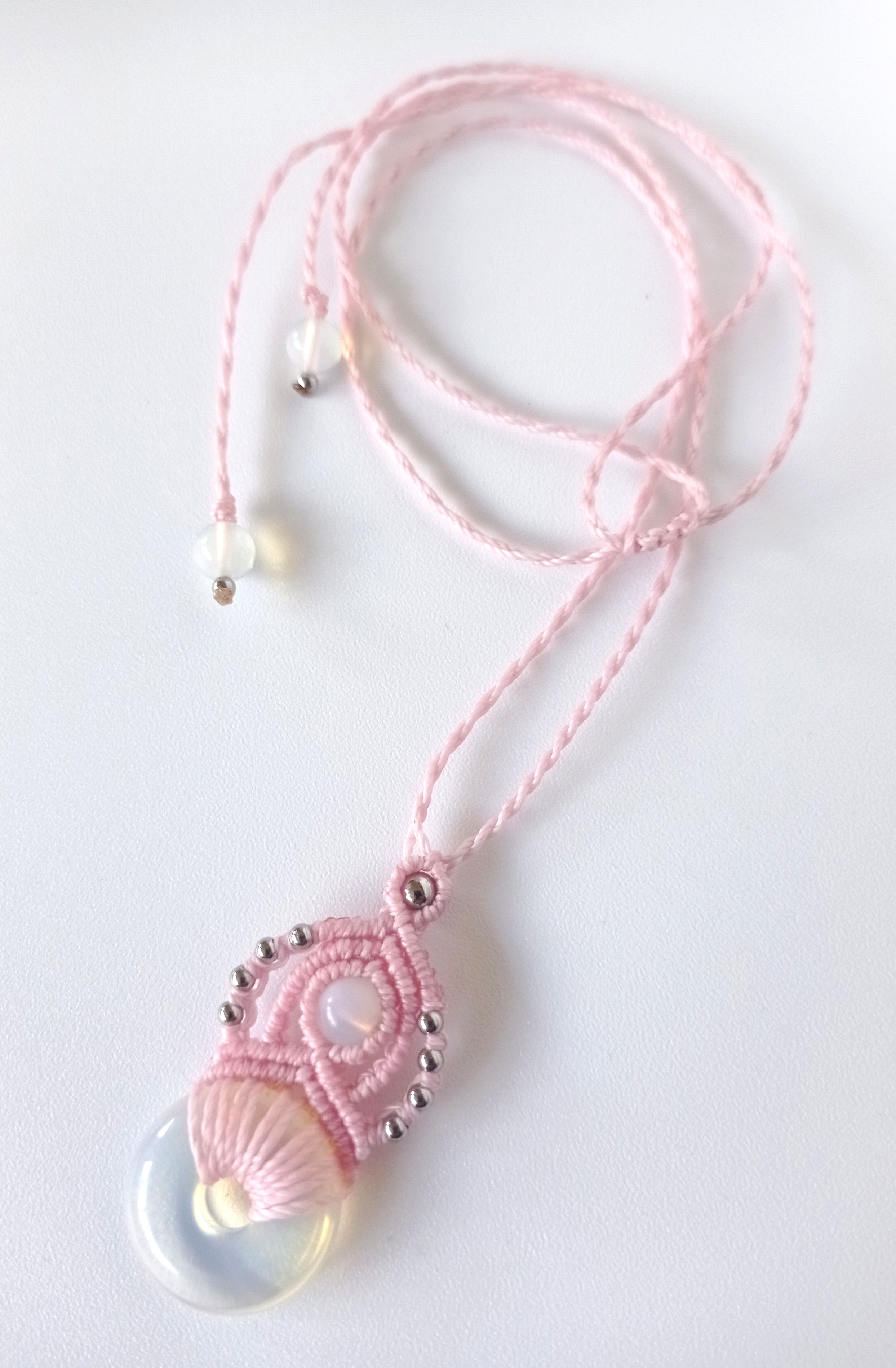 Collier avec cordon ajustable réalisé en micro macramé, dans des teintes toutes douces.