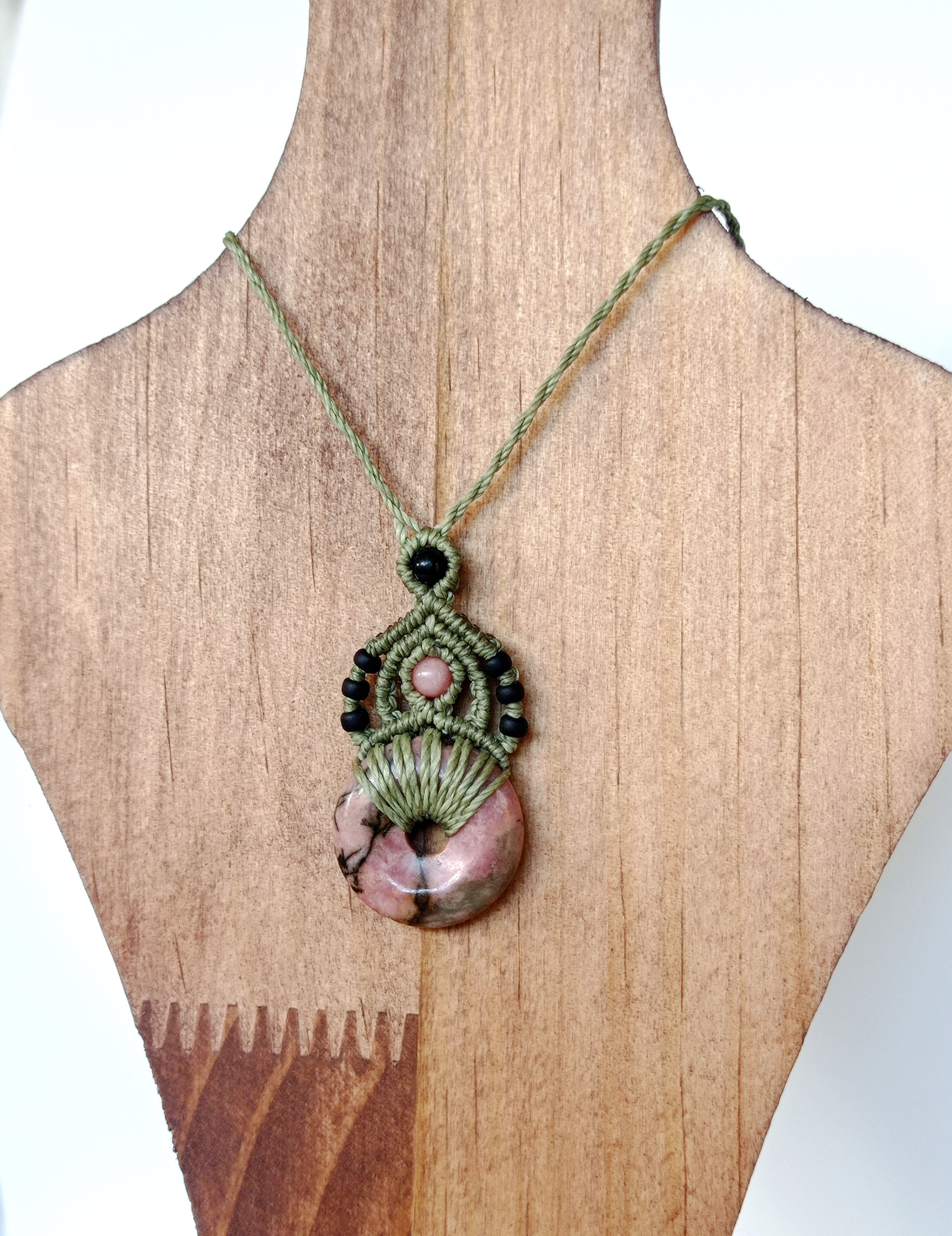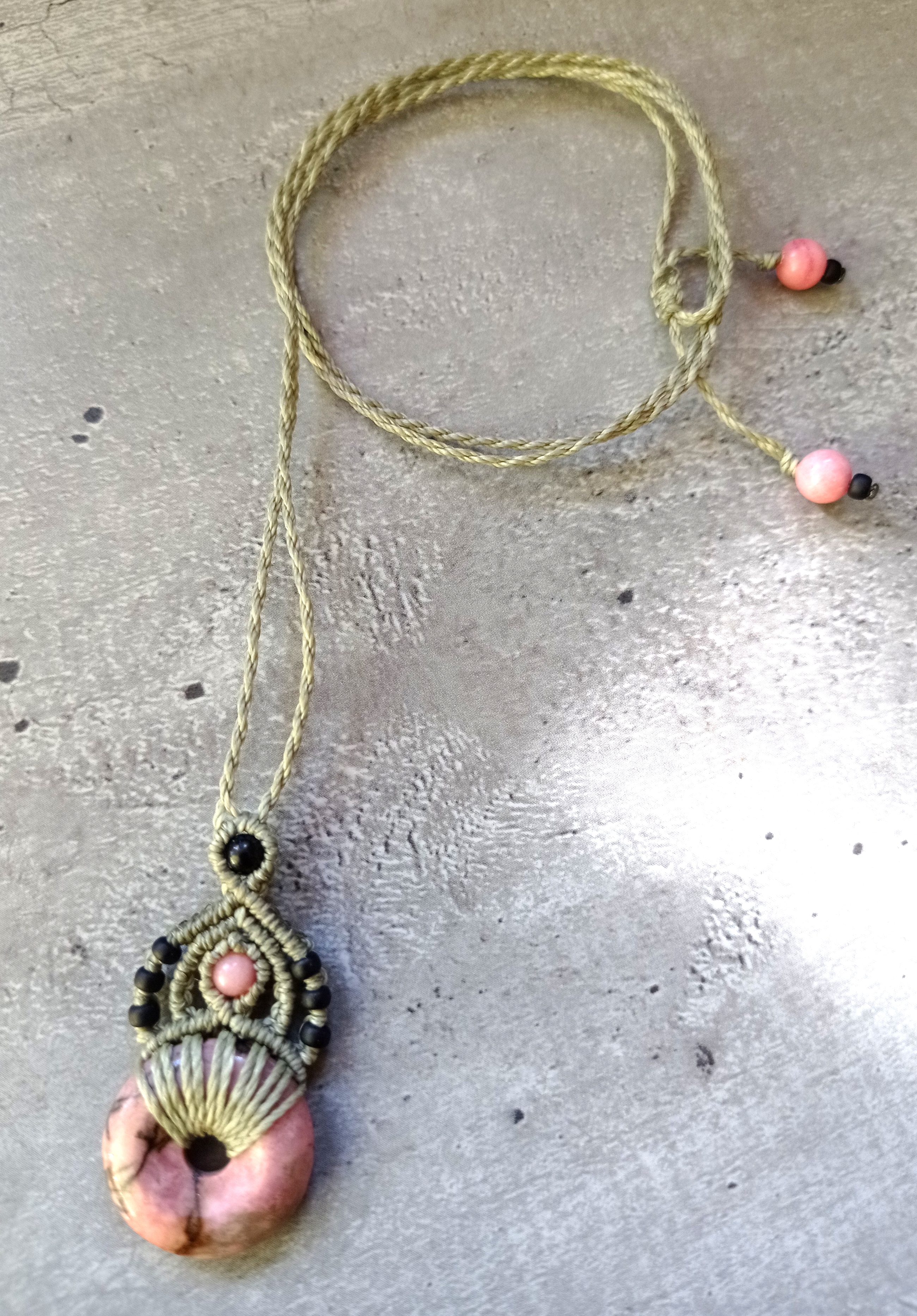 Collier donut en micro macramé rose, vert et noir, rhodonite