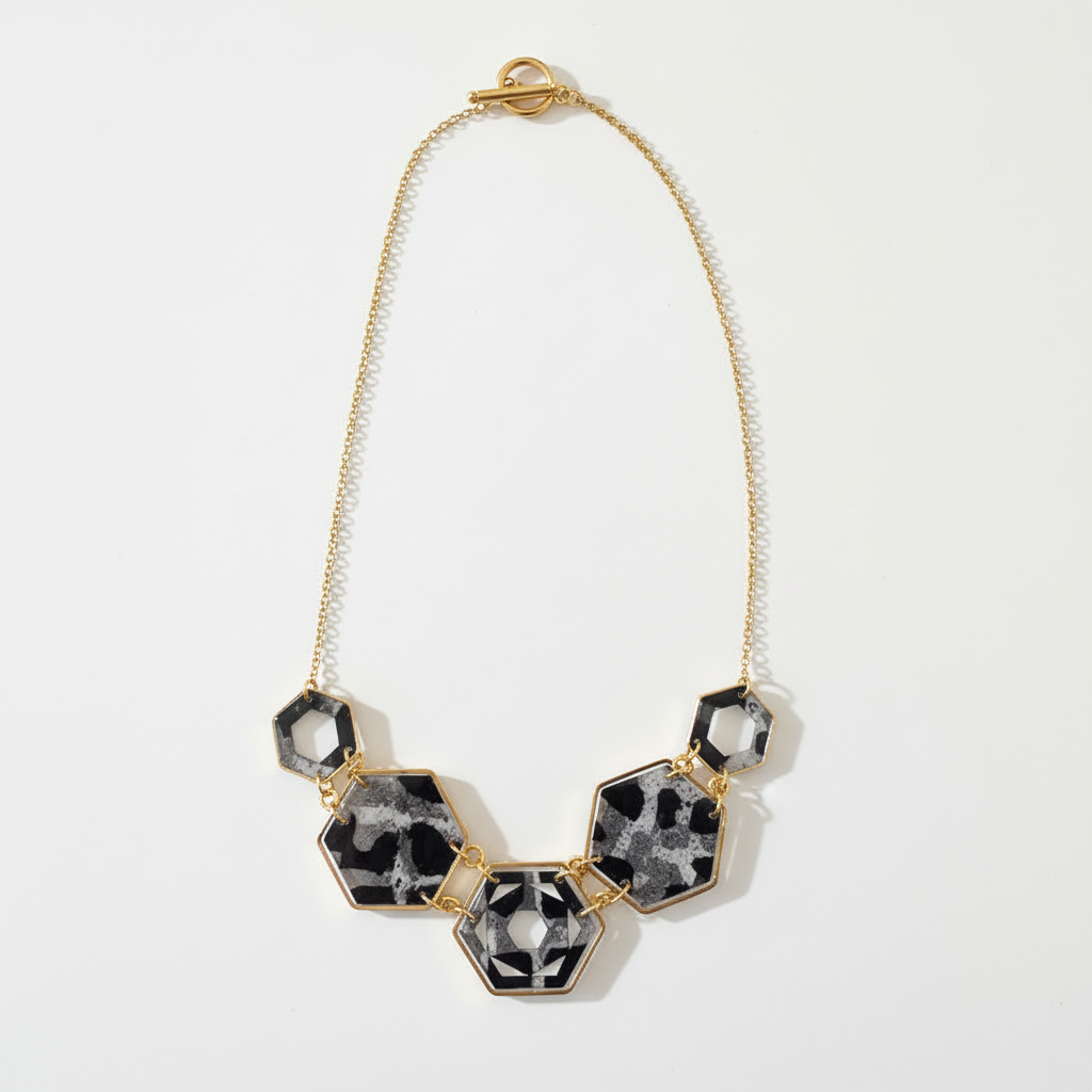 Architecture Graphique : Ce collier se distingue par sa structure composée de 5 hexagones reliés entre eux. Cette disposition en “plastron léger” épouse le décolleté avec fluidité et apporte un rythme visuel très moderne à votre tenue.