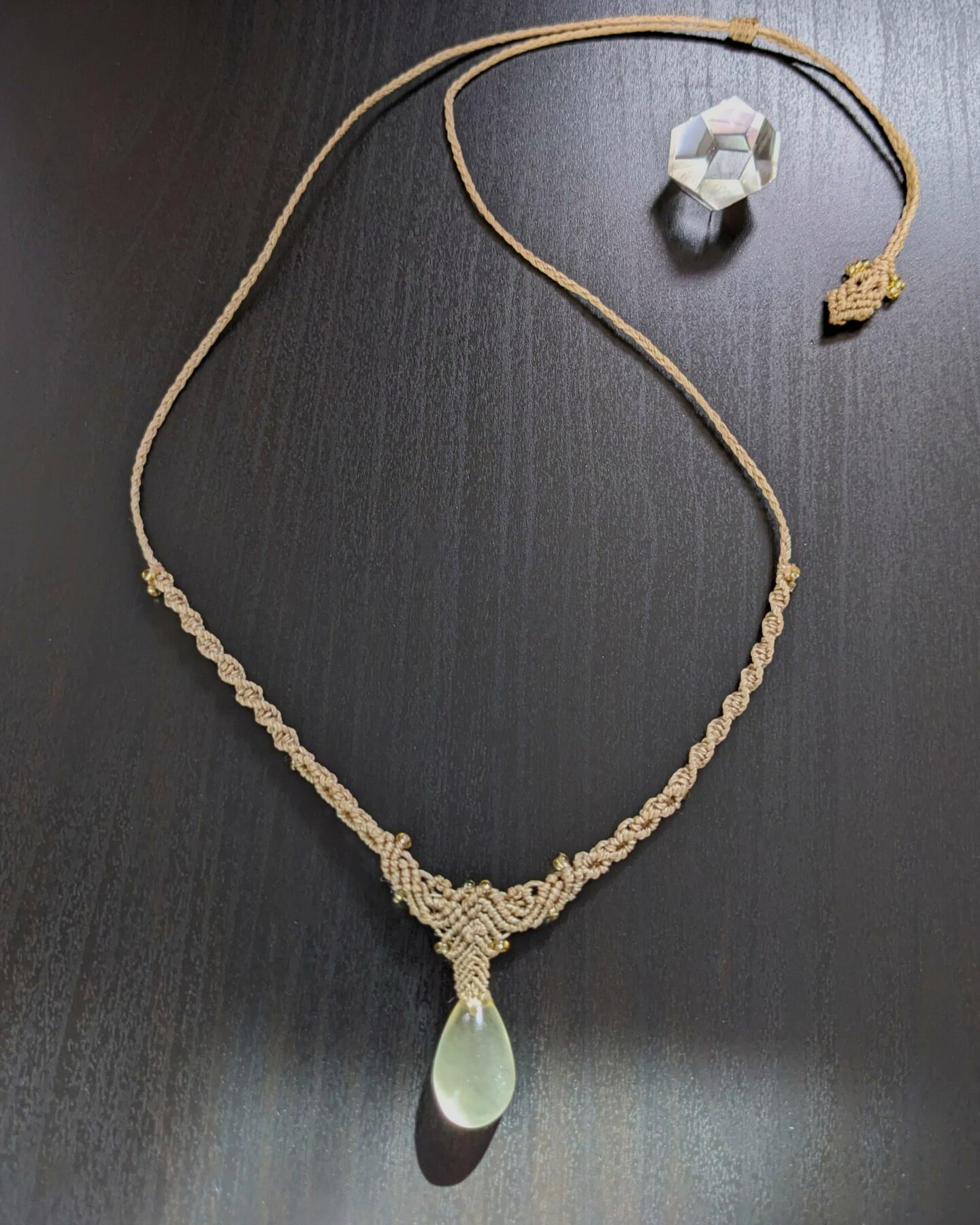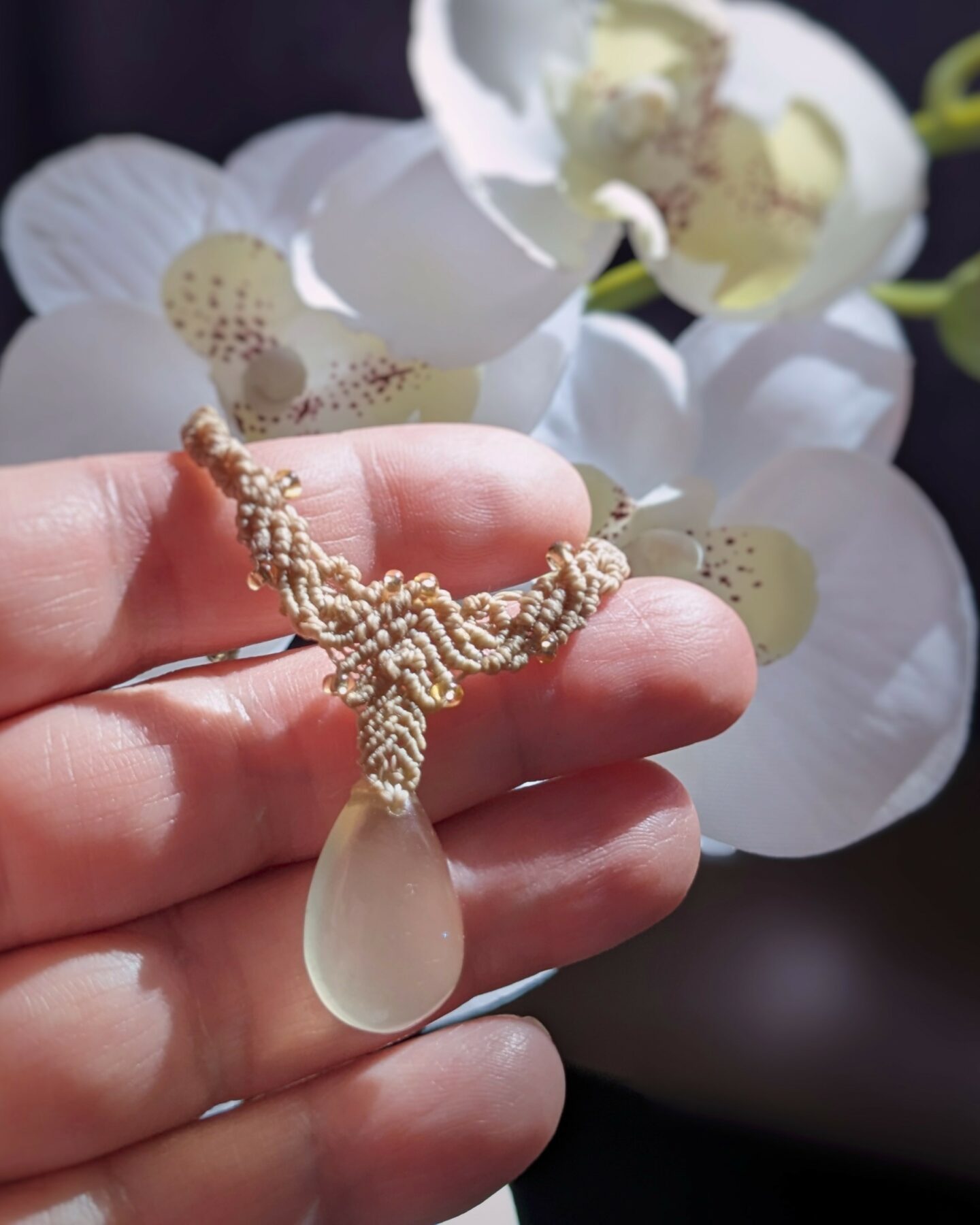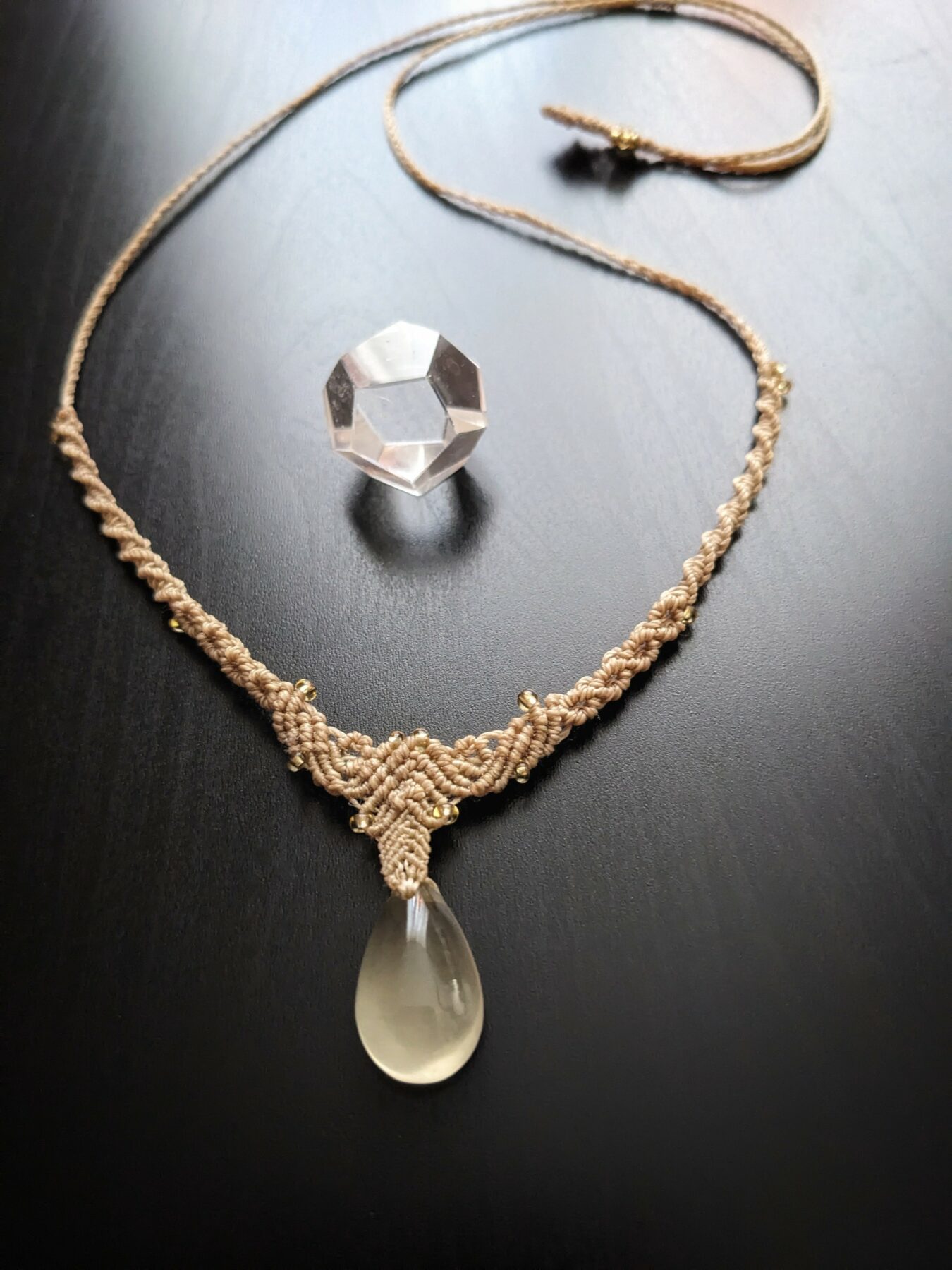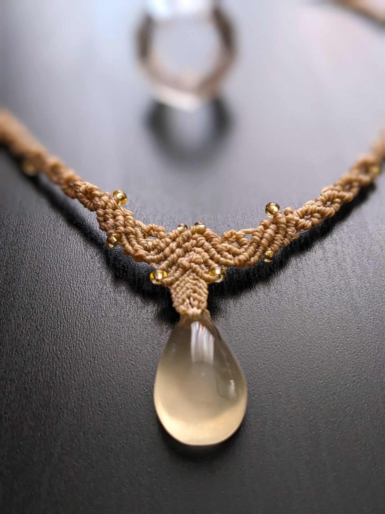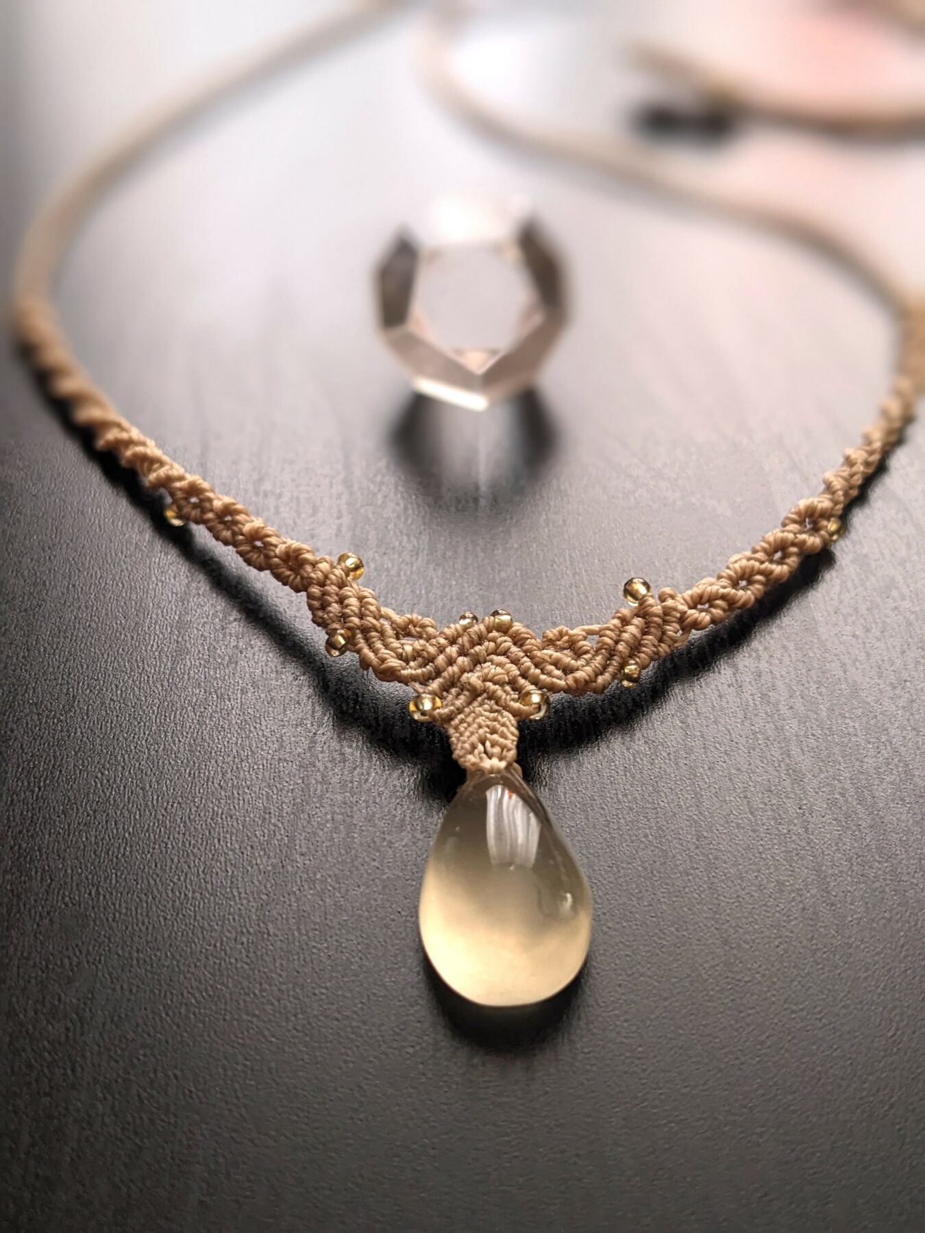 J’ai créé ce collier avec du fil Linhasita beige et un petit pendentif goutte en pierre fine naturelle quartz citron de 20 mm / 12 mm . Le quartz citron est souvent associé à l’optimisme . Avec sa jolie couleur jaune claire, il diffuse une énergie lumineuse et douce .