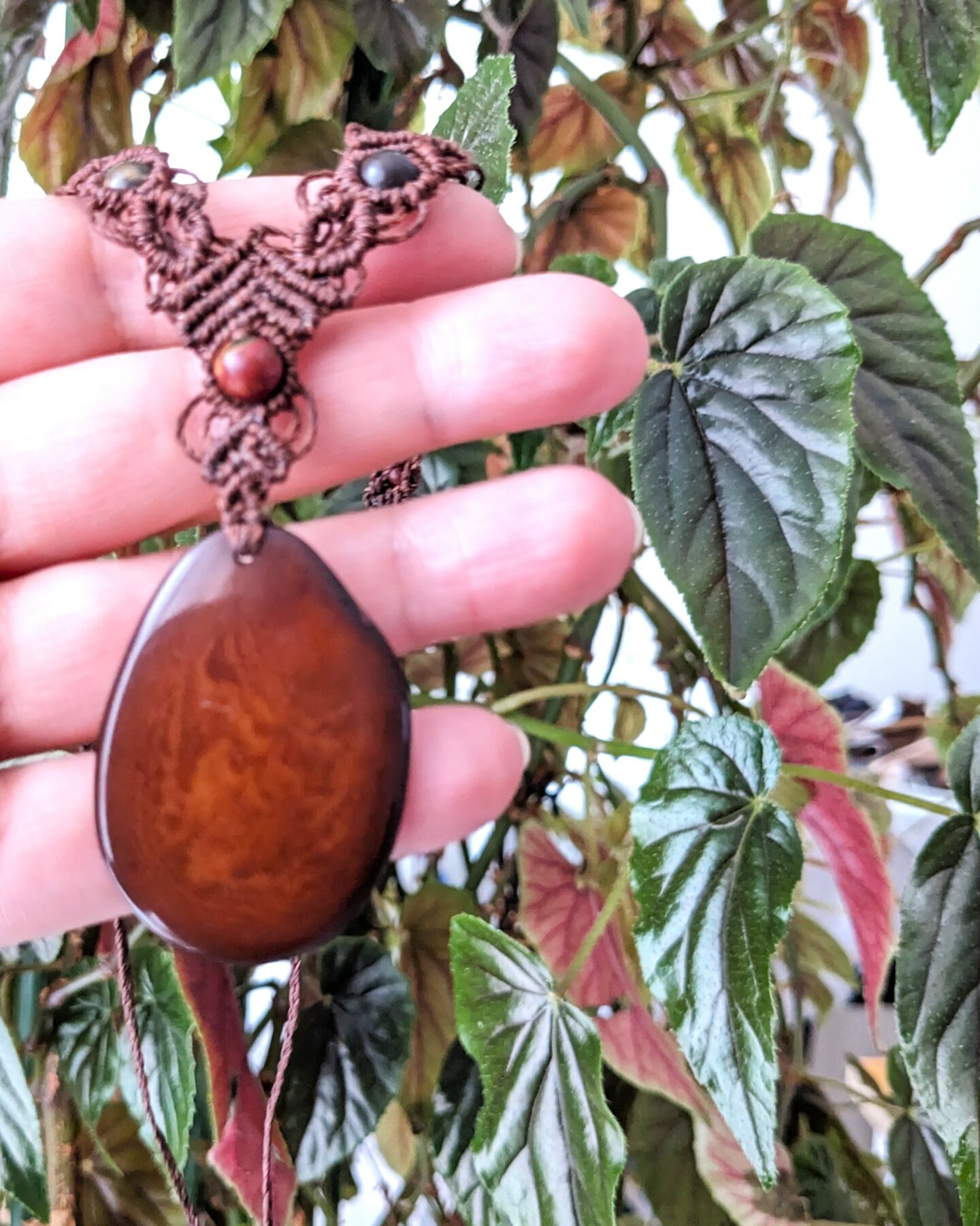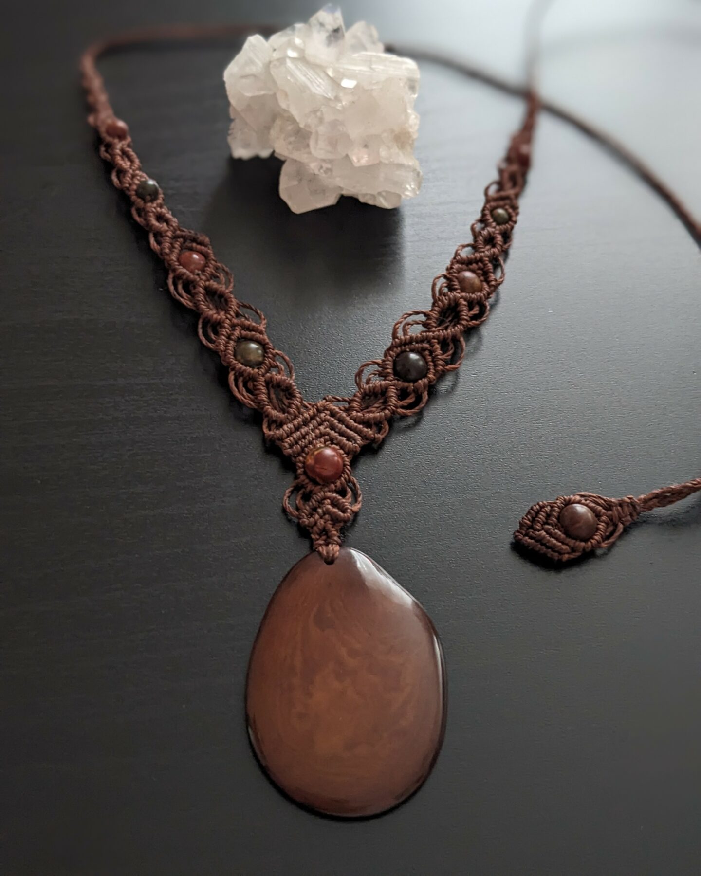 J’ai utilisé un pendentif en tagua, ivoire végétale, de 40 mm / 30 mm, dans une belle teinte caramel.