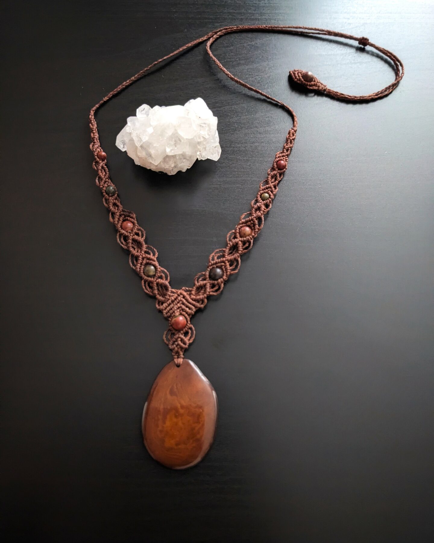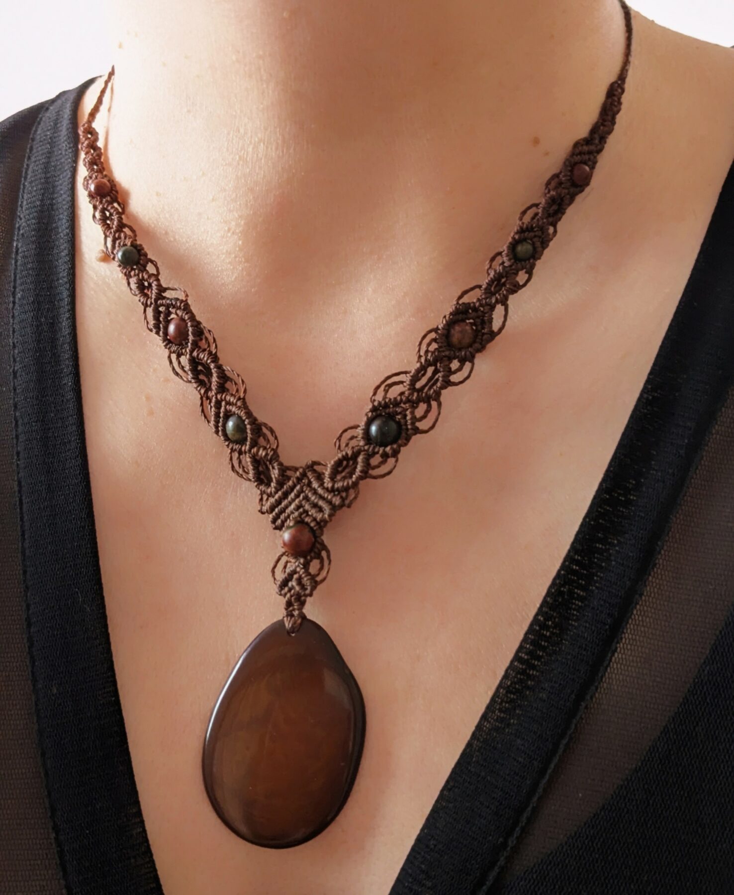 Je vous présente ce beau collier macramé que j’ai réalisé avec du fil Linhasita marron.