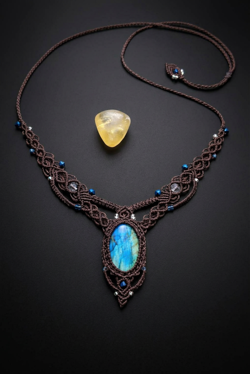 Ce magnifique collier macramé est une pièce unique que j’ai réalisée à la main avec comme toujours une attention particulière aux détails. J’ai choisi d’utiliser du fil Linhasita marron pour mettre en valeur la beauté naturelle de cette jolie labradorite bleue, créant ainsi un bijou à la fois raffiné et original.