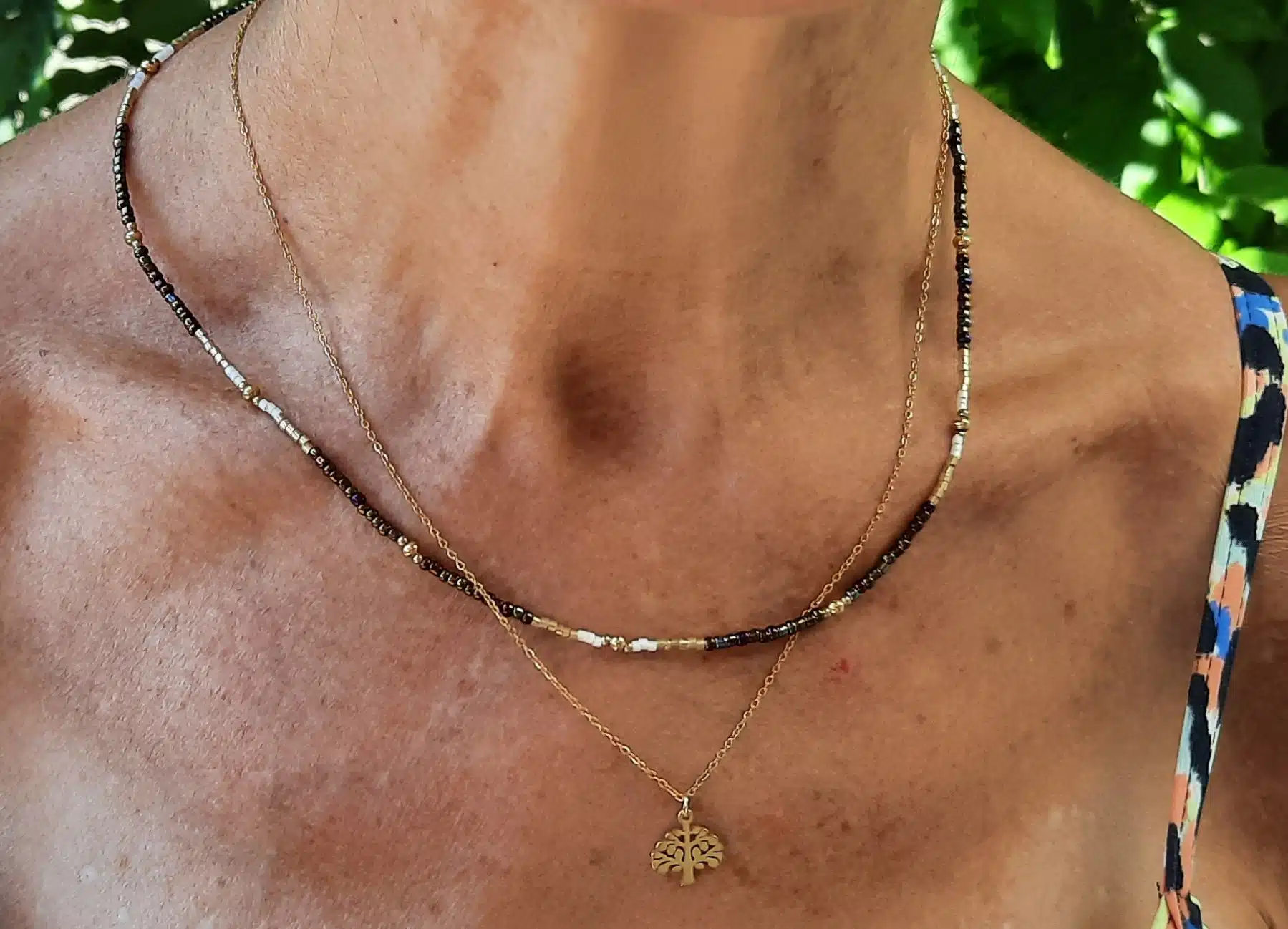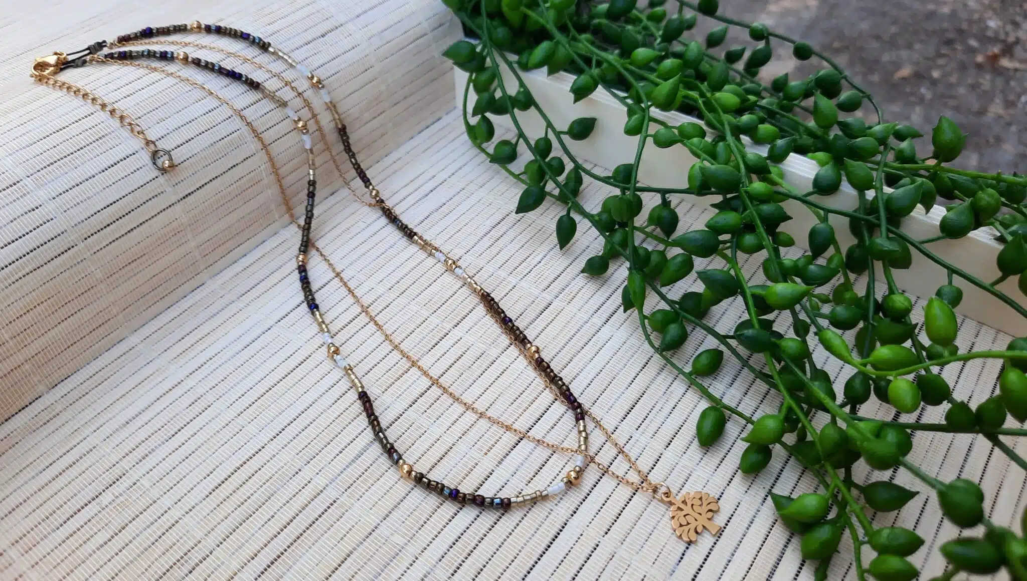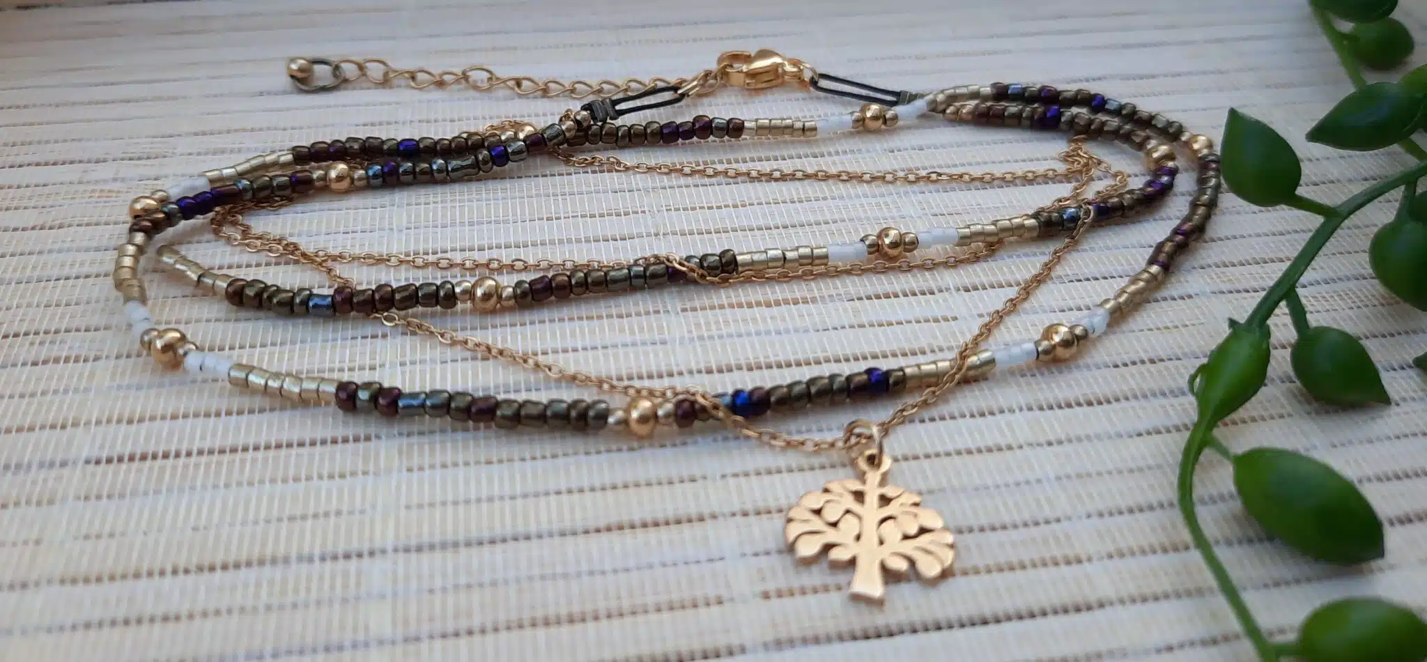 Ce collier “ras du cou” est fait de deux rangs, une enfilade de perles “Miyuki” et de petites perles rondes en acier inoxydable doré, sur un fil de nylon 0,5 m (très solide) et d’une chaîne fine avec son pendentif “Arbre de vie” en acier inoxydable doré.