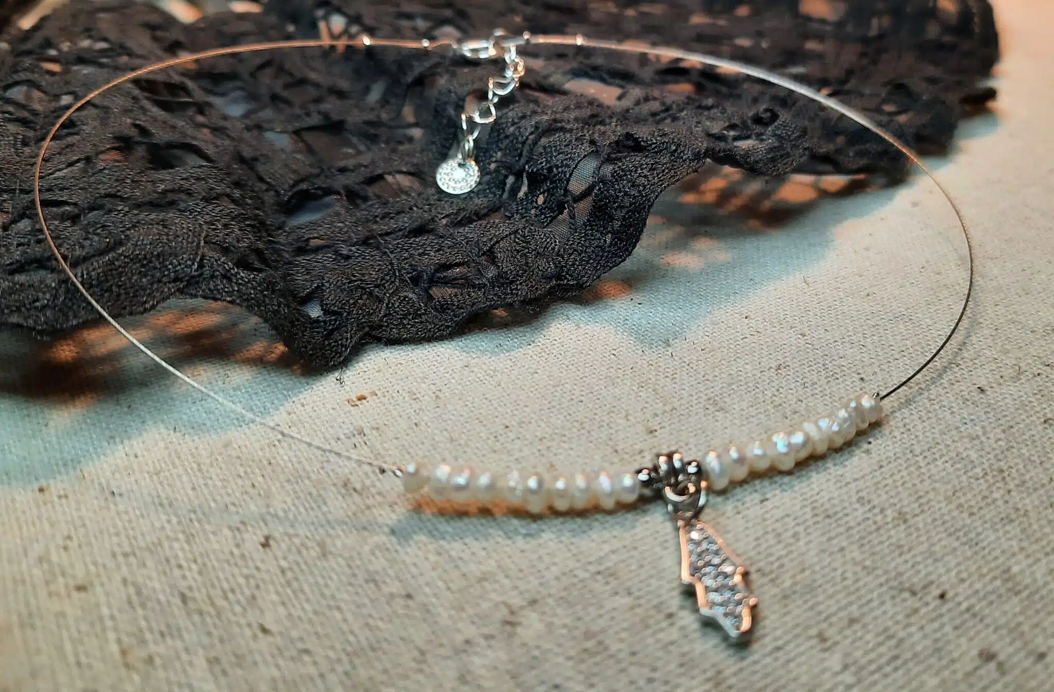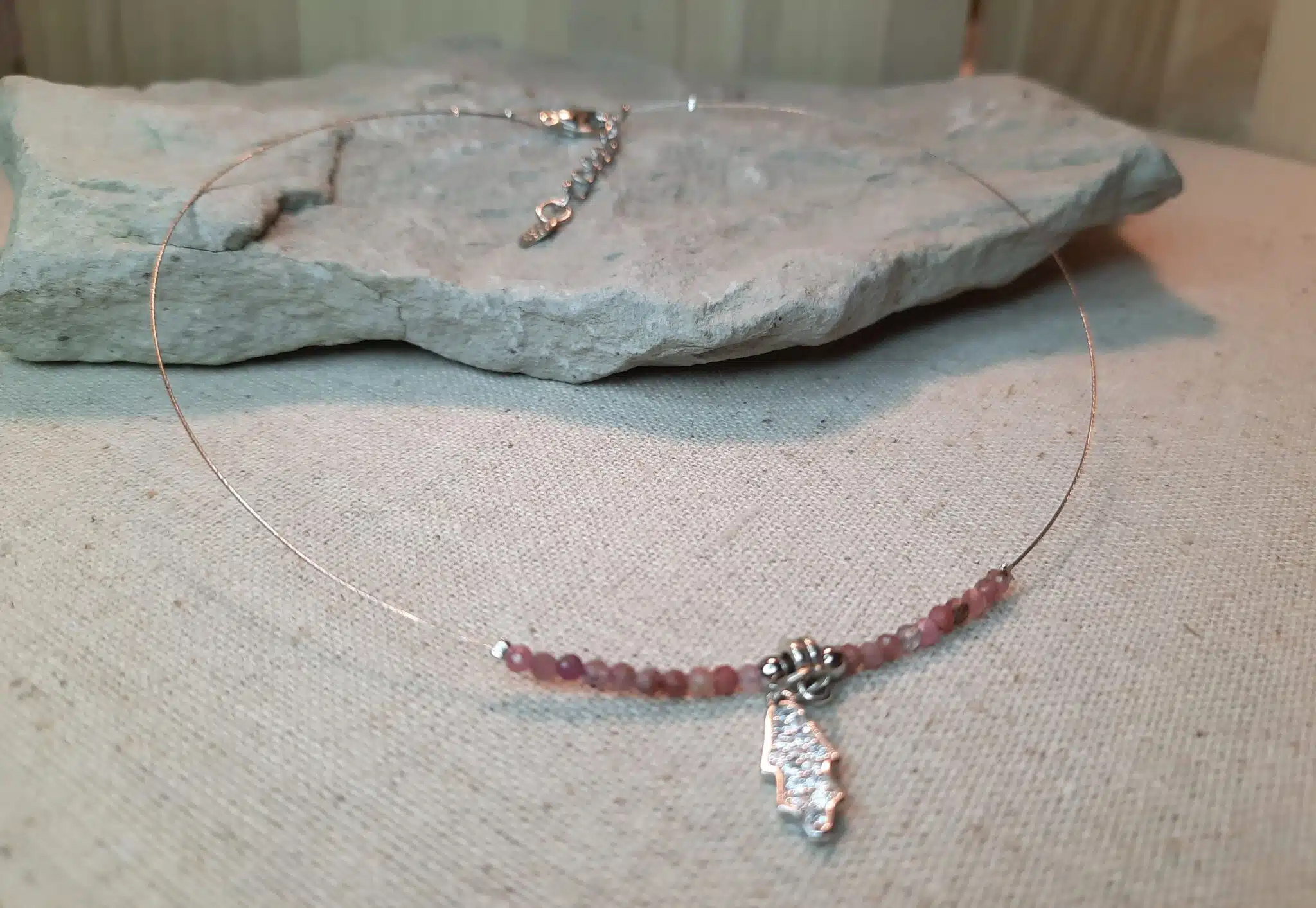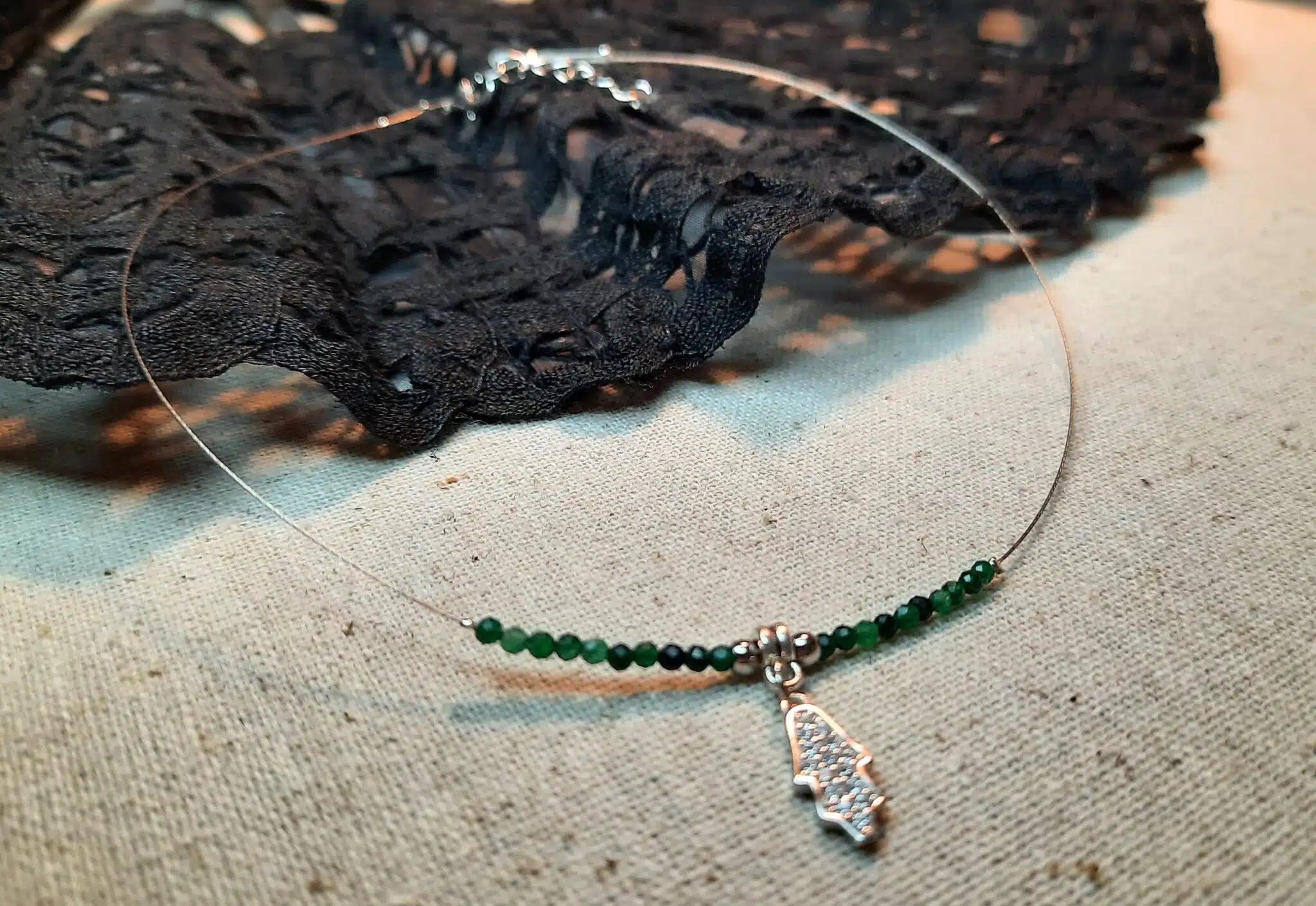 Perles de pierres naturelles sur fil câble acier et pendentif “Main de Fatma” Zirconium et argent 925