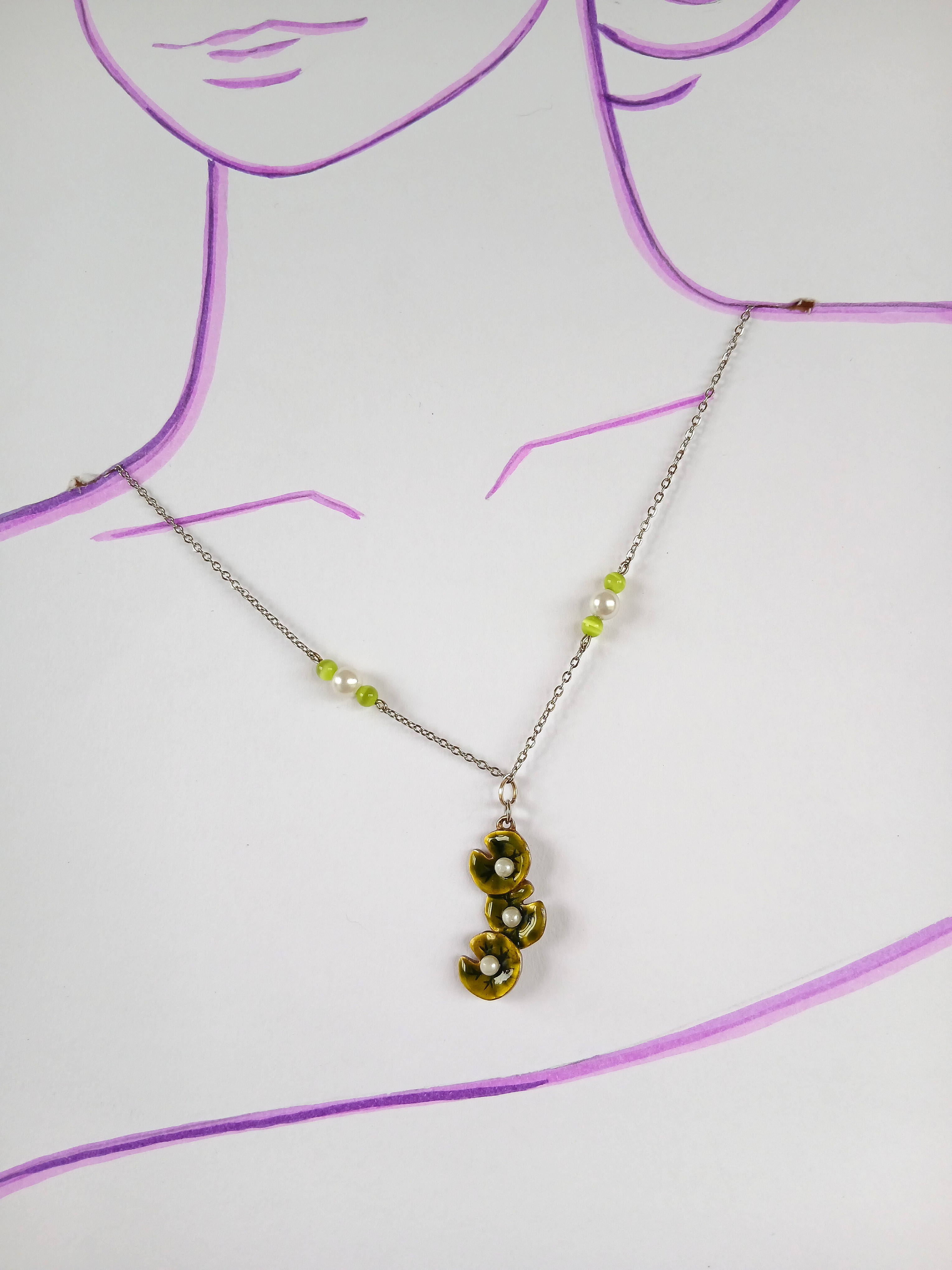 Fin et délicat, ce collier argenté séduit par l’harmonie de ses couleurs inspirée de la nature et son pendentif figurant la superposition de trois feuilles de nénuphars terminées par une perle blanc nacré. Son design fin et aérien apporte une touche romantique et singulière ; léger et facile à porter, il sublimera aussi bien une tenue du quotidien qu’une tenue plus habillé.