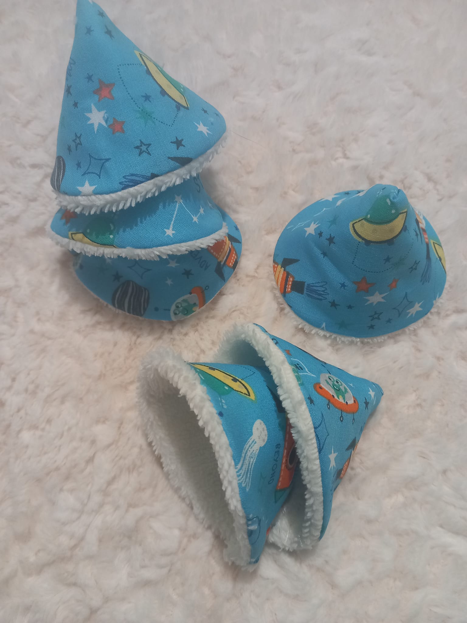 lot de 6 cones pare pipi en coton et éponge motif fusée colorie bleu et blanc lavable en machine 40°