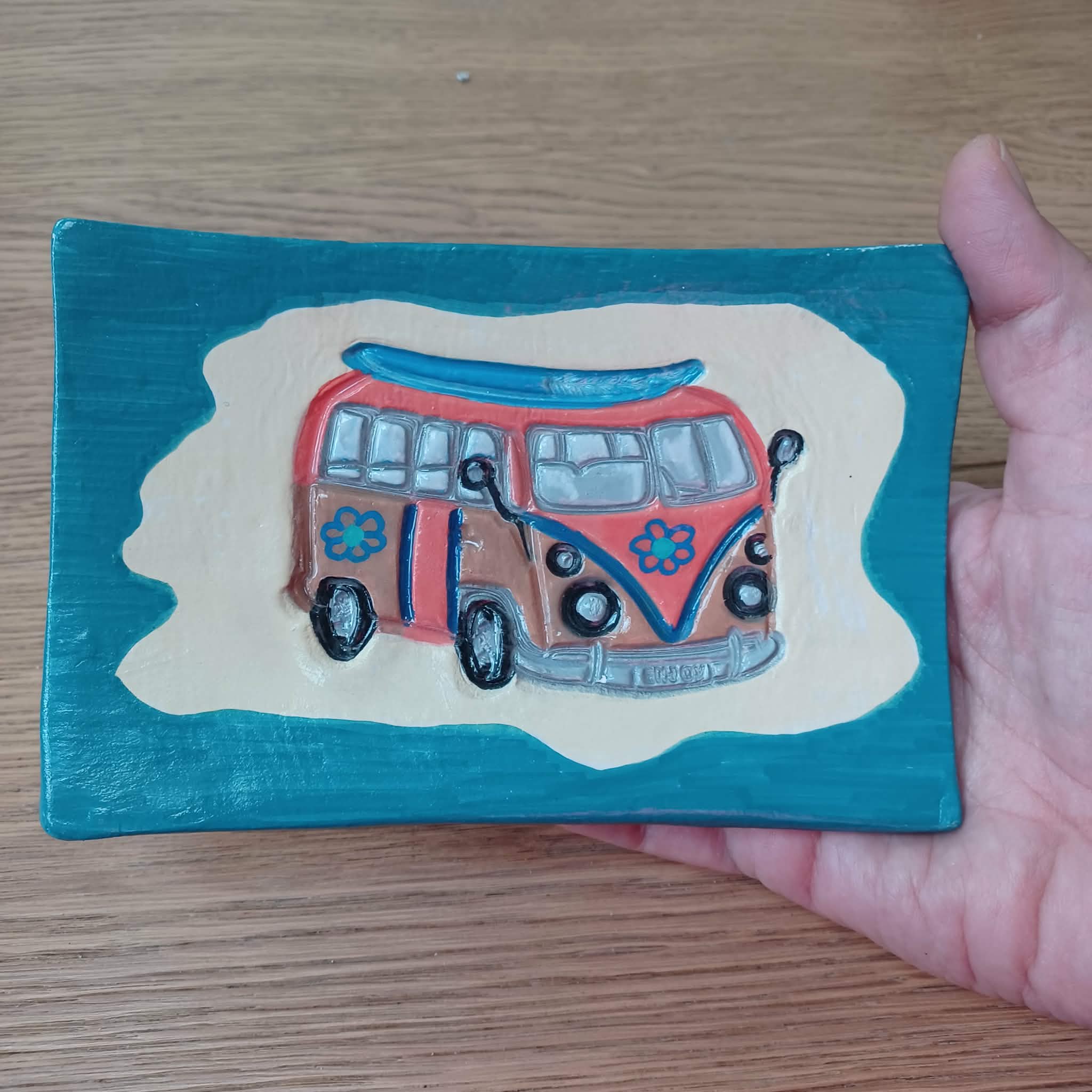 Une jolie coupelle en argile auto durcissante, peinte à la main et résinée, motif van. Idéale pour ds bijoux ou un trousseau de clés.