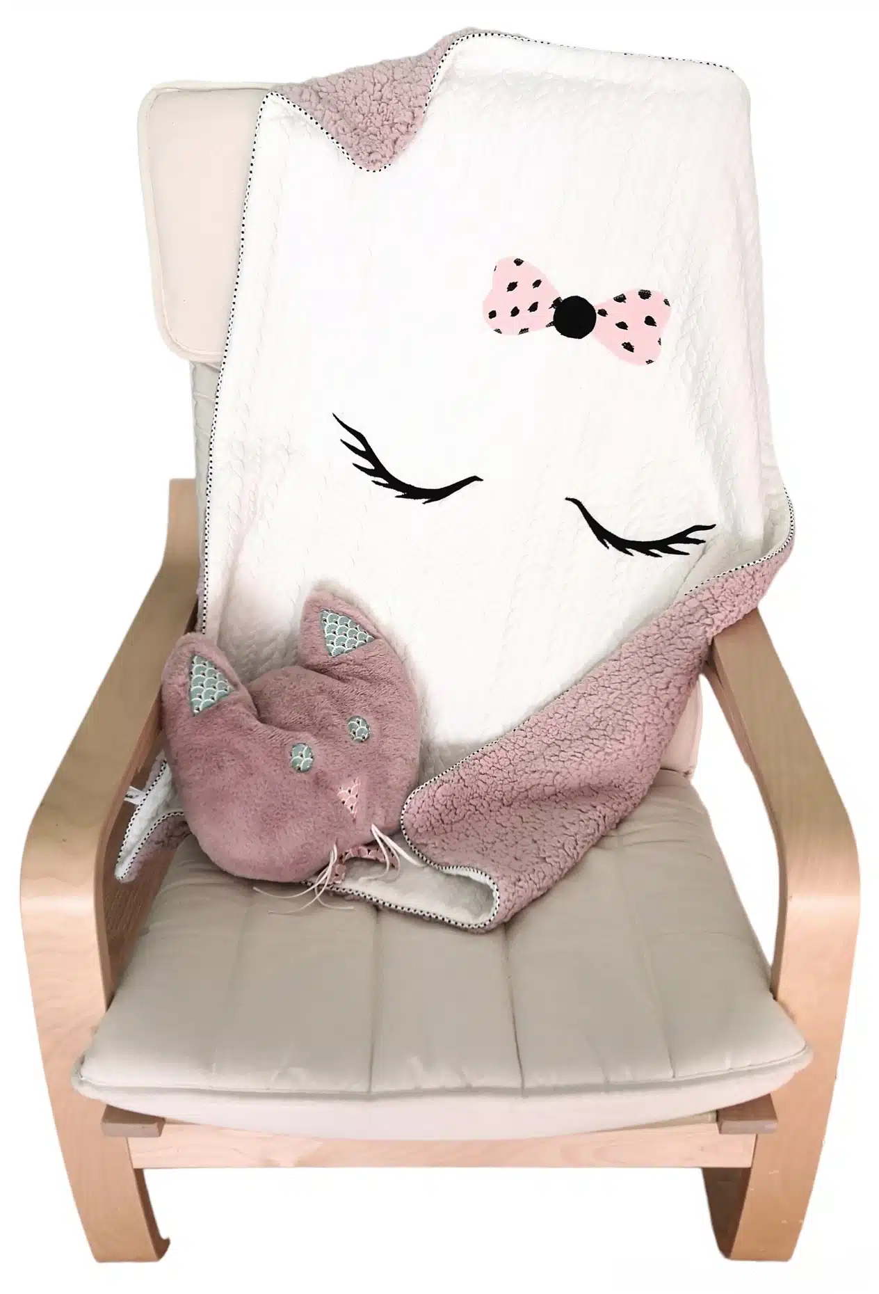 Douillette avec sa face en sherpa très doux. Design unique avec ses yeux et son nœud brodé, elle est agrémenté d’un passepoil à pois.