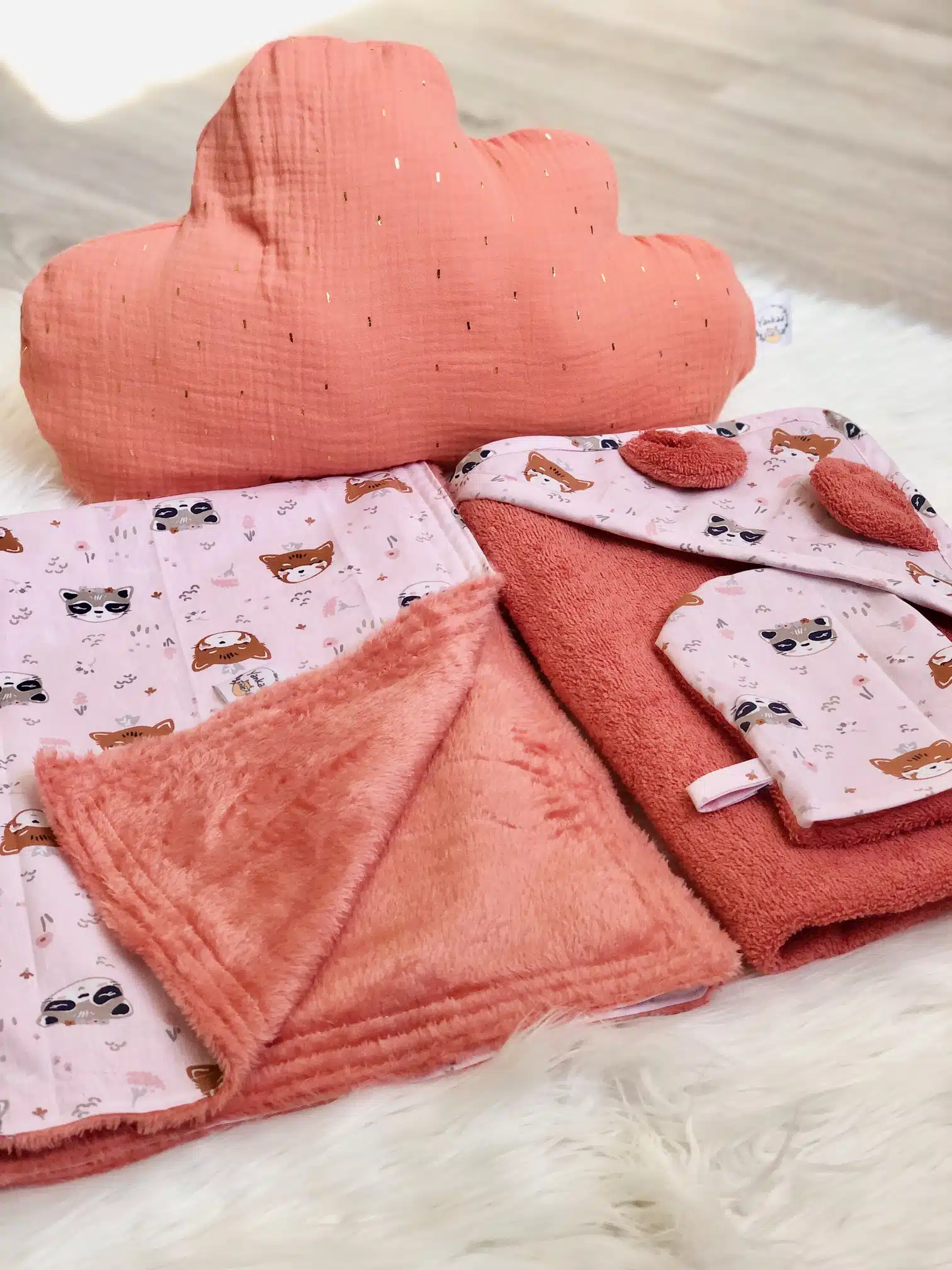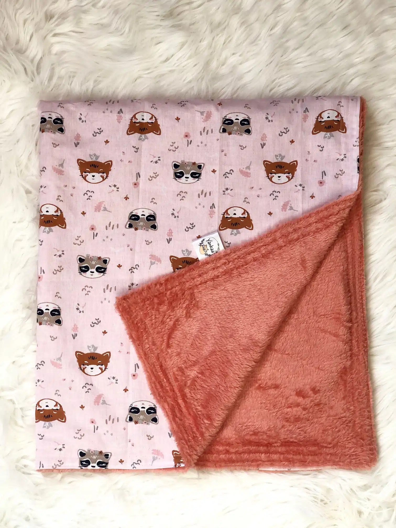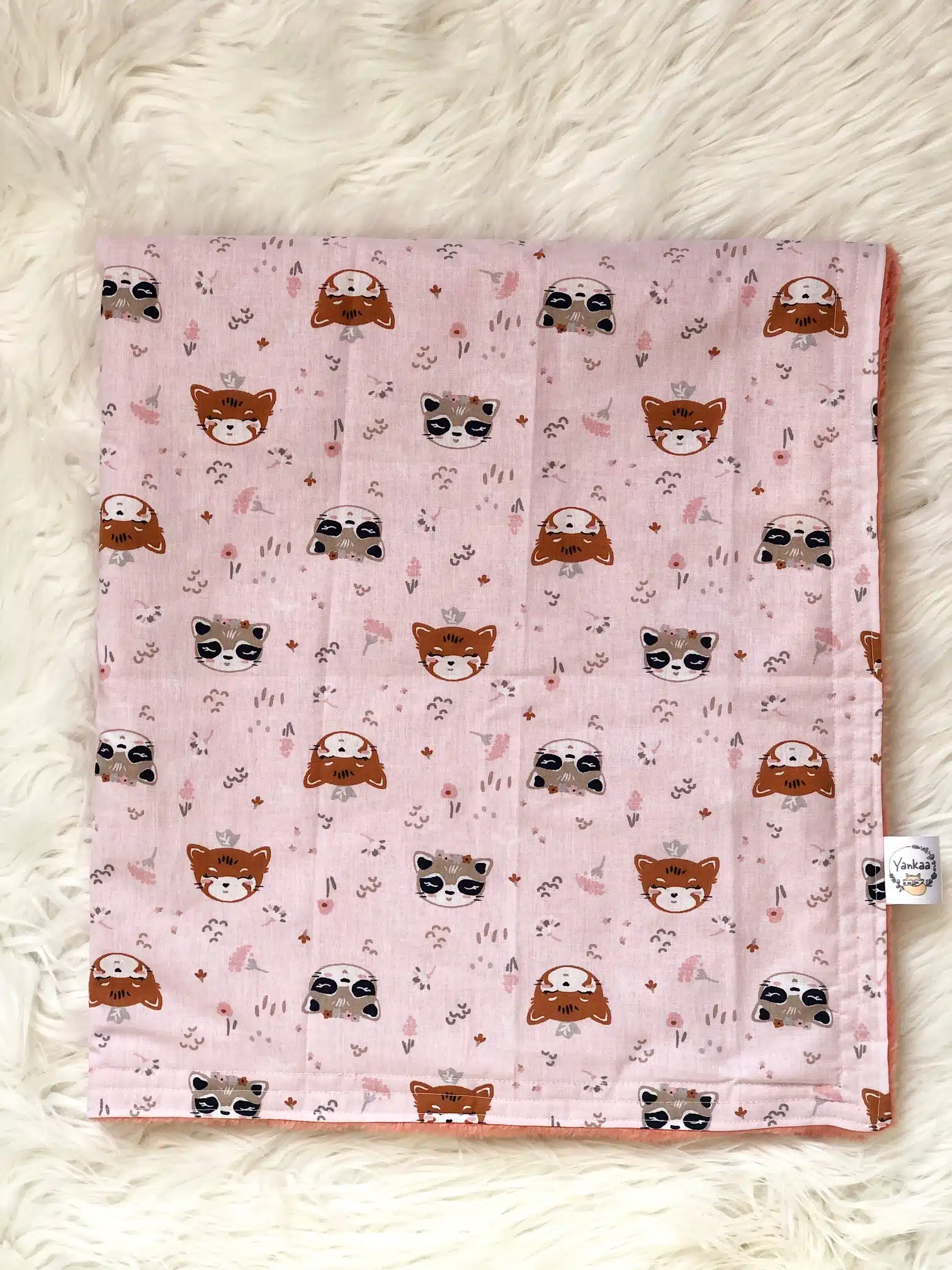 Couverture pour bébé en coton imprimé raton laveur et panda roux OEKOTEX puis en minky (polyesther) couleur corail.