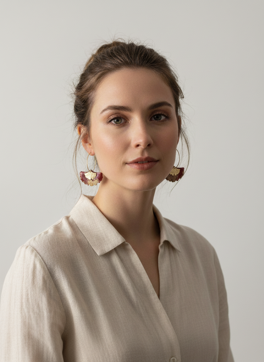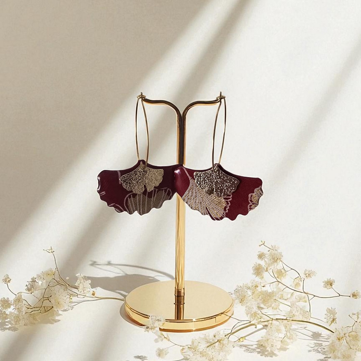 Ces boucles d’oreilles uniques et faites main sont réalisées avec du papier indien rouge décoré de motifs de feuilles de ginkgo doré, résiné et verni pour un fini brillant et durable. Chaque pièce est sublimée par un sequins en forme de feuille de ginkgo, montée sur une créole de 30 mm, pour un style léger, graphique et élégant.