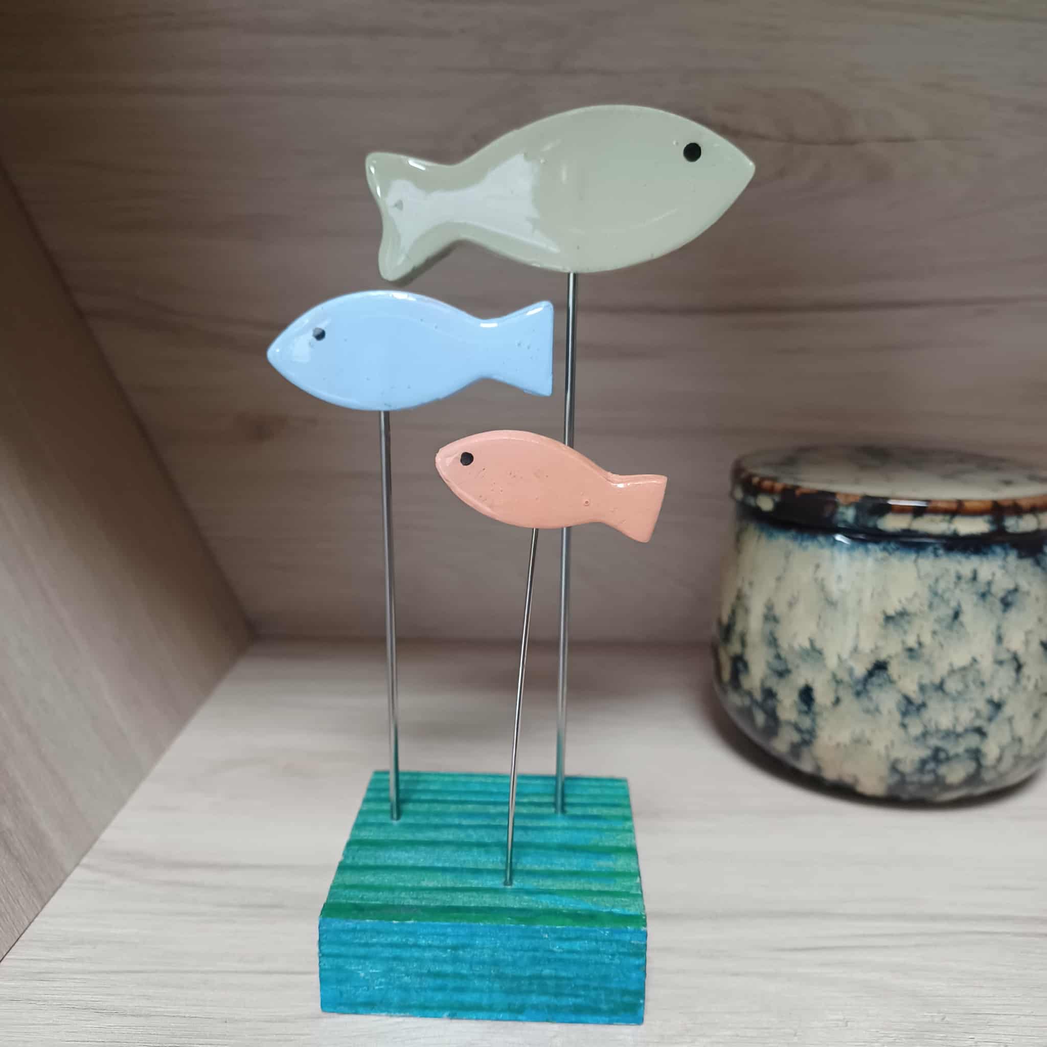 Un bibelot sur le thème marin, jolie petite déco de poissons en argile auto durcissante et vernie, montés sur tiges métal et socle en bois.