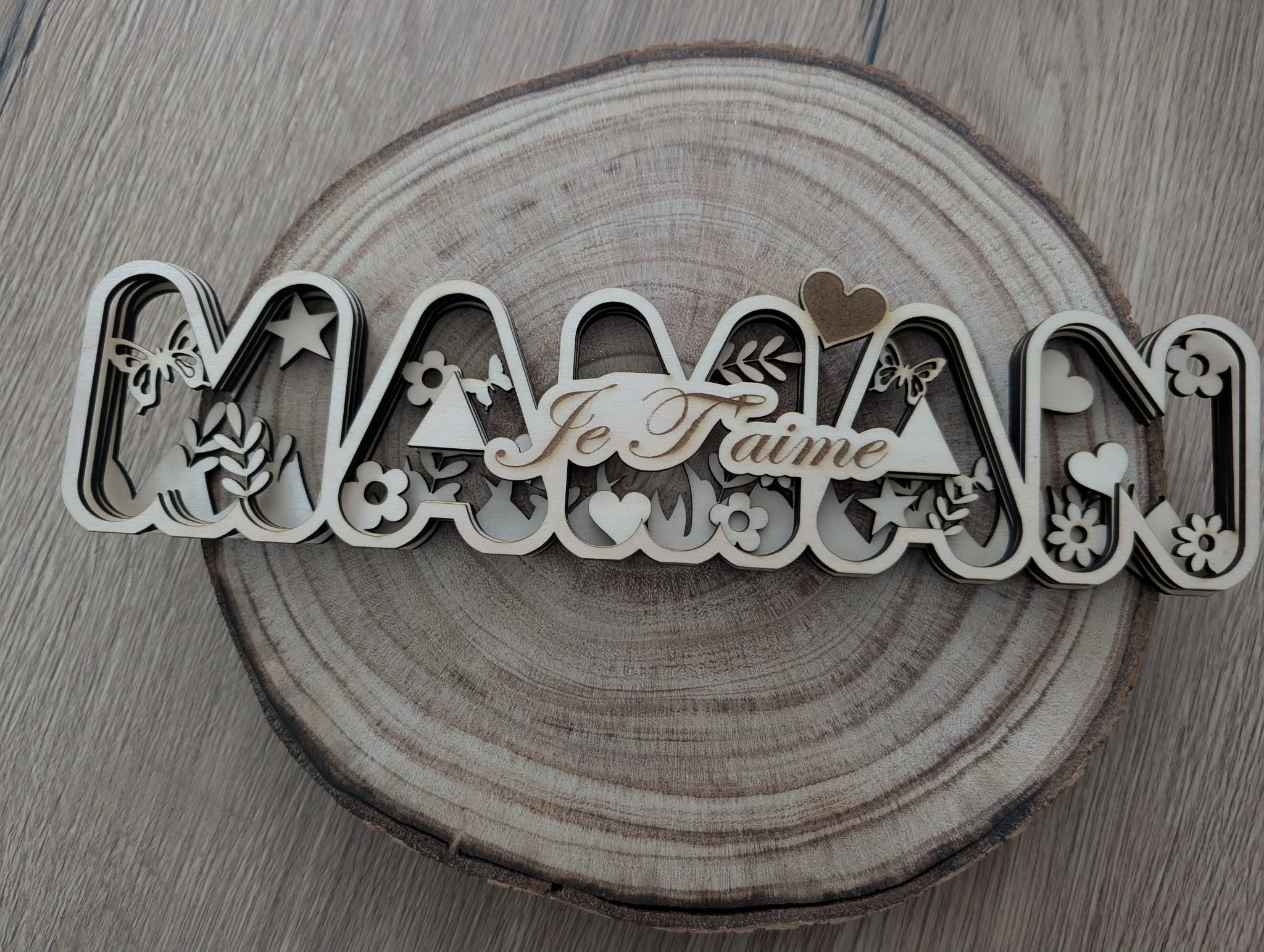 Offrez un cadeau plein de tendresse avec cette décoration “Maman – Je t’aime” en bois, soigneusement découpée et gravée au laser.