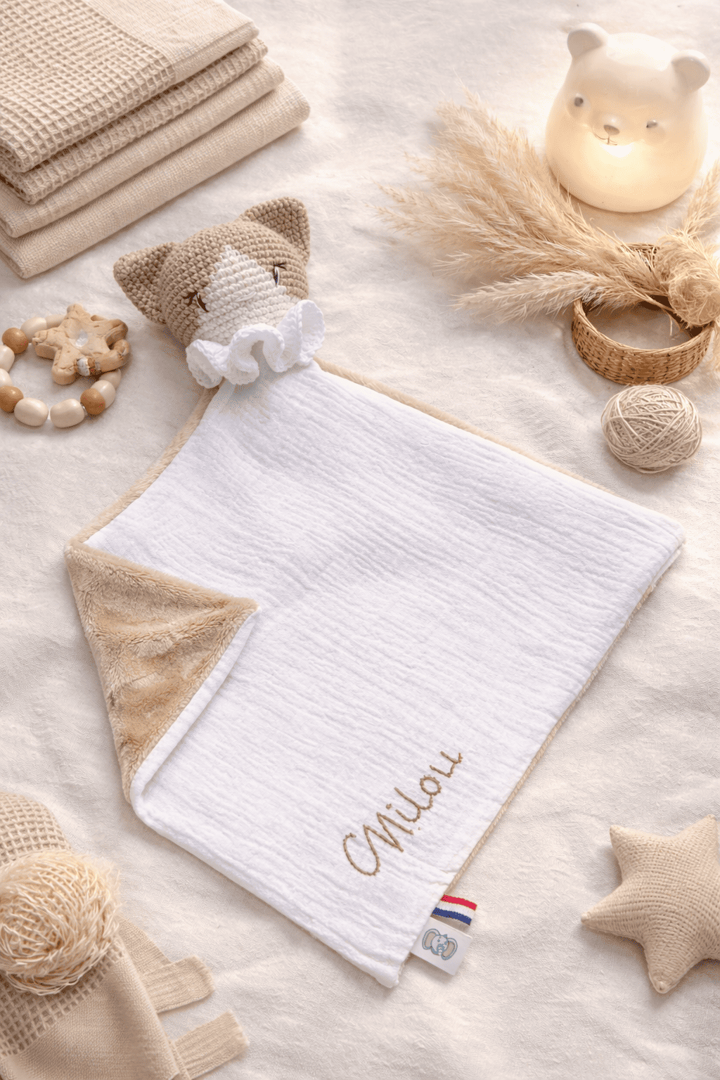 Vous avez la possibilité de broder à la main / floquer un prénom ou un petit mot doux. Le prénom sera apposé en bas du doudou.